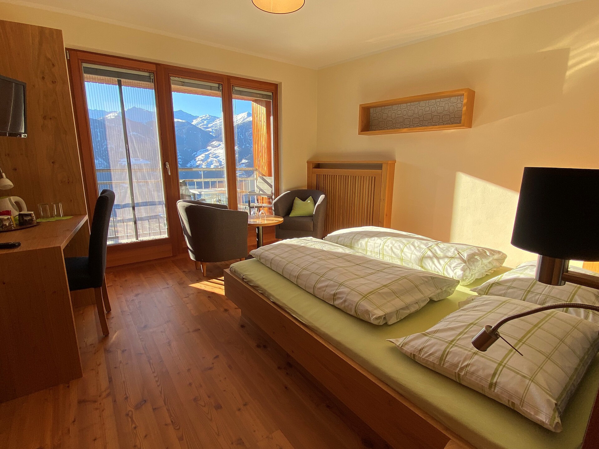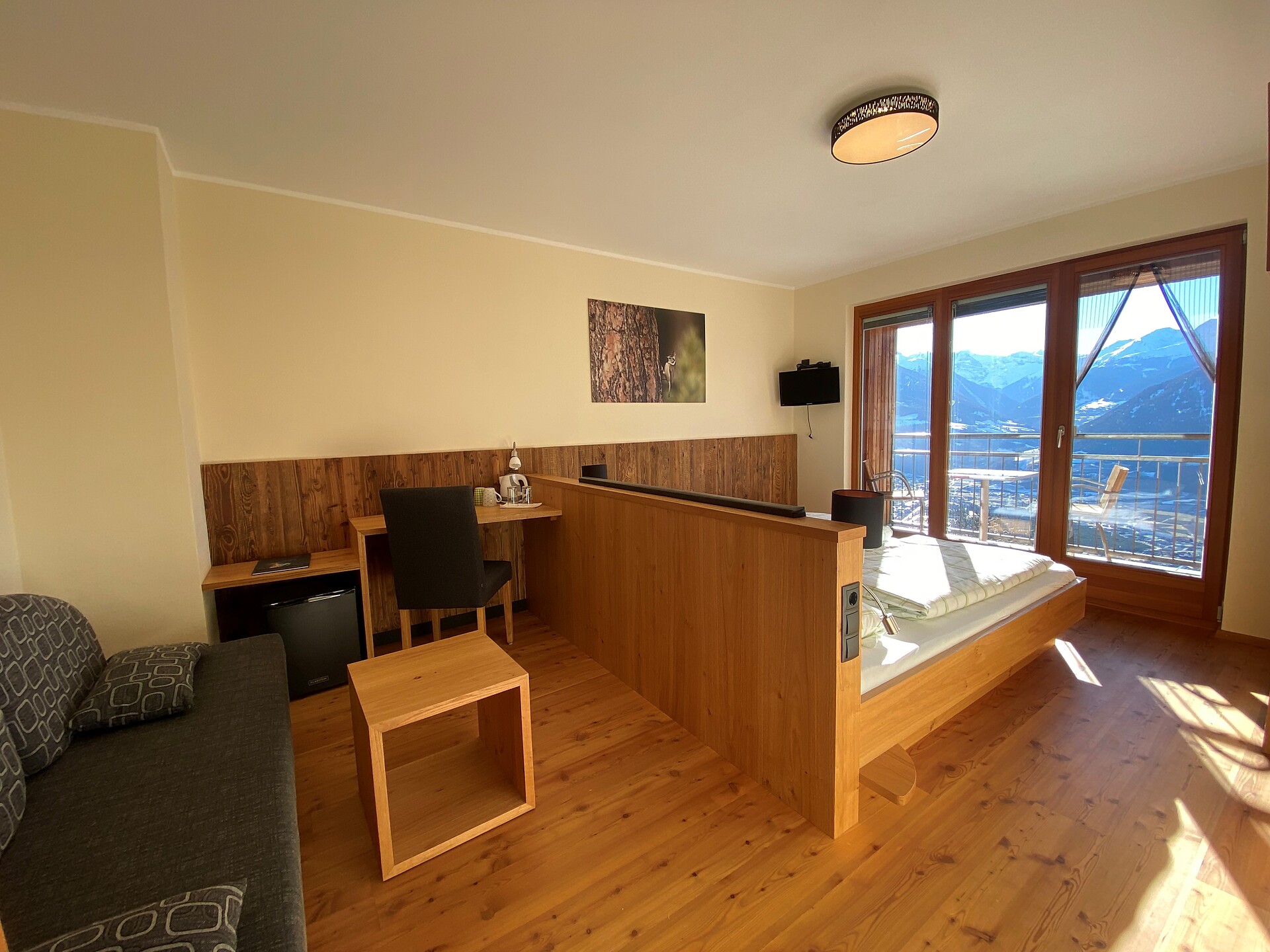 Mit Blick auf die Tschengelser Hochwand fühlst Du Dich in diesem Zimmer besonders geborgen und kuschelst Dich zum Lesen auf die Coach. Vom Bett aus kannst Du die Berge und das Sternenzelt über Dir sehen. Wenn Du magst machst Du Dir einen Morgentee und setzt Dich damit auf Deinen eigenen Balkon.