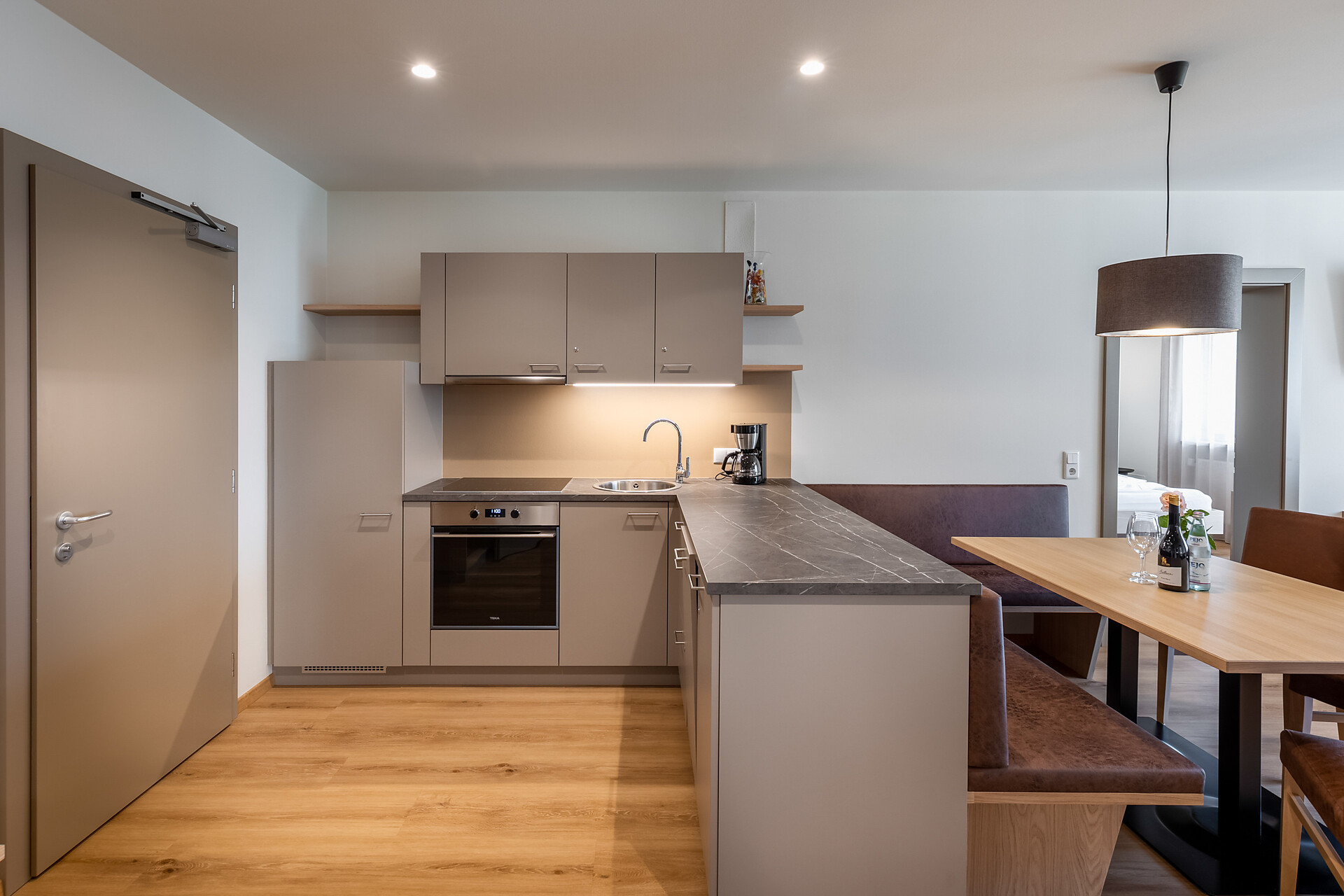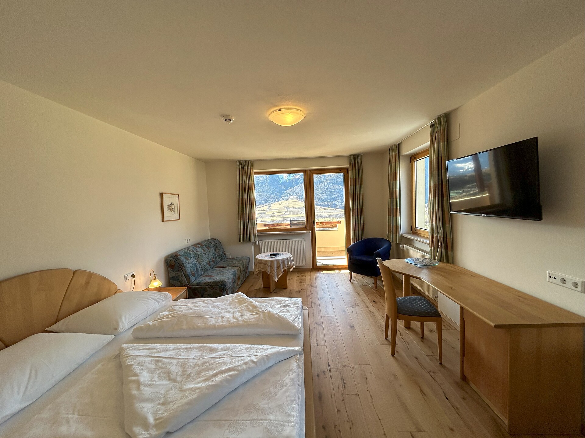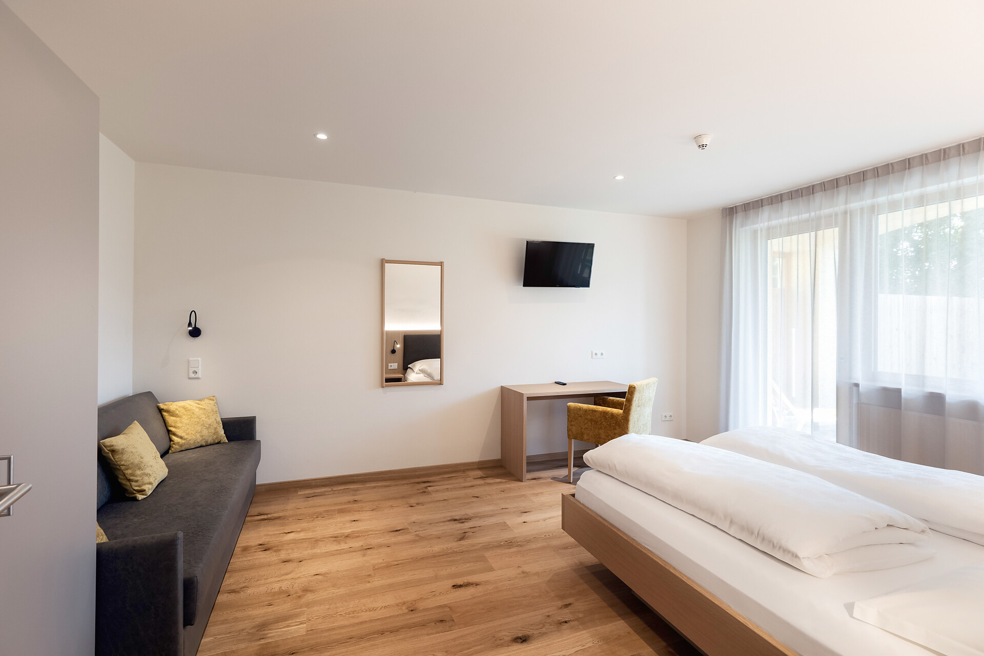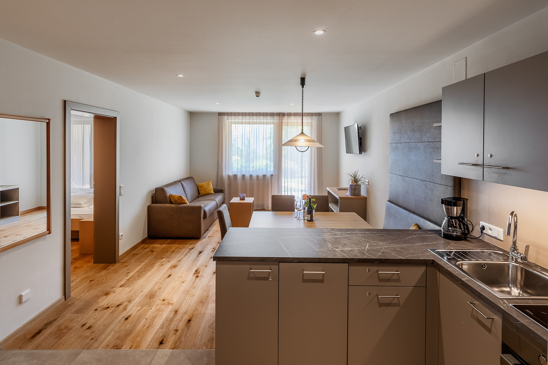 approx. 55 m2 for 2-5 persons – Spacious apartment on the ground floor with panoramic terrace and private garden | Parquet floor | separate bedroom with double bed | fully equipped kitchen | Living area with sofa bed | Bathroom with double sink, shower, WC and bidet | Shower gel & soap | Towels & bed linen | Flat TV | Minibar | W-LAN | Safe