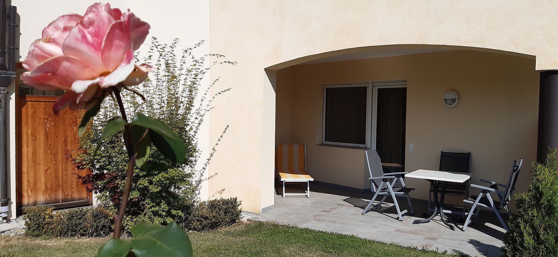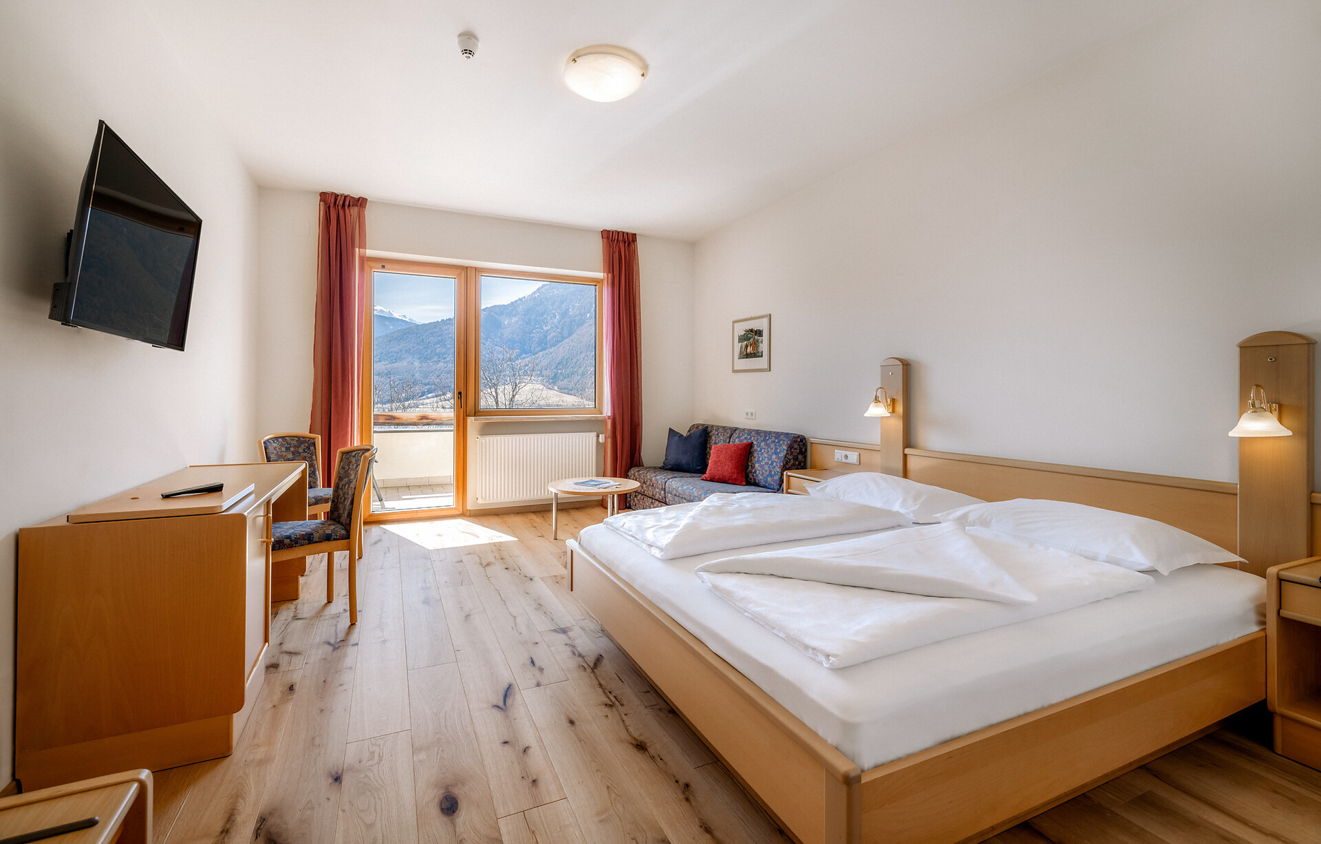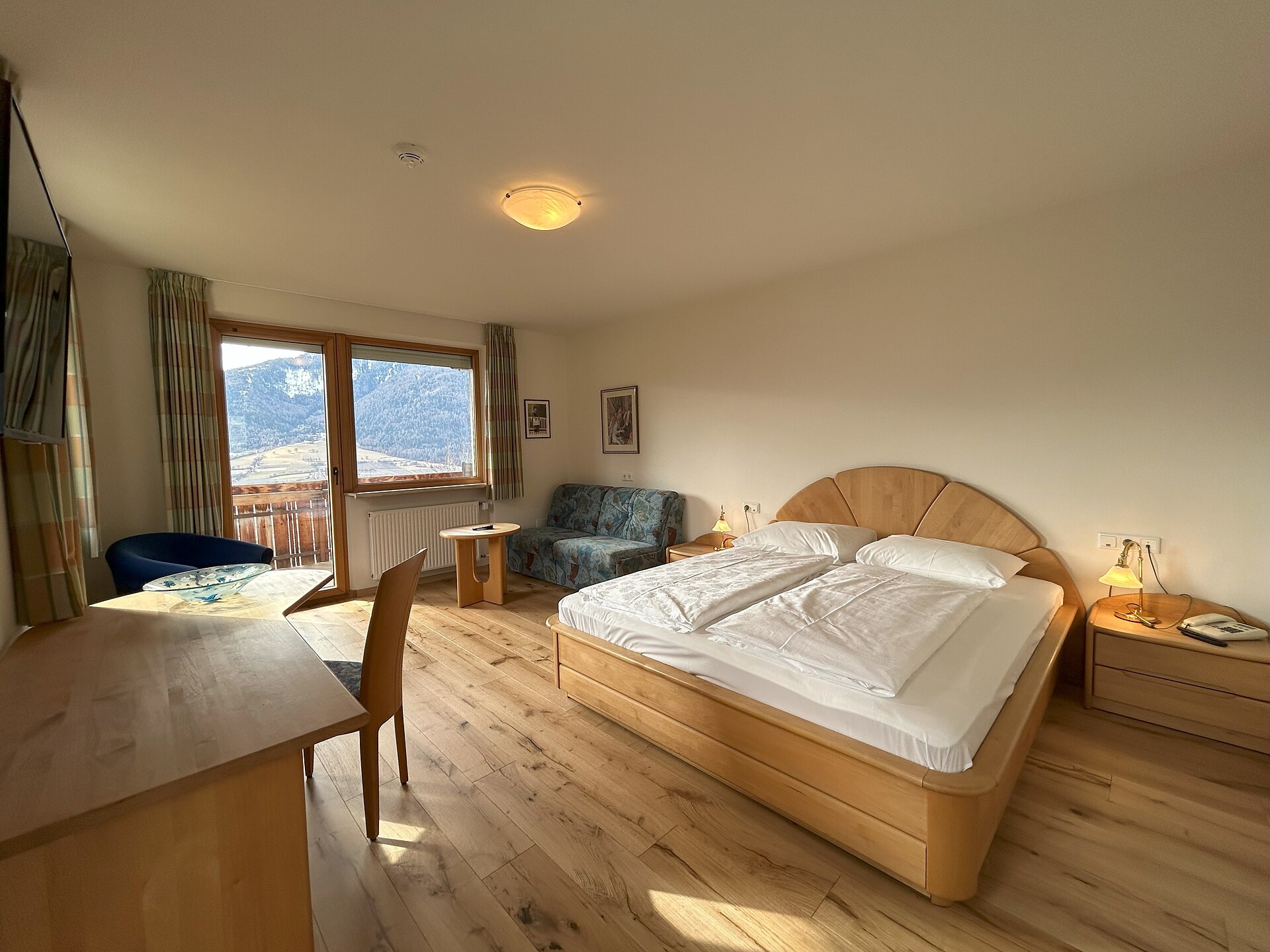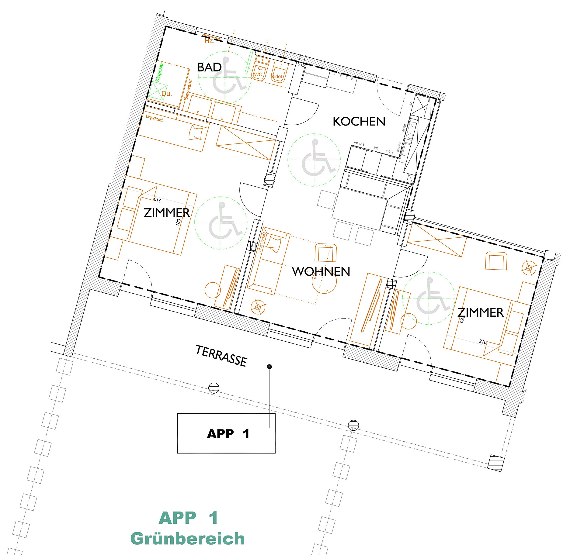 approx. 55 m2 for 2-5 persons – Spacious apartment on the ground floor with panoramic terrace and private garden | Parquet floor | separate bedroom with double bed | fully equipped kitchen | Living area with sofa bed | Bathroom with double sink, shower, WC and bidet | Shower gel & soap | Towels & bed linen | Flat TV | Minibar | W-LAN | Safe