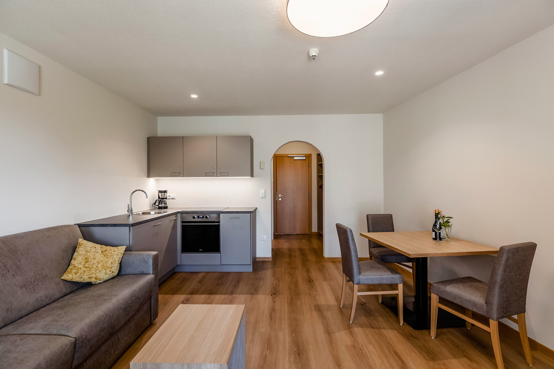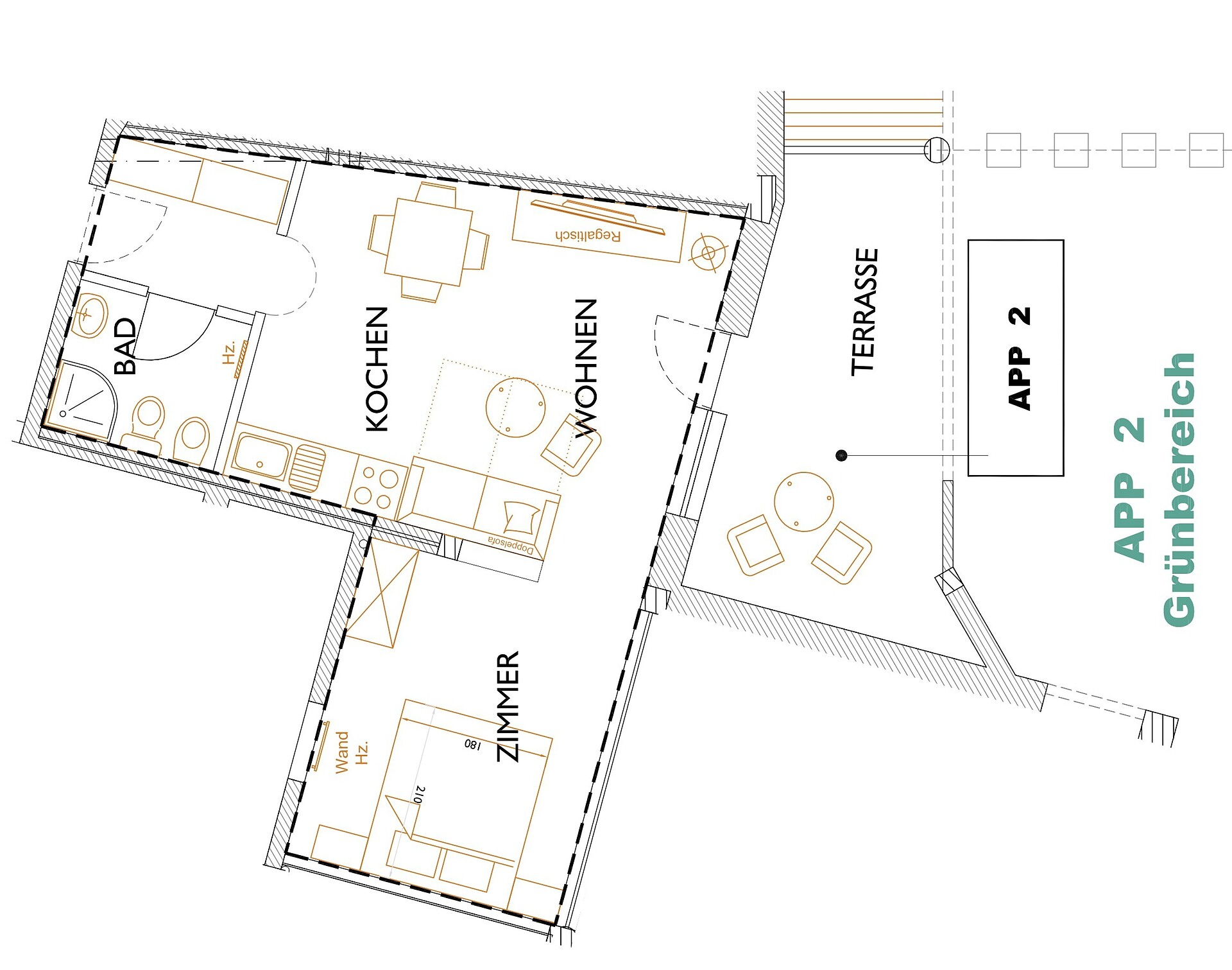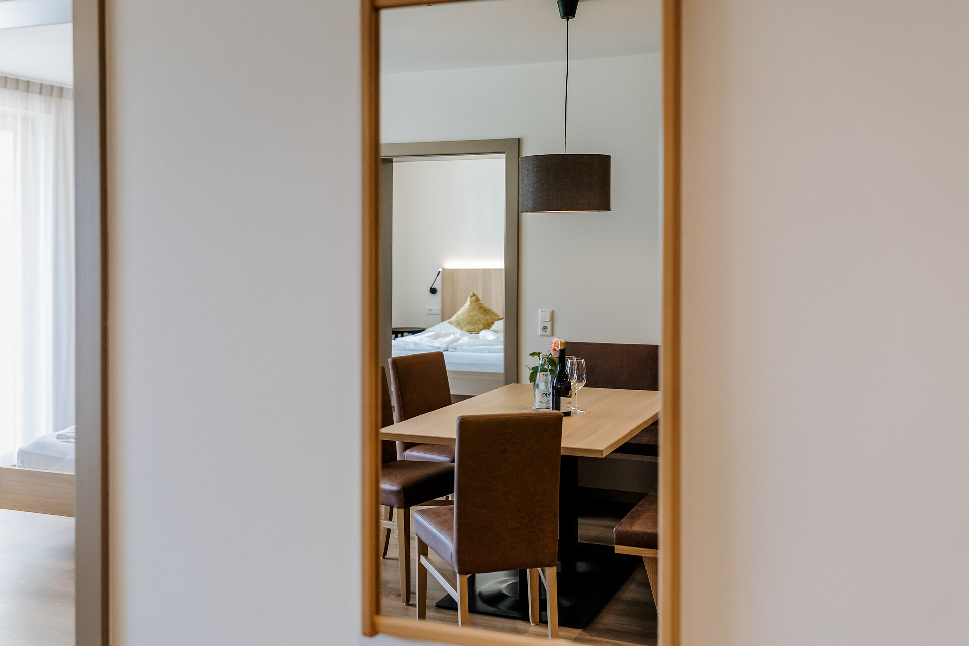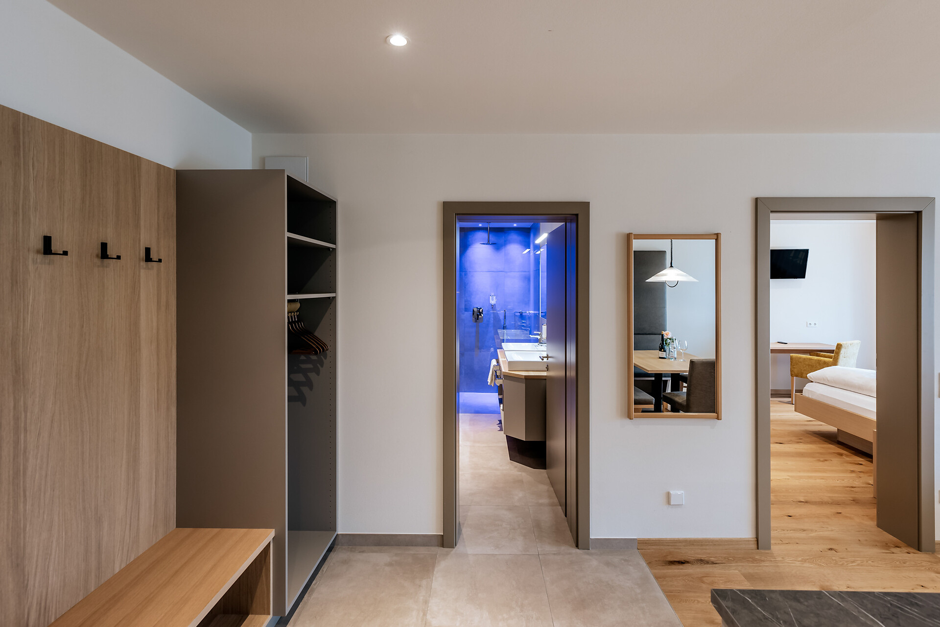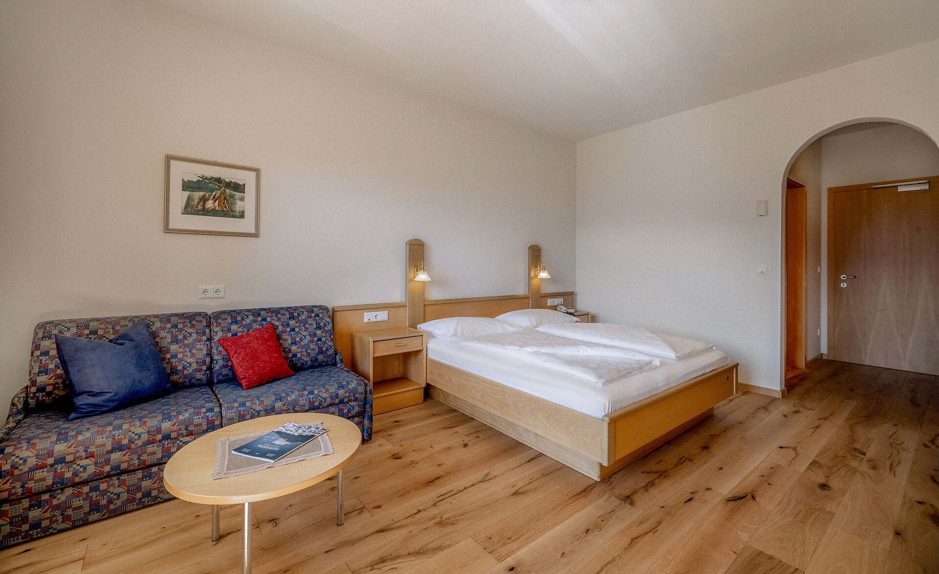approx. 55 m2 for 2-5 persons – Spacious apartment on the ground floor with panoramic terrace and private garden | Parquet floor | separate bedroom with double bed | fully equipped kitchen | Living area with sofa bed | Bathroom with double sink, shower, WC and bidet | Shower gel & soap | Towels & bed linen | Flat TV | Minibar | W-LAN | Safe