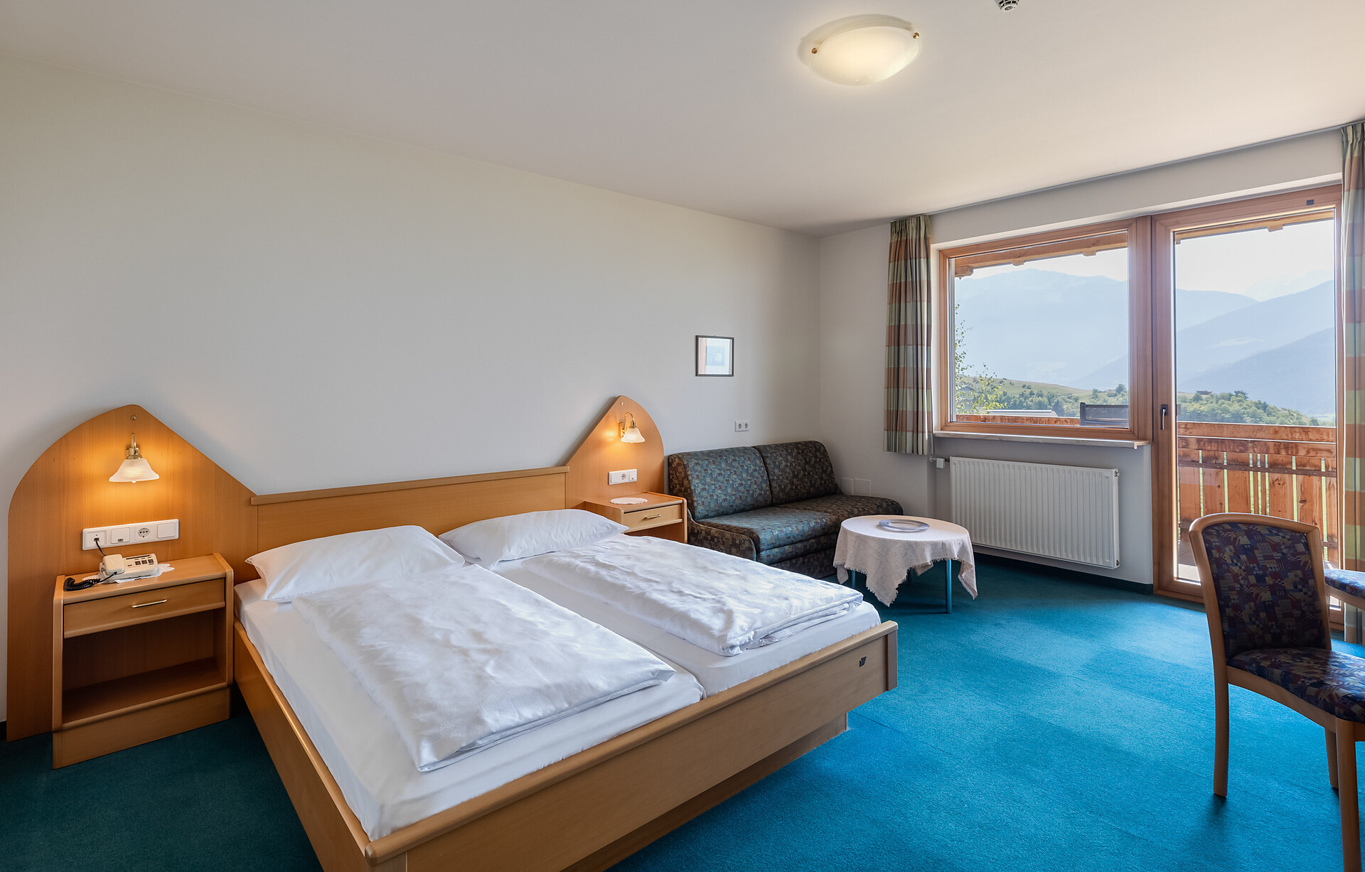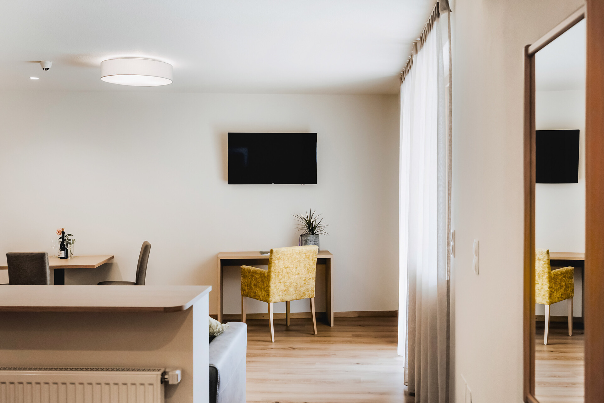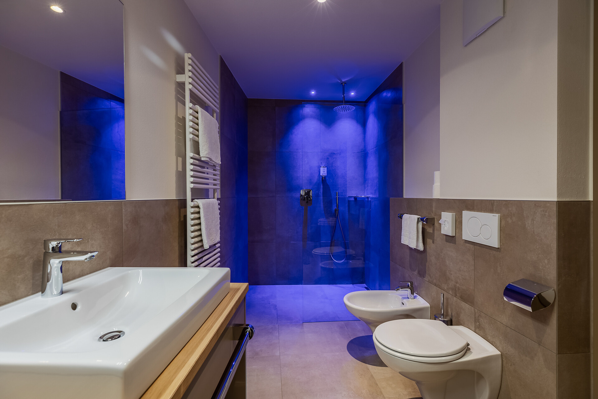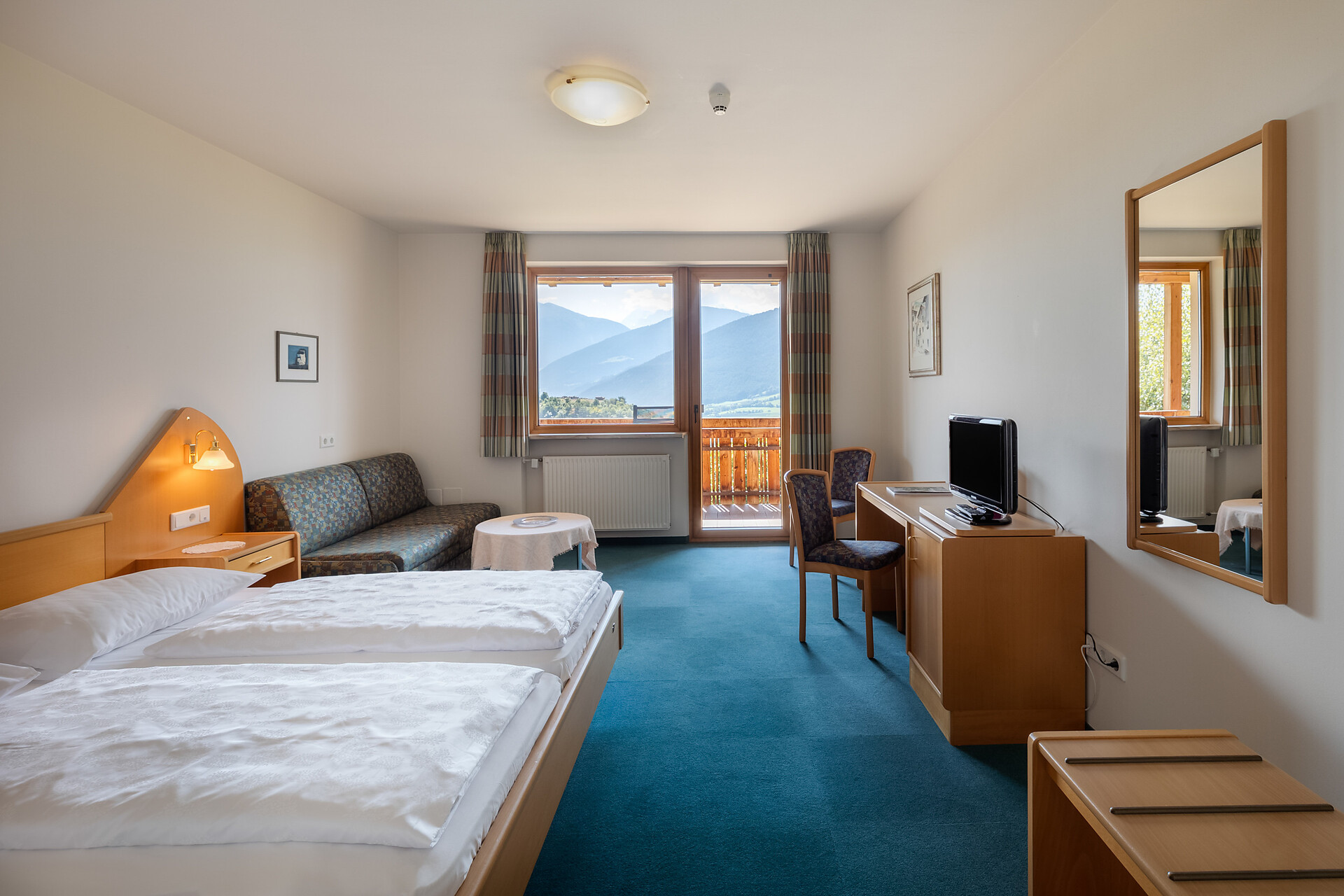 approx. 55 m2 for 2-5 persons – Spacious apartment on the ground floor with panoramic terrace and private garden | Parquet floor | separate bedroom with double bed | fully equipped kitchen | Living area with sofa bed | Bathroom with double sink, shower, WC and bidet | Shower gel & soap | Towels & bed linen | Flat TV | Minibar | W-LAN | Safe