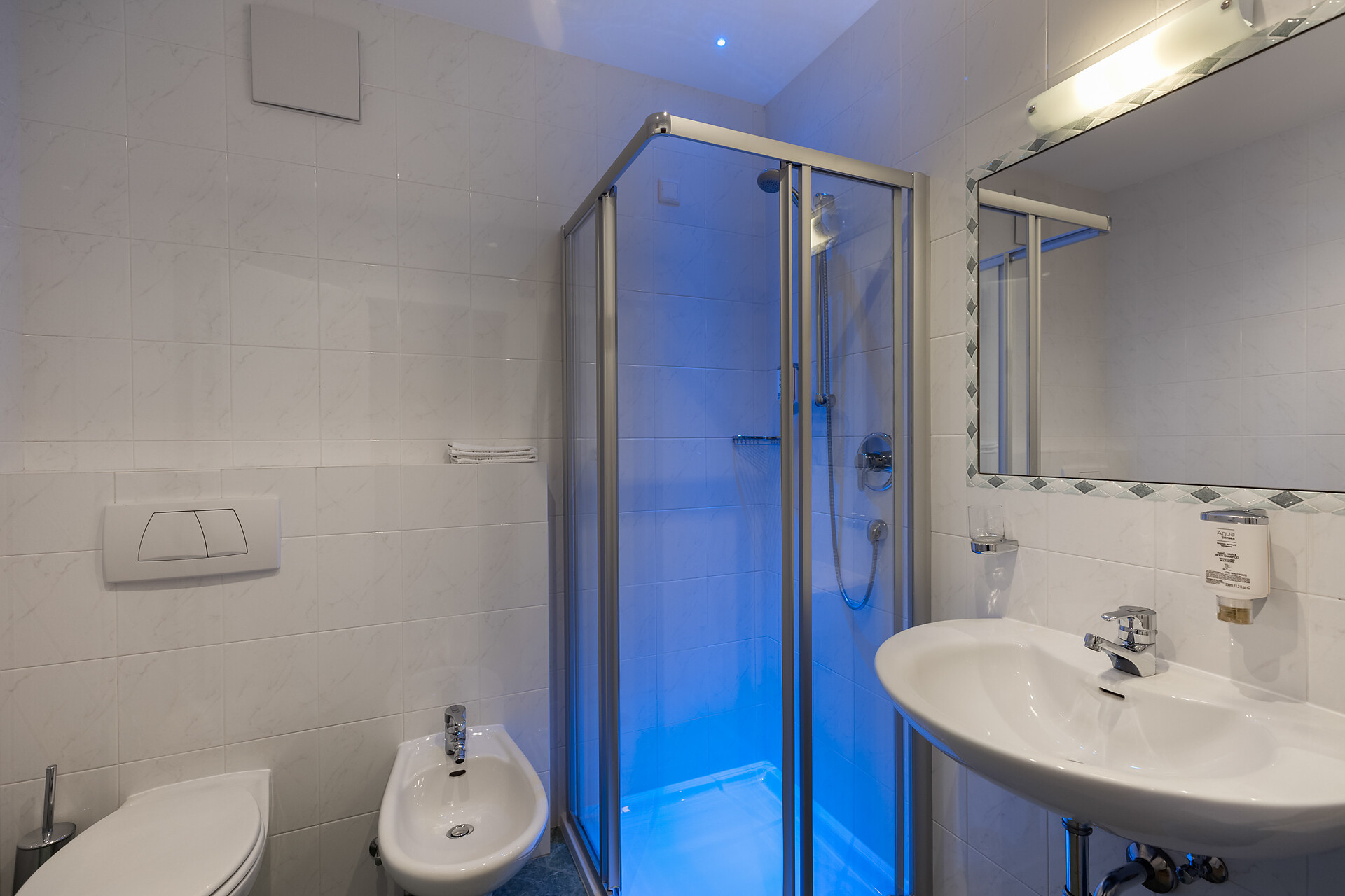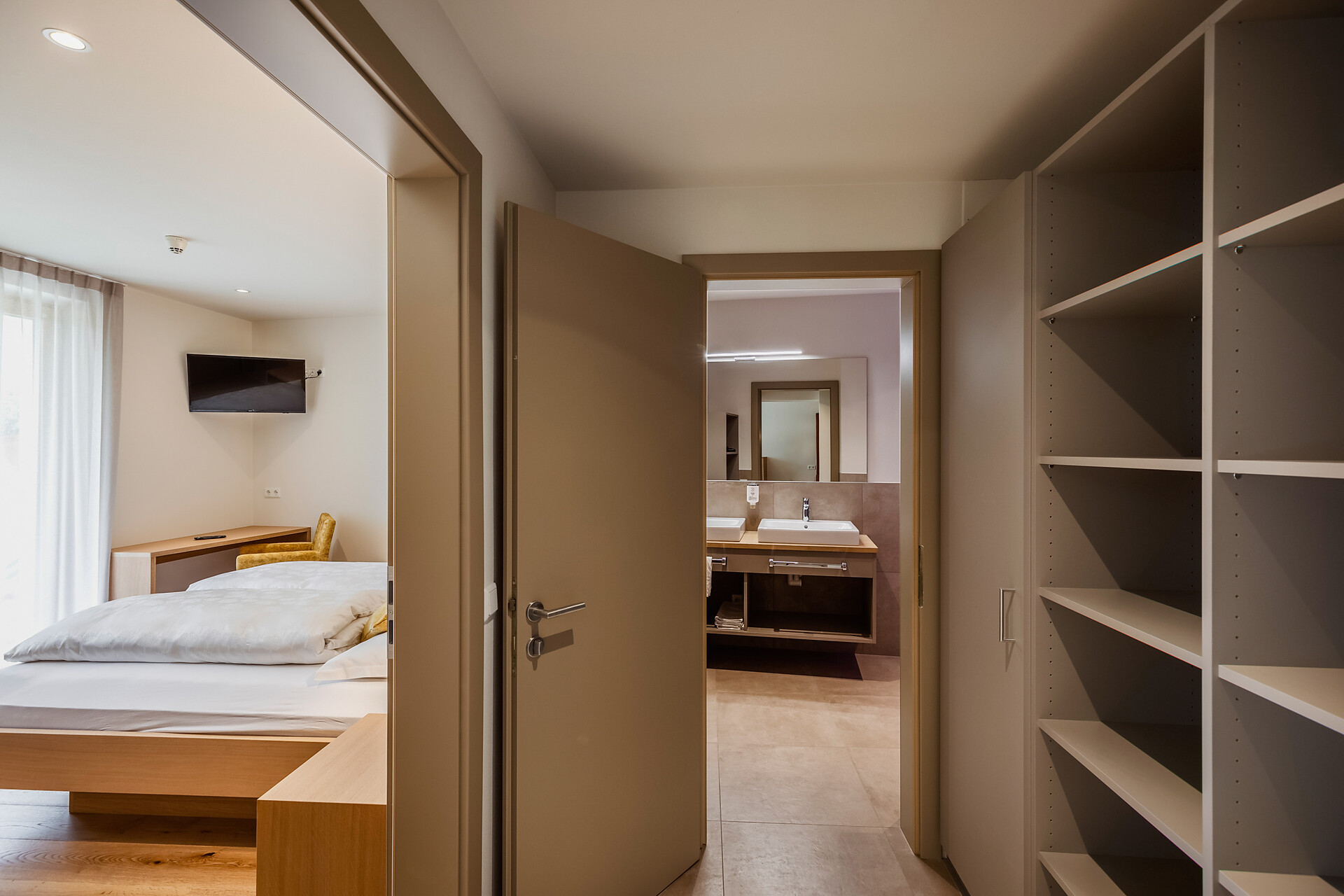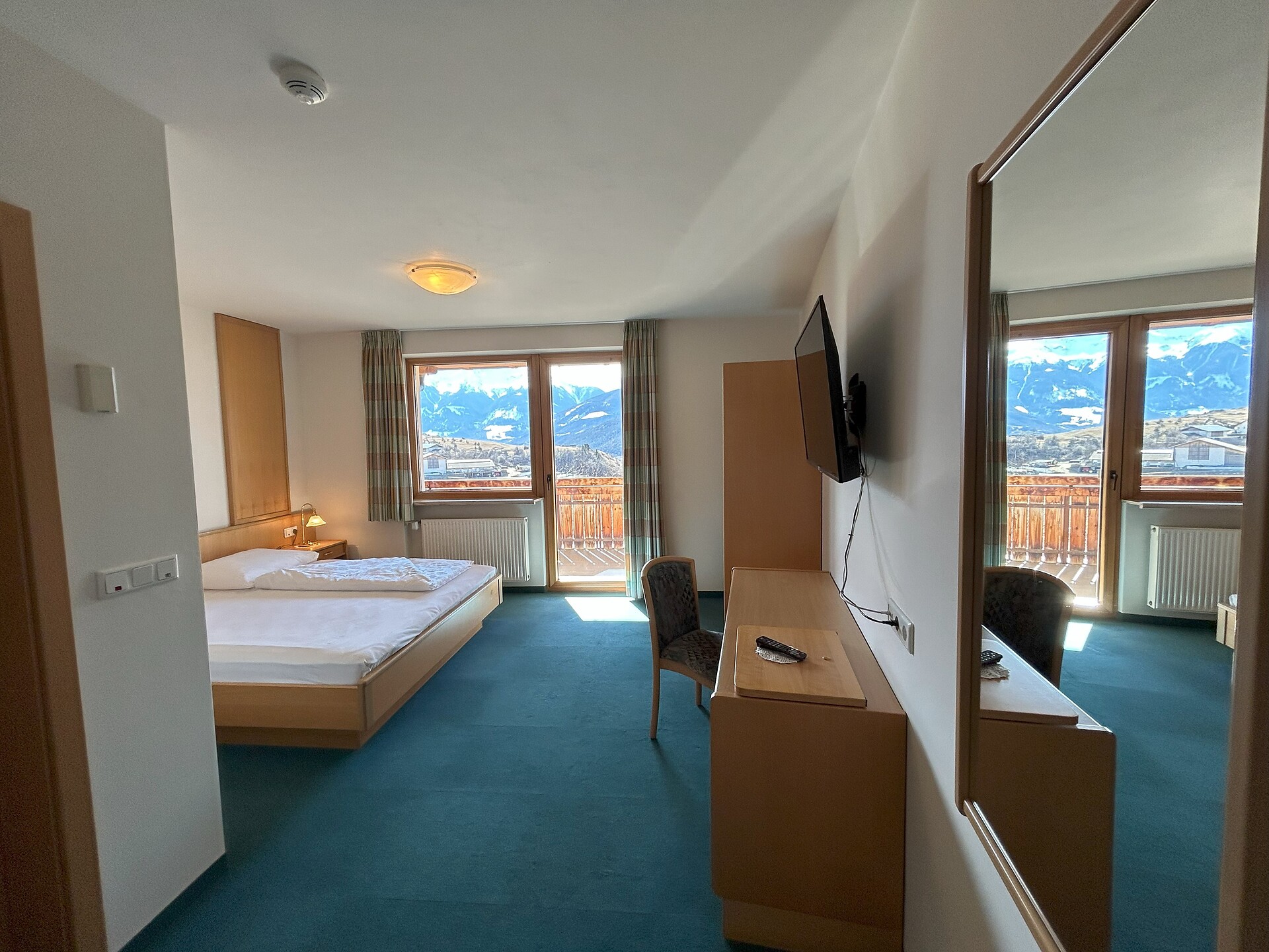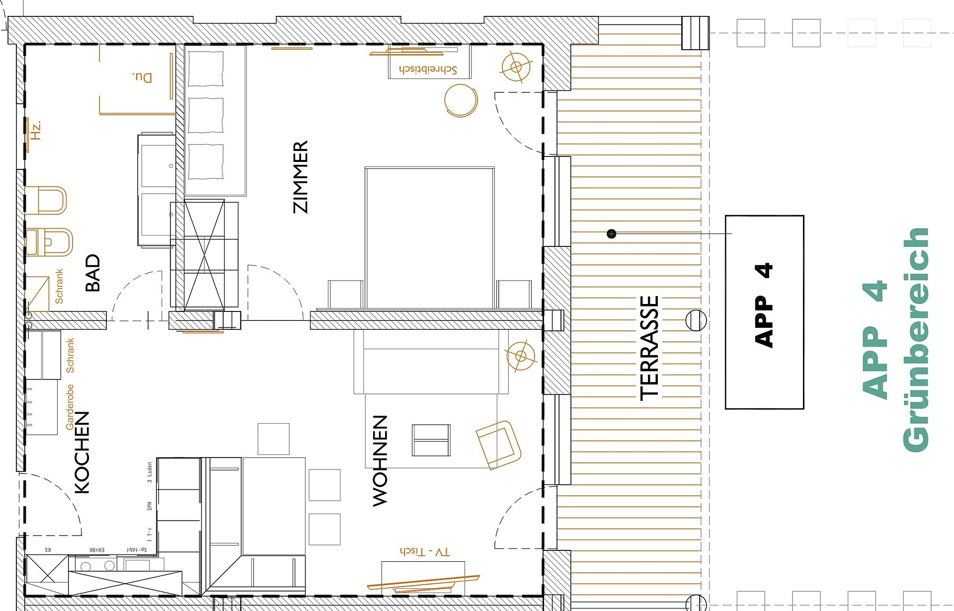 approx. 55 m2 for 2-5 persons – Spacious apartment on the ground floor with panoramic terrace and private garden | Parquet floor | separate bedroom with double bed | fully equipped kitchen | Living area with sofa bed | Bathroom with double sink, shower, WC and bidet | Shower gel & soap | Towels & bed linen | Flat TV | Minibar | W-LAN | Safe