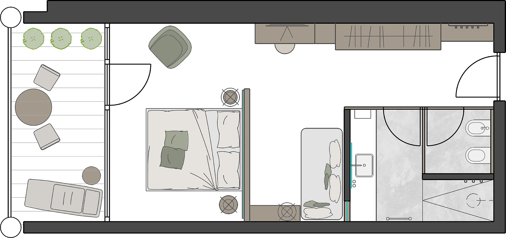 Suite, Double bed , Cot, Bunk bed, Sofa bed, Balcony, Terrace, Anti-allergic room, Handicapped accessible, Safe, Shower / Bath tub, Separate WC, Bidet, Hair dryer, TV, Satellite/Cable, WLAN, Internet access, Main building, South view