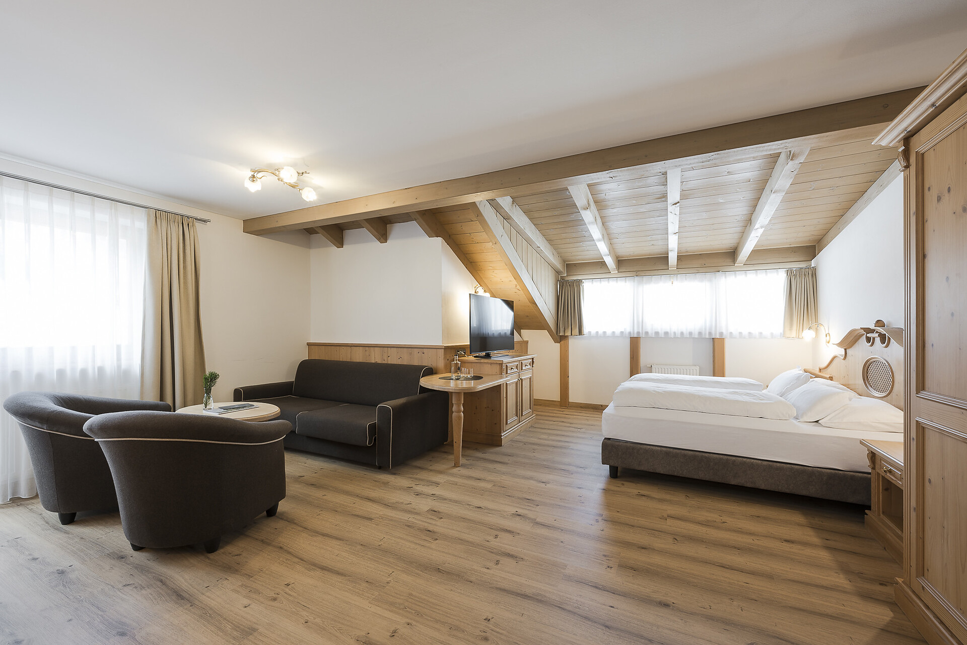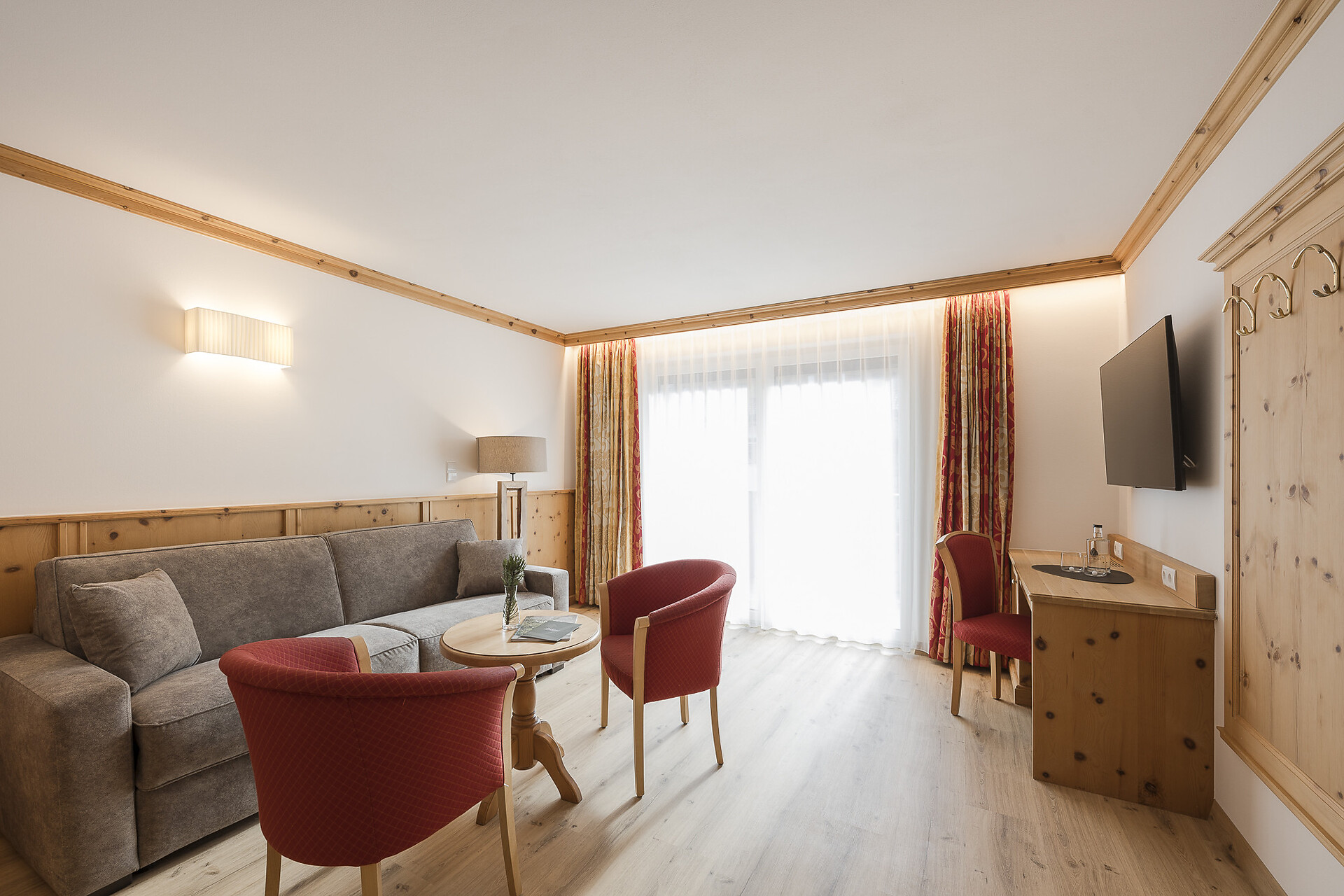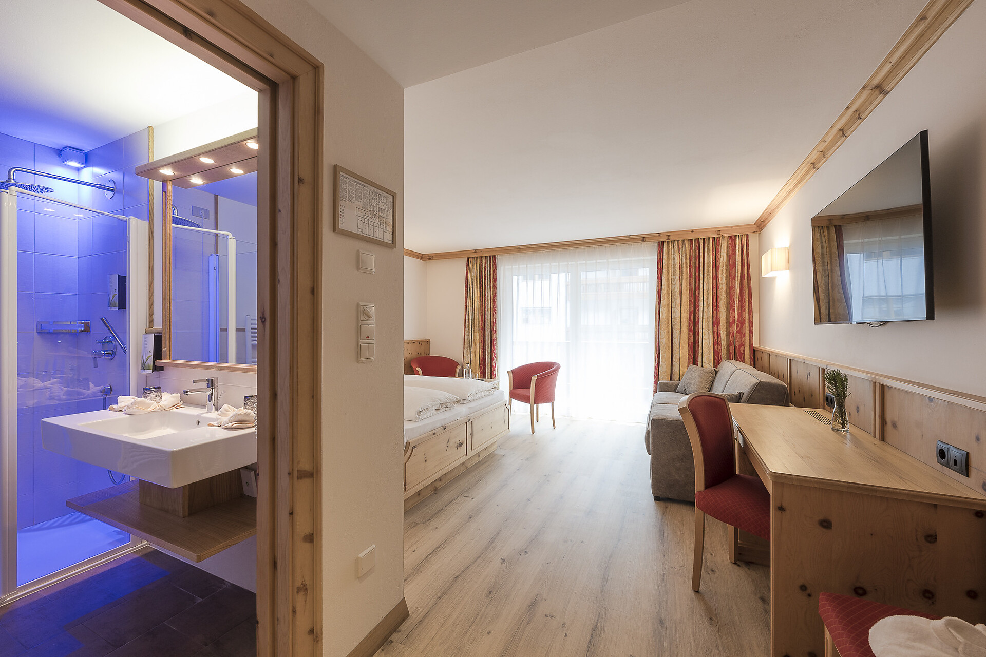 Bathroom with shower, WC, cosmetic mirror, separate bedroom and living room, LCD flat screen TV, safe, balcony, sitting area, fridge, internet connection.