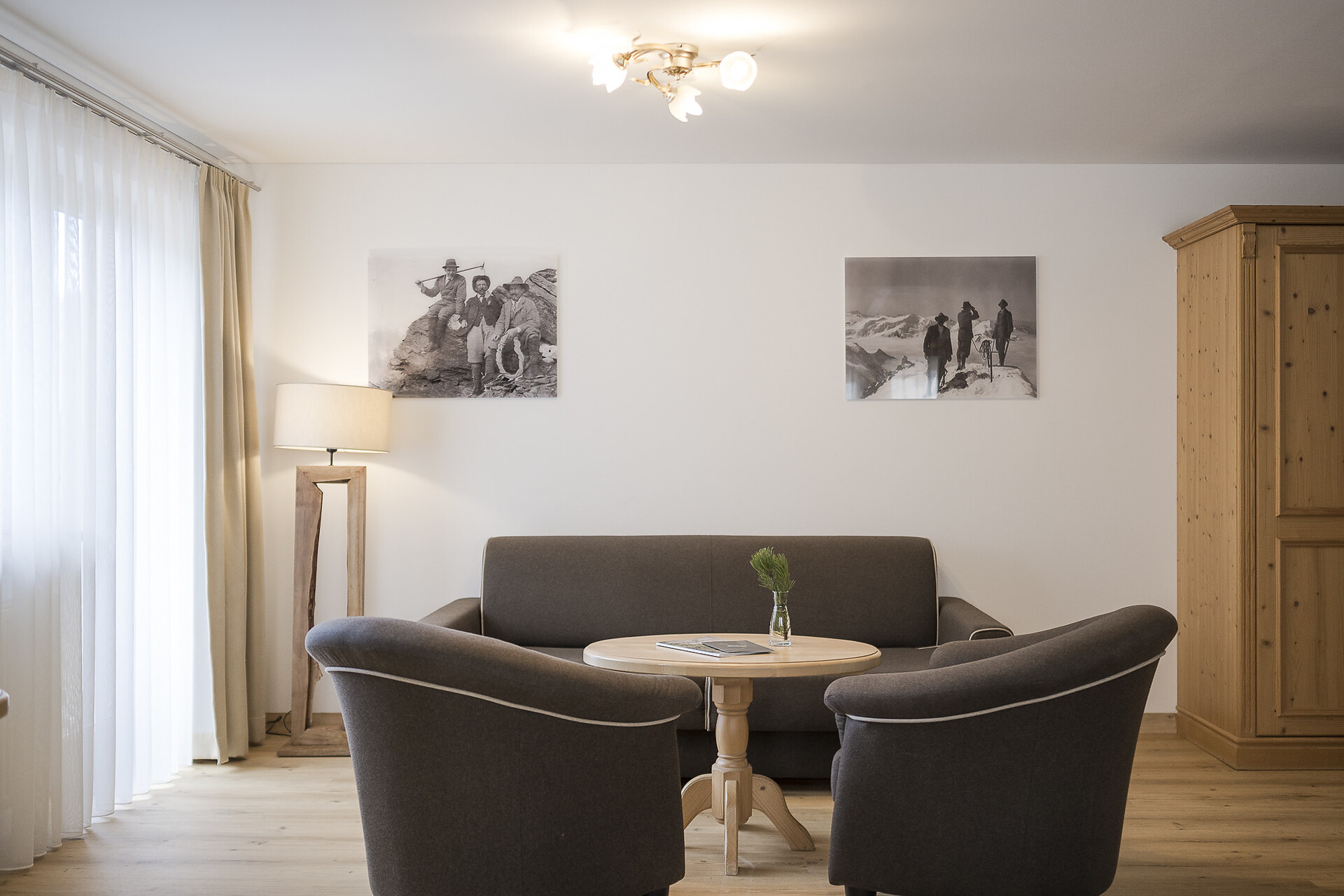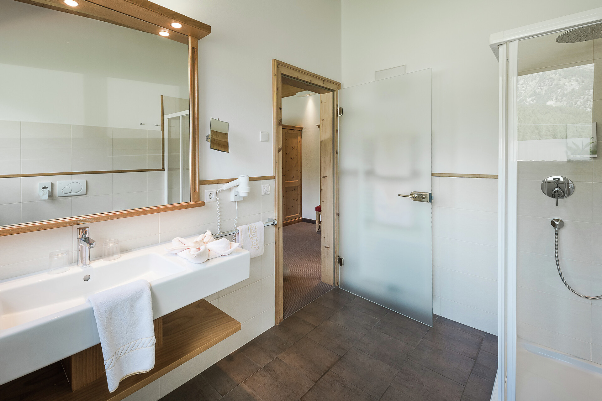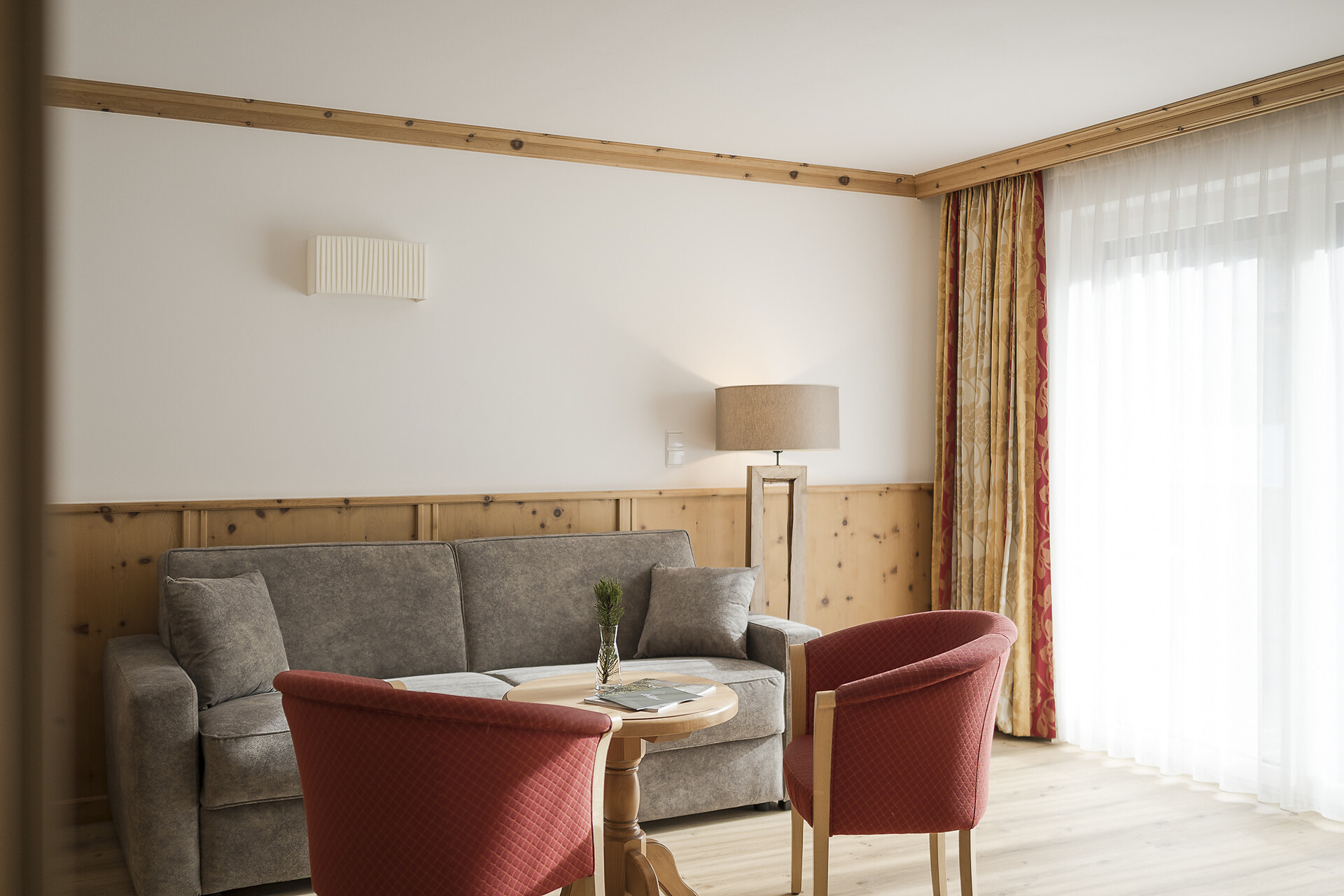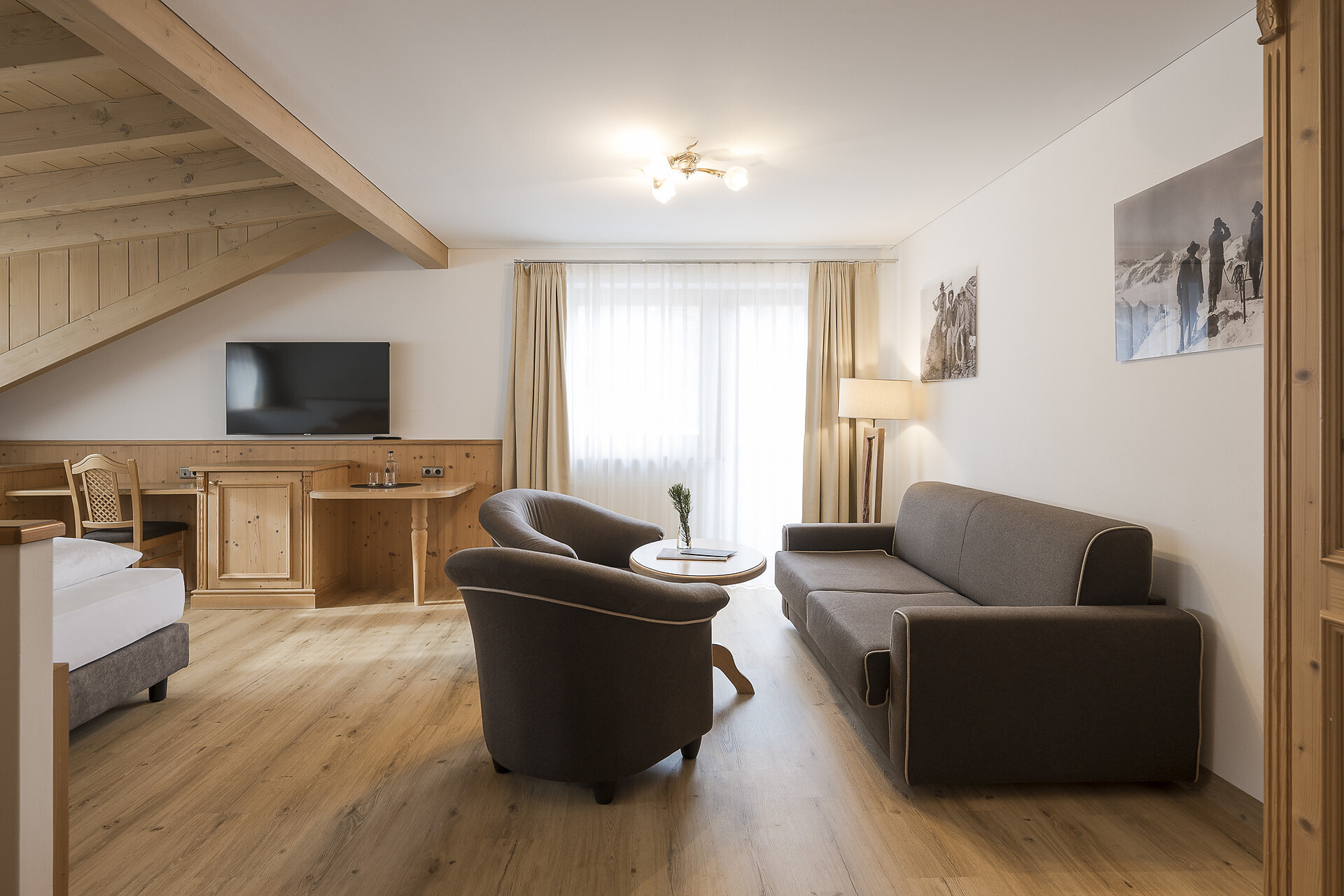 Bathroom with shower, WC, cosmetic mirror, separate bedroom and living room, LCD flat screen TV, safe, balcony, sitting area, fridge, internet connection.