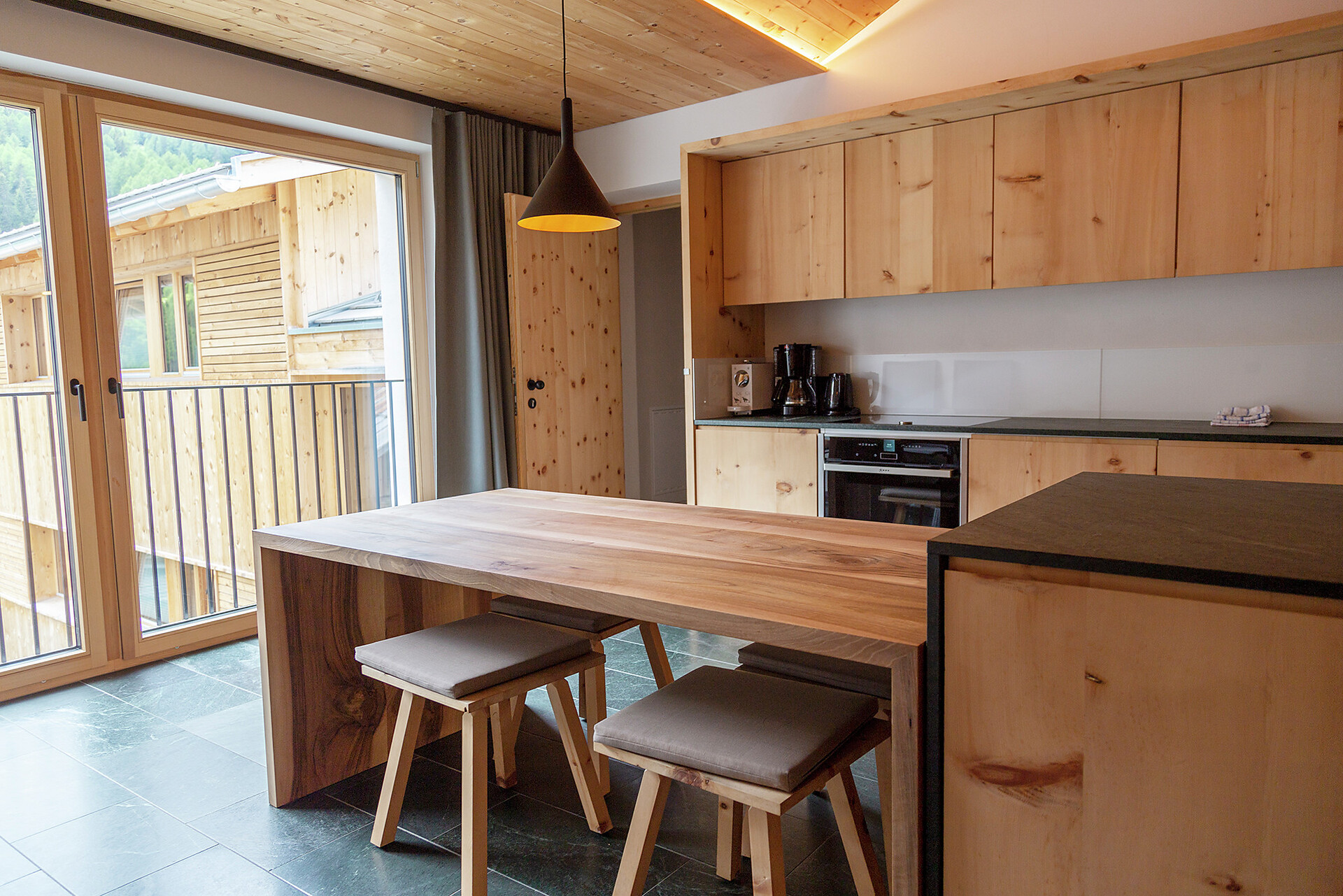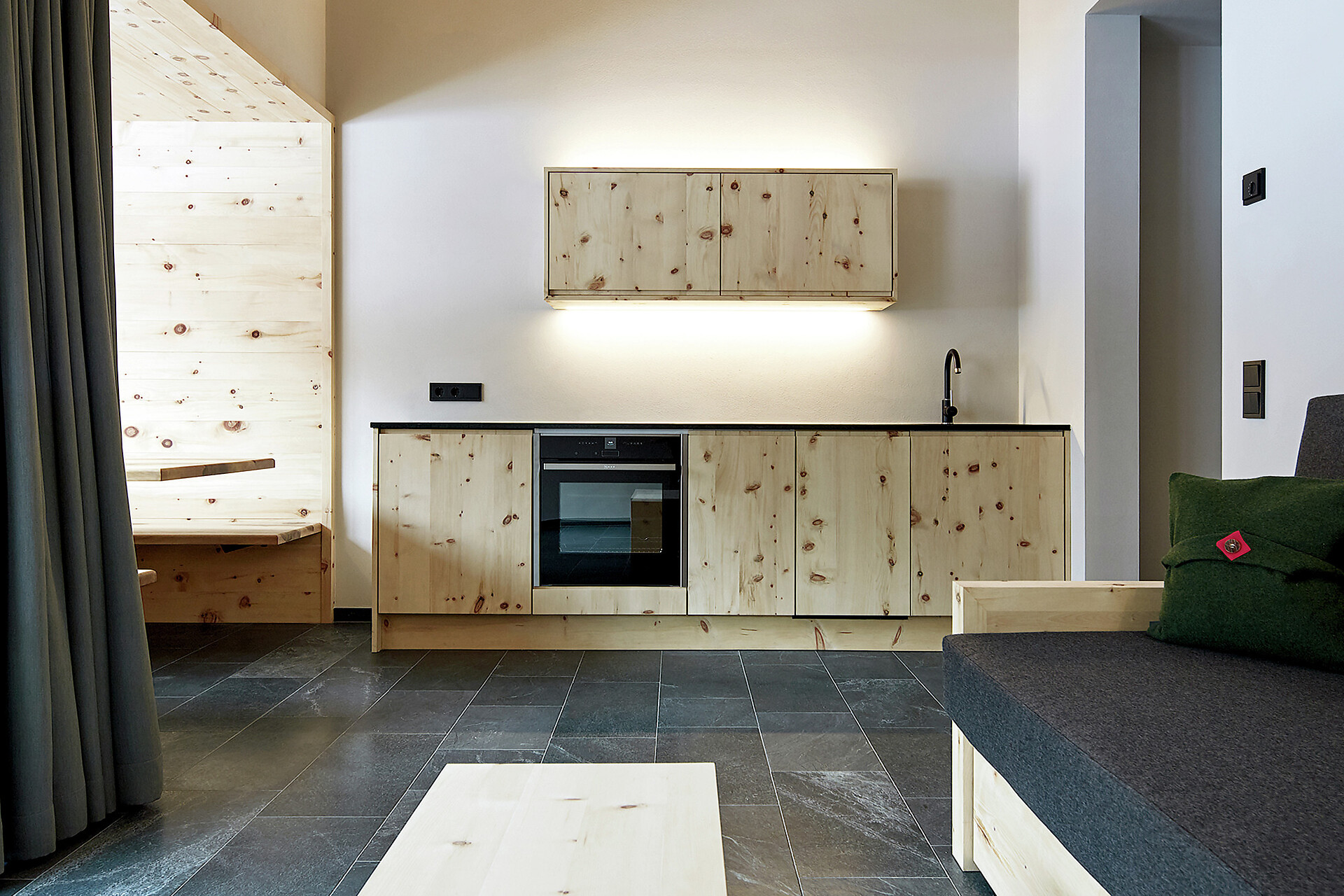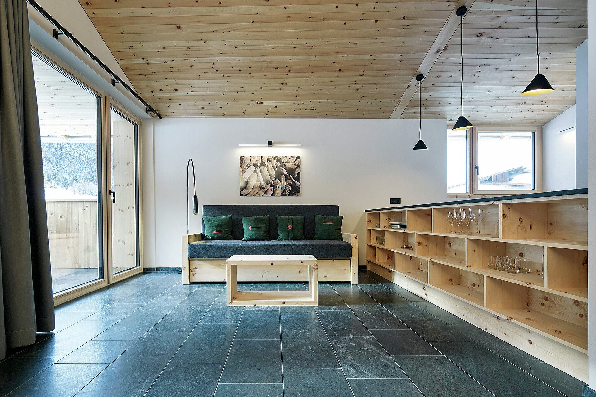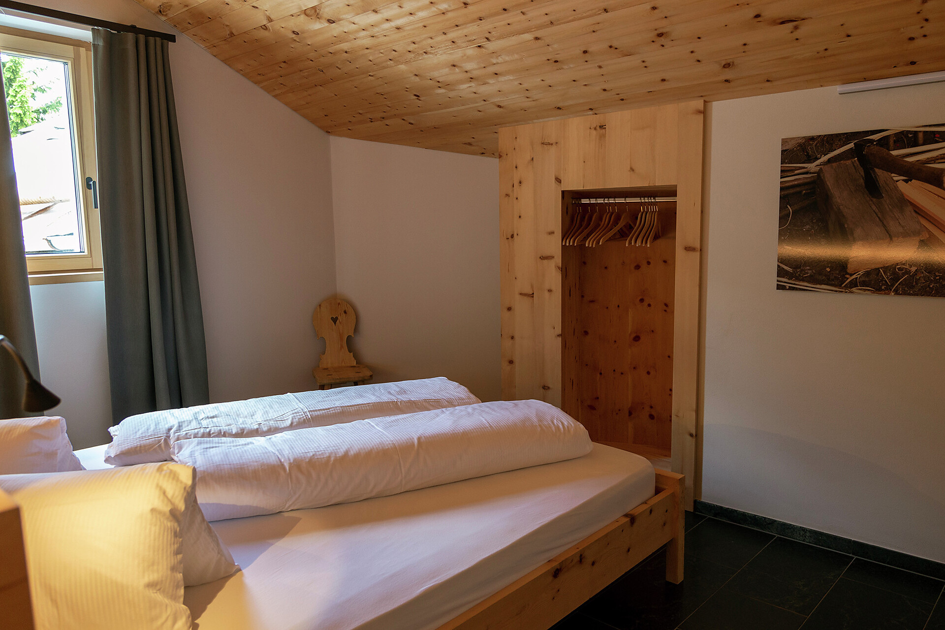We value high quality and natural materials, and as a wood-worker by trade, Roman has an innate appreciation for wood. Natural stone tiles, wooden floors (self-harvested wood from Schlinig) and naturally lit rooms… all the components to feel at home.