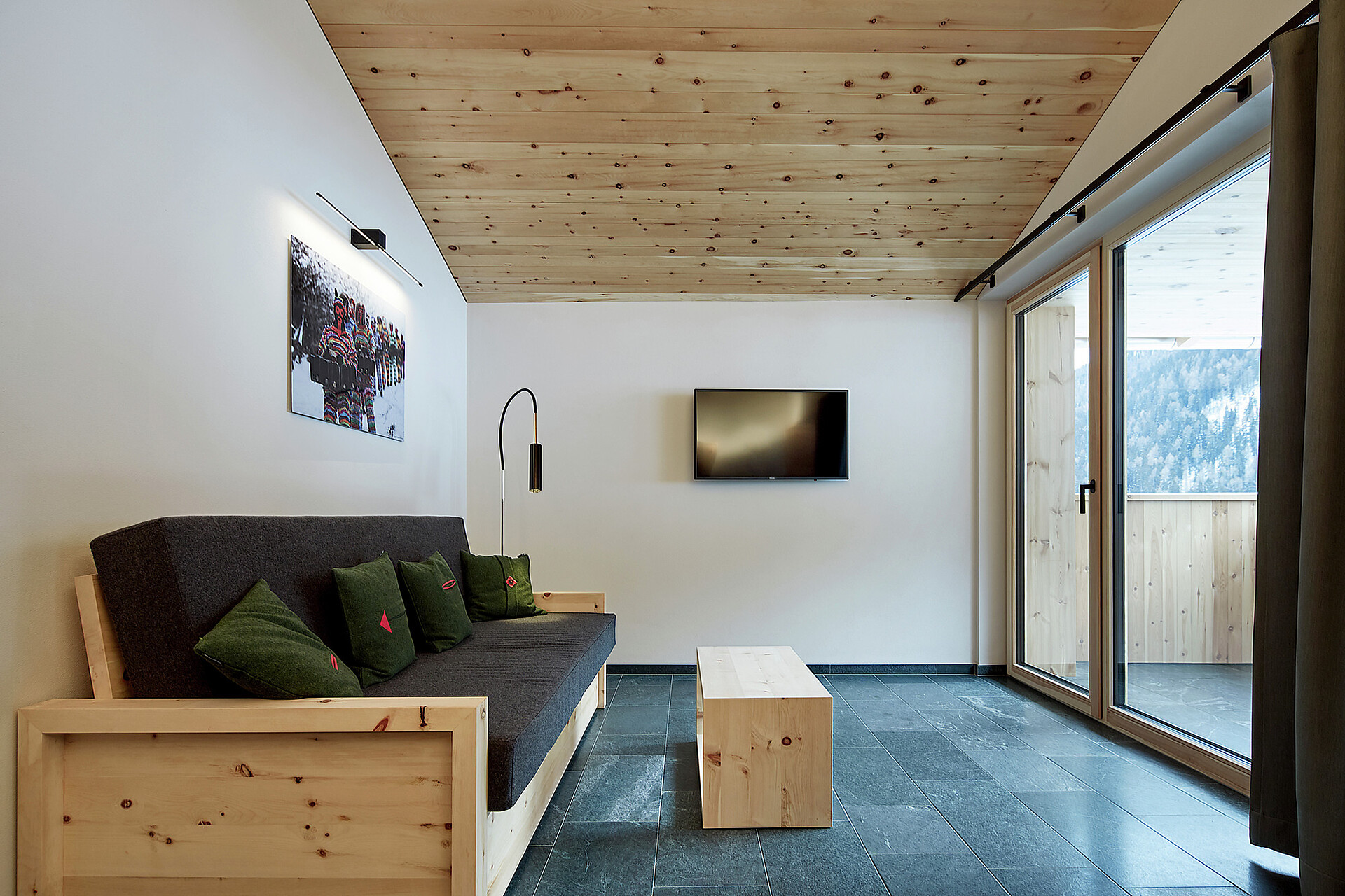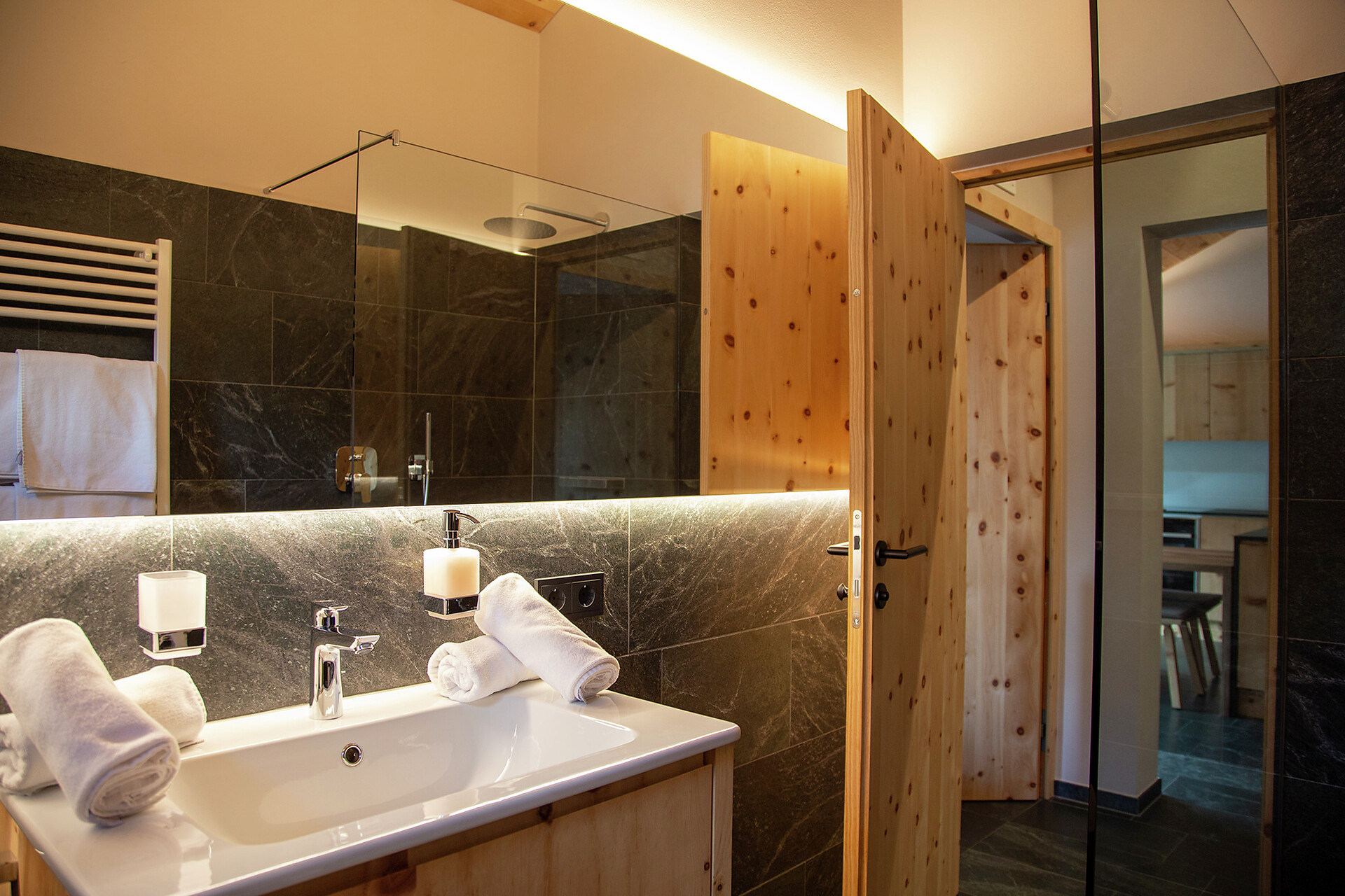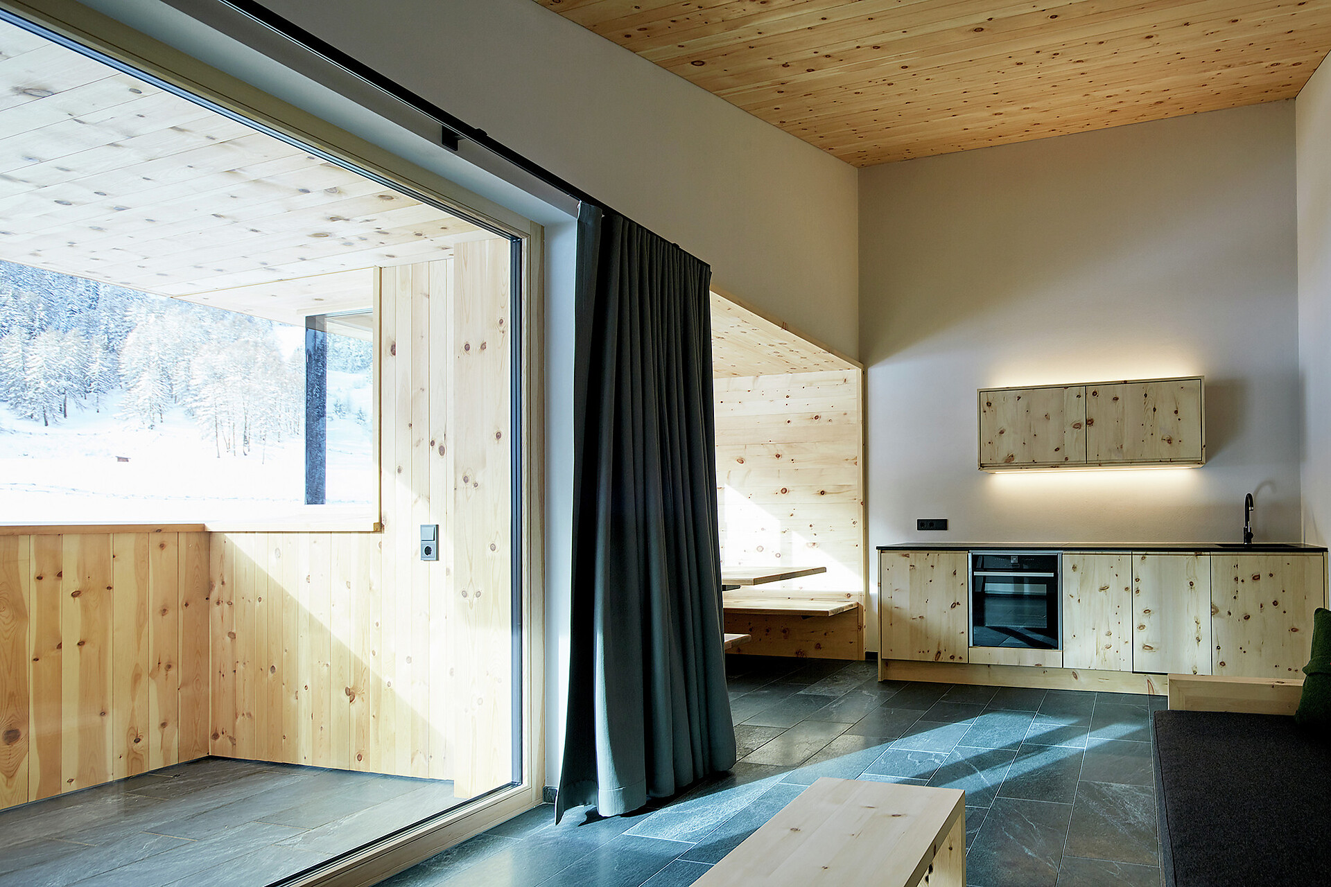 We value high quality and natural materials, and as a wood-worker by trade, Roman has an innate appreciation for wood. Natural stone tiles, wooden floors (self-harvested wood from Schlinig) and naturally lit rooms… all the components to feel at home.