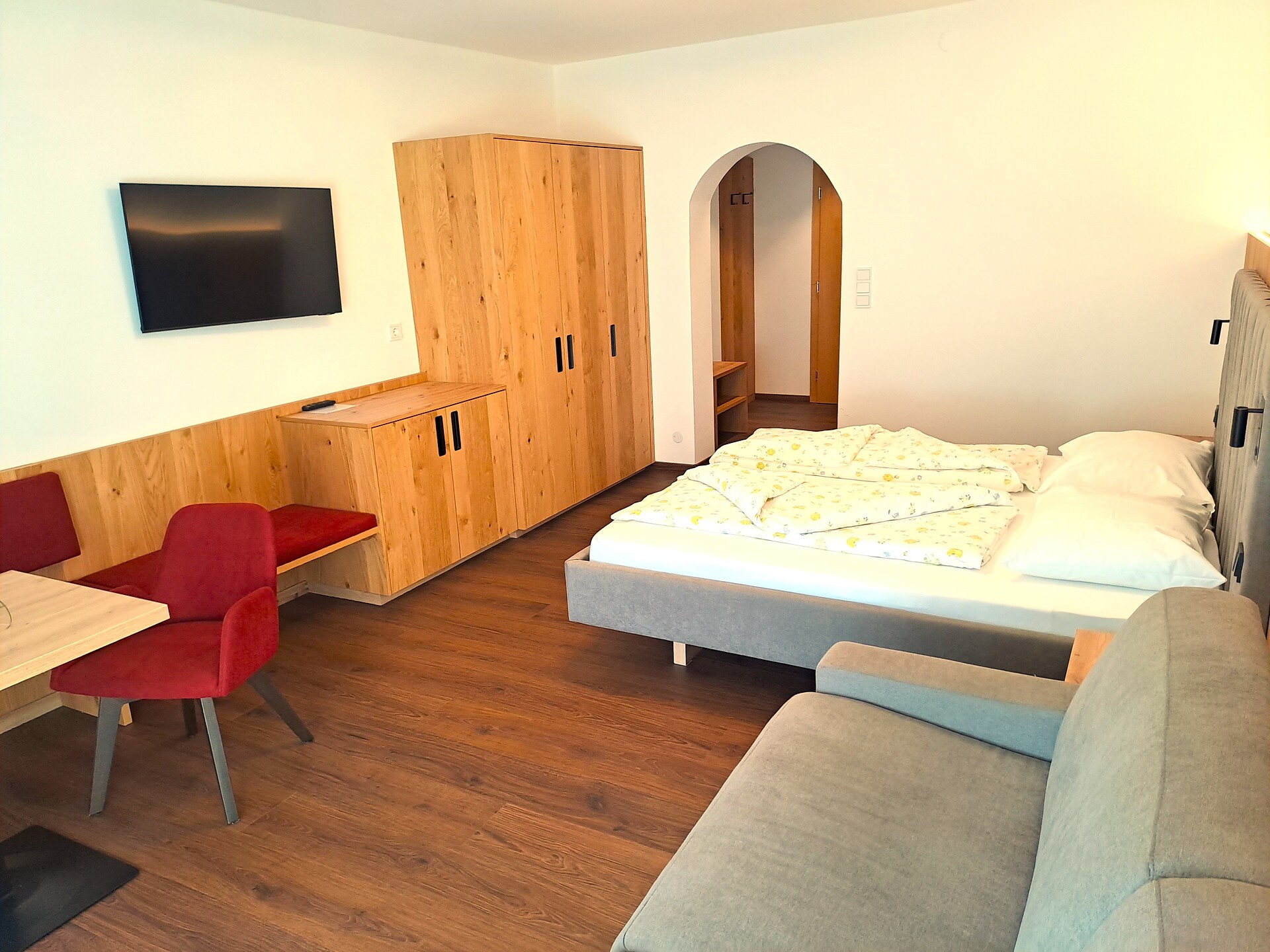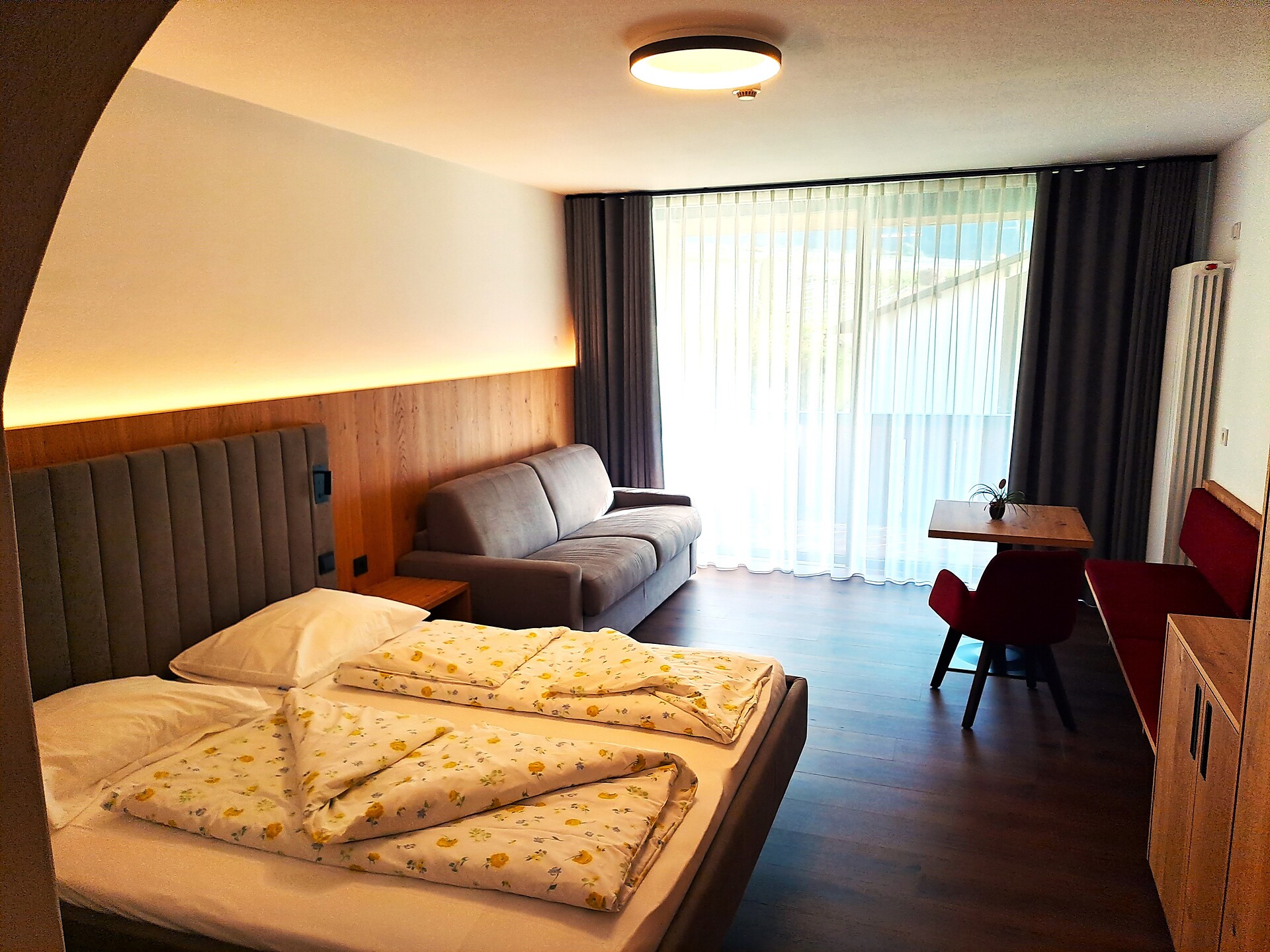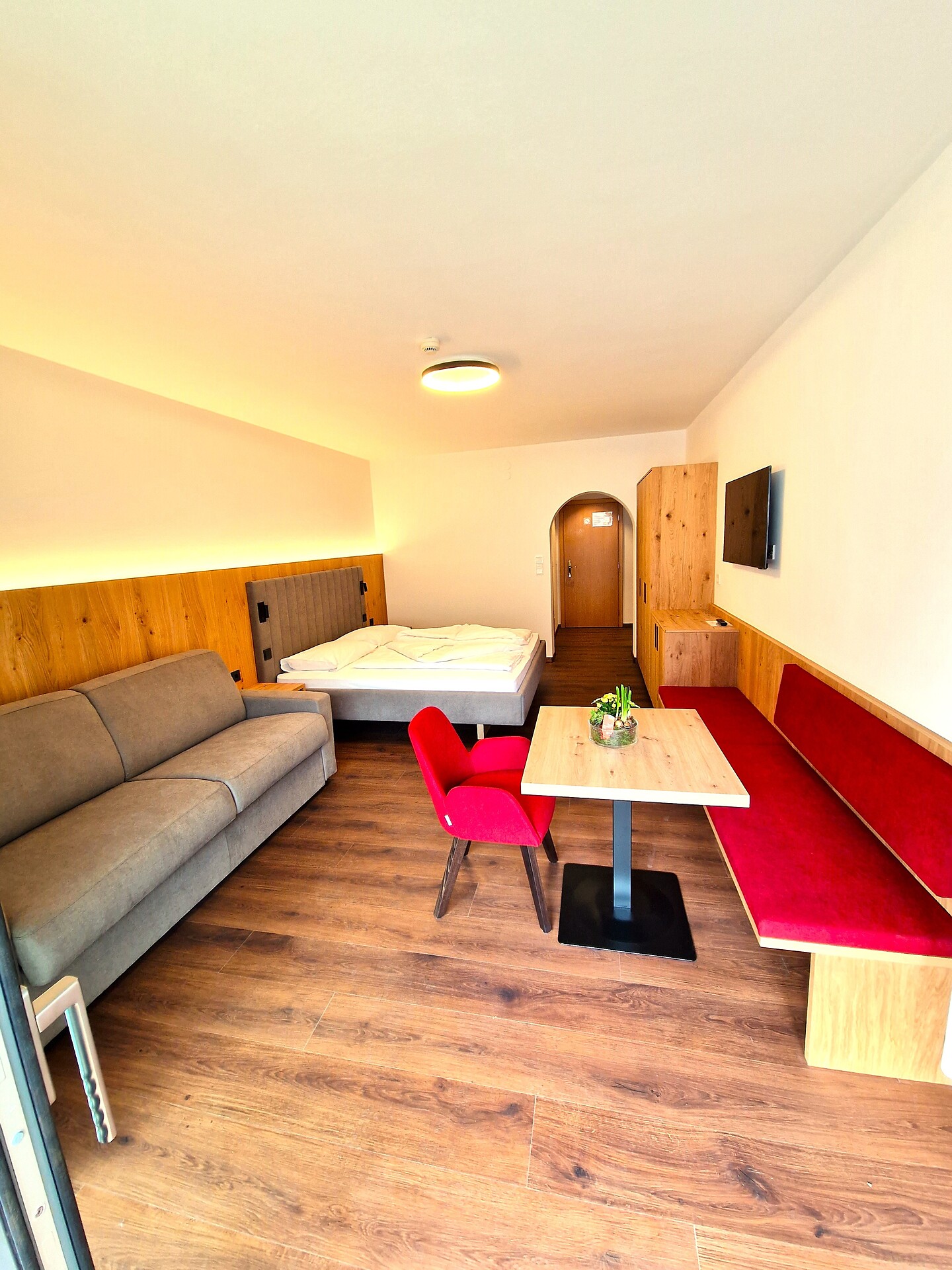 Double bed, sofa bed, balcony, living area, barrier-free, safe, fridge, non-smoking room, shower / bath, toilet, TV, satellite / cable, hairdryer, WiFi, main house, panoramic view, south side