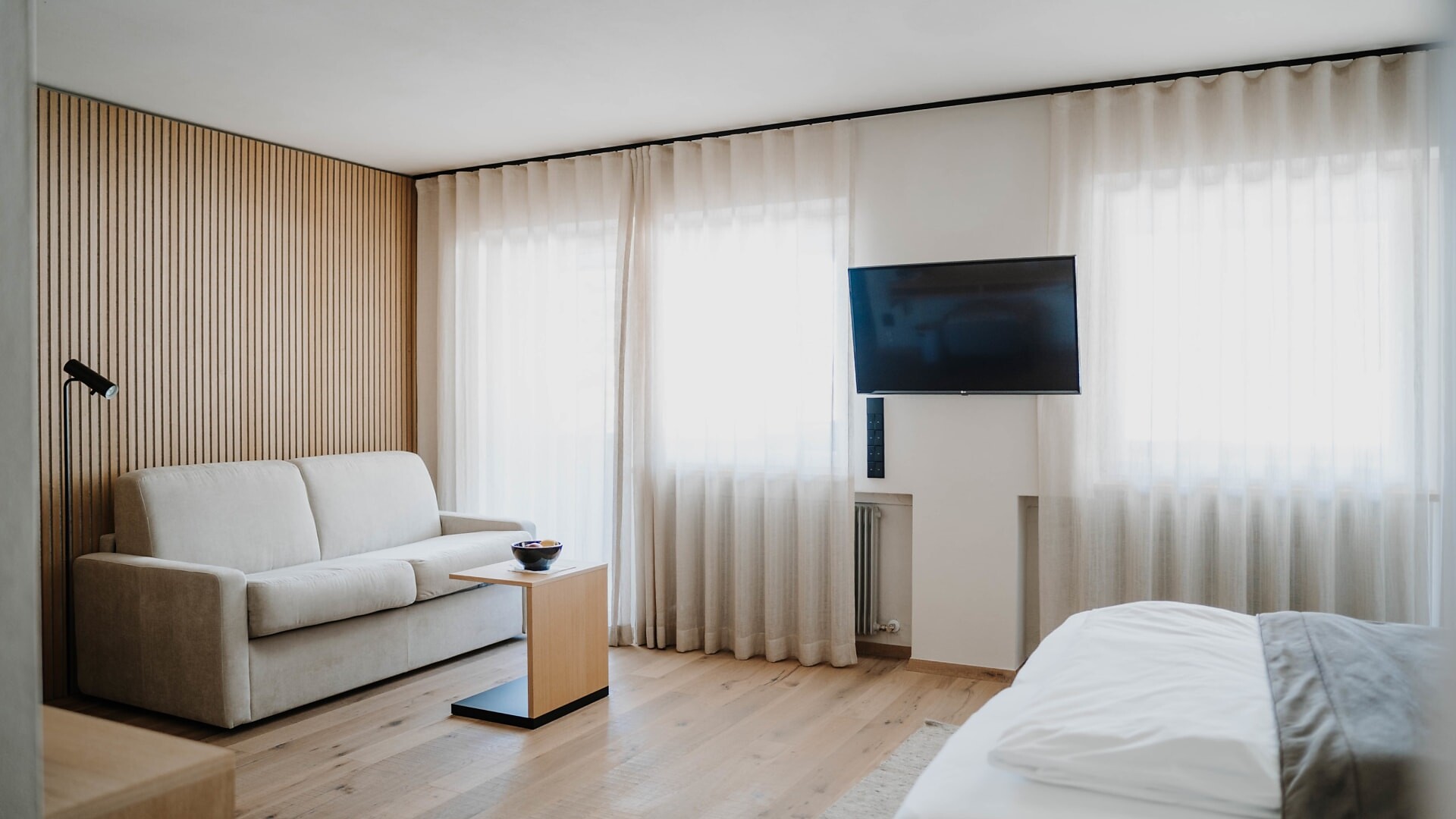 Double room with 30 m² (additional 10-15m² balcony)Noble wooden floorAir conditioningBalcony with double sun loungerView towards apple orchards/mountainsDay bed in the living roomWellness bag with bathrobe and towels for your entire stay