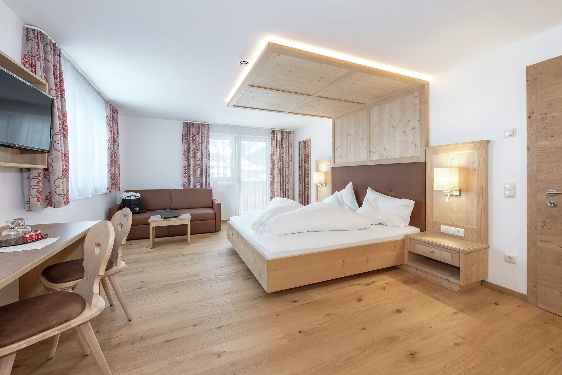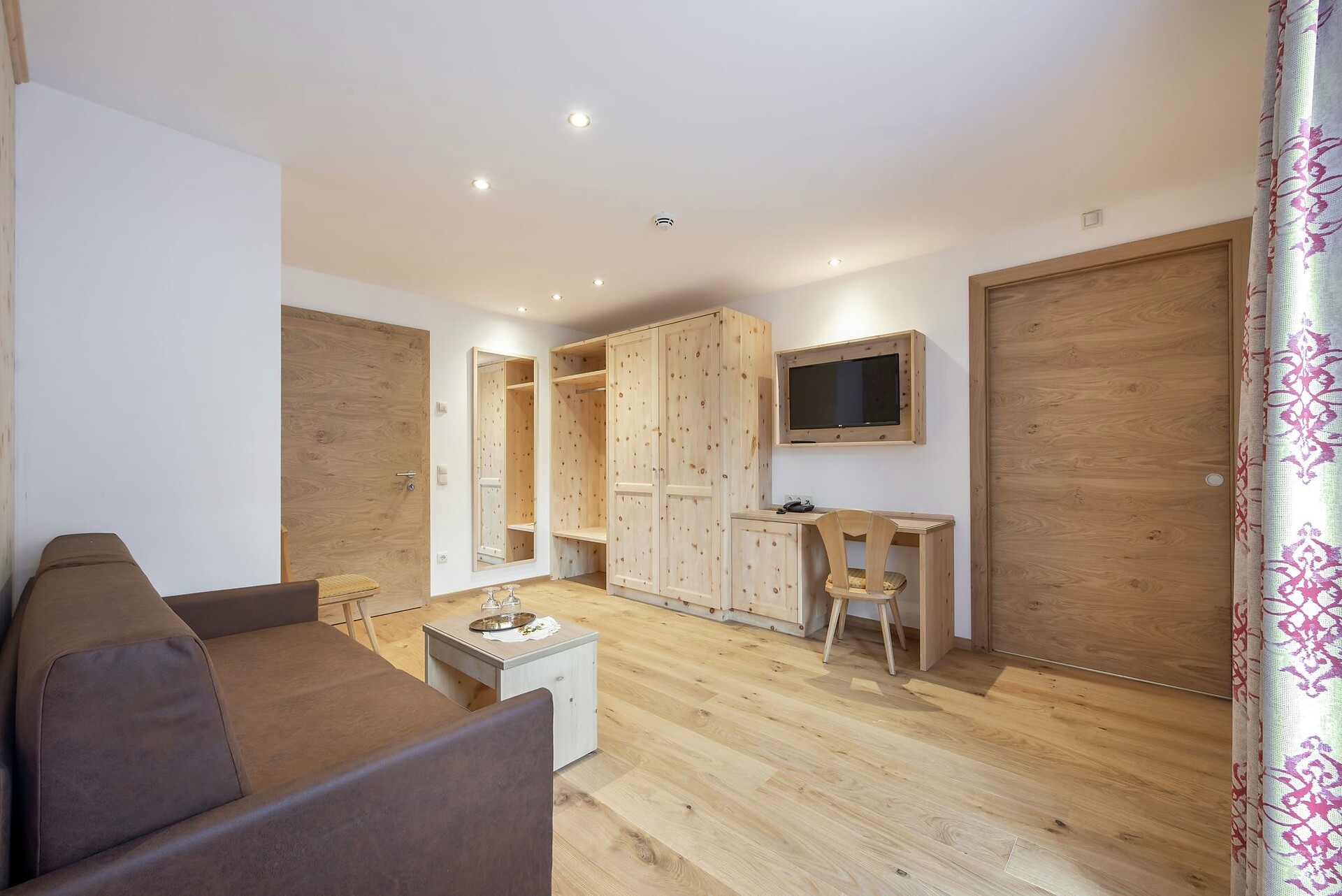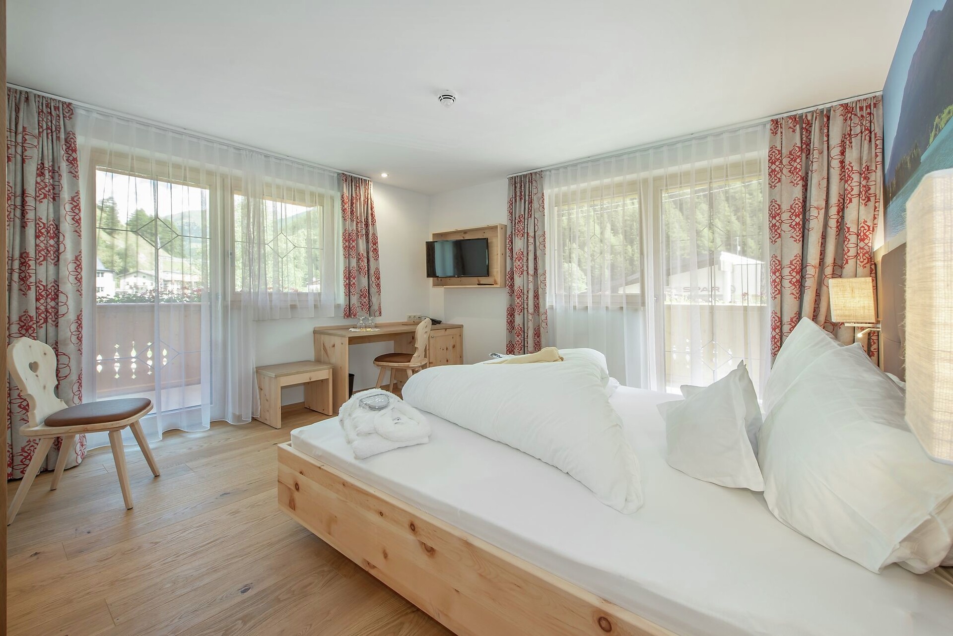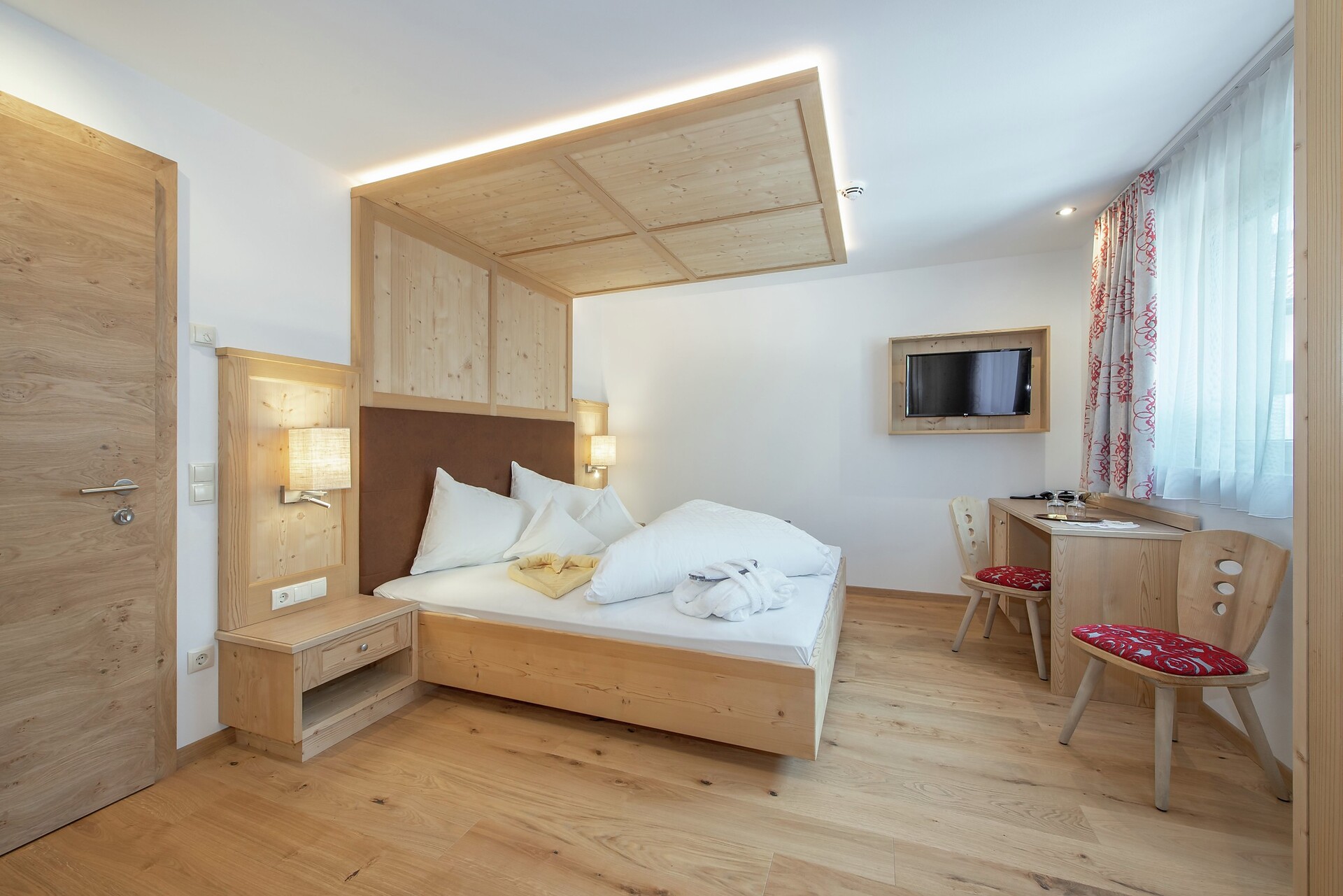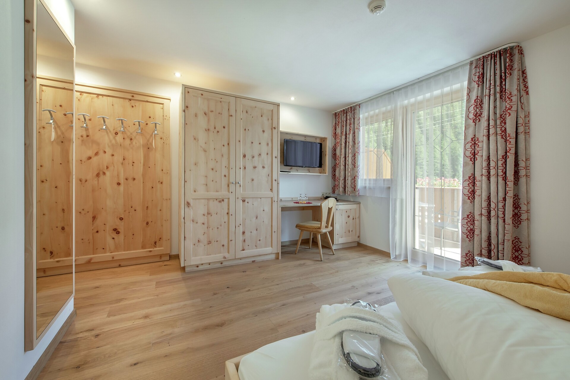 Newly built Alpin Relax rooms in a quiet location in the new building facing north-east, are equipped with solid wood furniture made of Swiss stone pine and oak parquet floors. The fragrant conifer wood, which is extracted from local allora pine, has been proofed to have positive effects for more restful sleeping. Though the Alpine Relax rooms have no own balcony, they still offer a nice mountain view. The facilities include a safe, desk, free WLAN. The bathrooms offer marble washbasins with shelf space, shower, toilet, hairdryer. The room contains bathrobes, terrycloth slippers as well as a wellness bag with sauna towels, which are included.