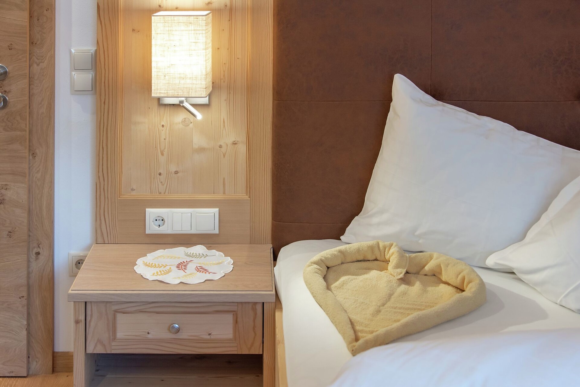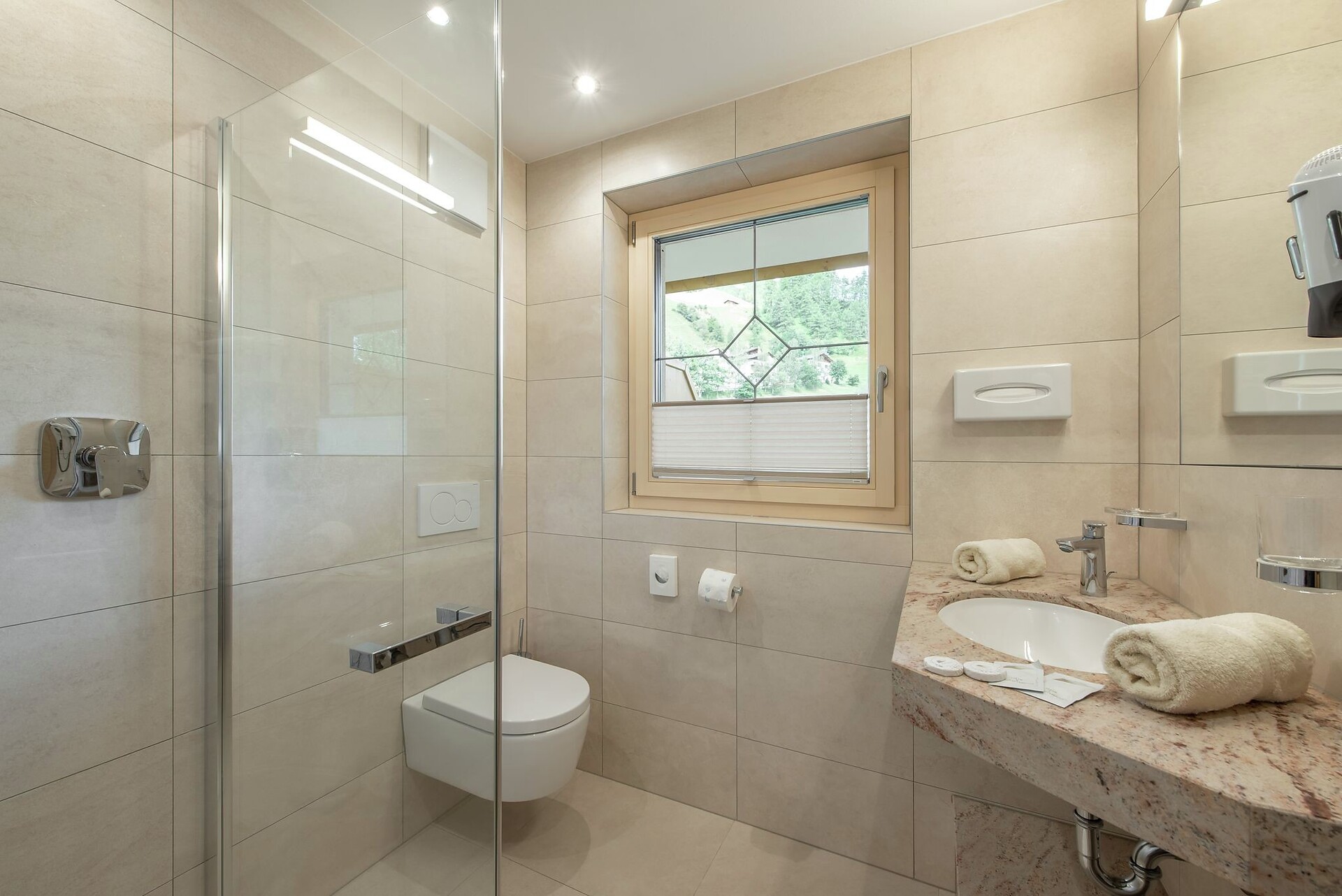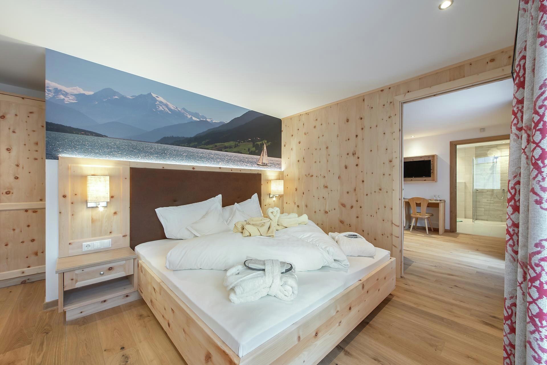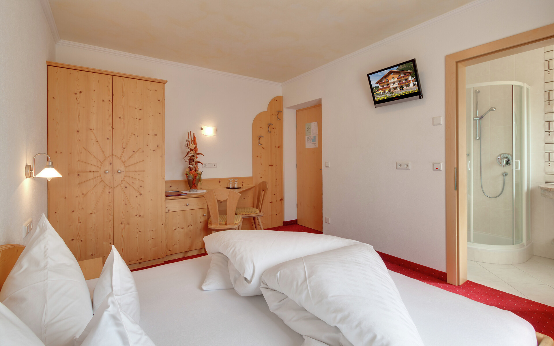 Newly built Alpin Relax rooms in a quiet location in the new building facing north-east, are equipped with solid wood furniture made of Swiss stone pine and oak parquet floors. The fragrant conifer wood, which is extracted from local allora pine, has been proofed to have positive effects for more restful sleeping. Though the Alpine Relax rooms have no own balcony, they still offer a nice mountain view. The facilities include a safe, desk, free WLAN. The bathrooms offer marble washbasins with shelf space, shower, toilet, hairdryer. The room contains bathrobes, terrycloth slippers as well as a wellness bag with sauna towels, which are included.
