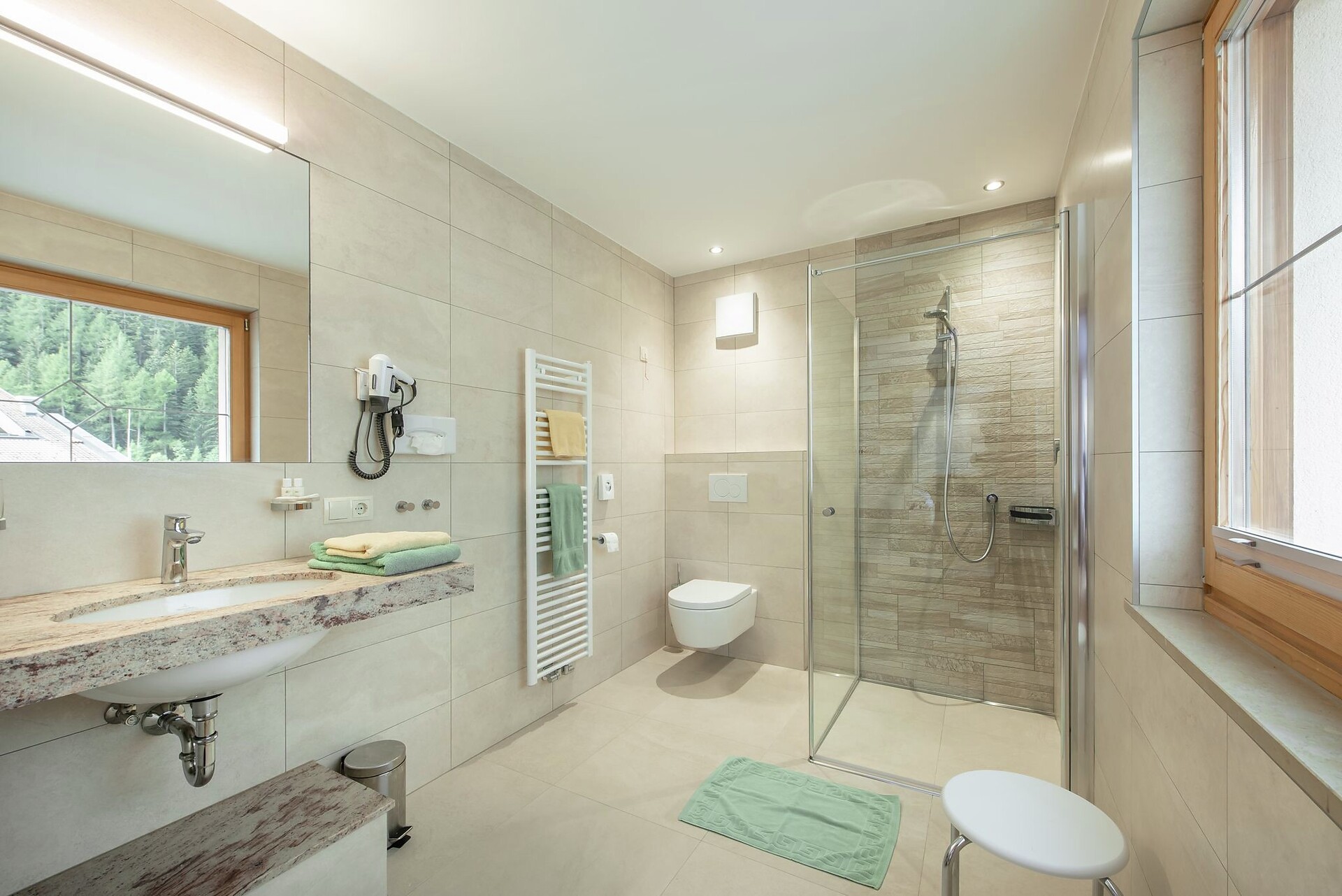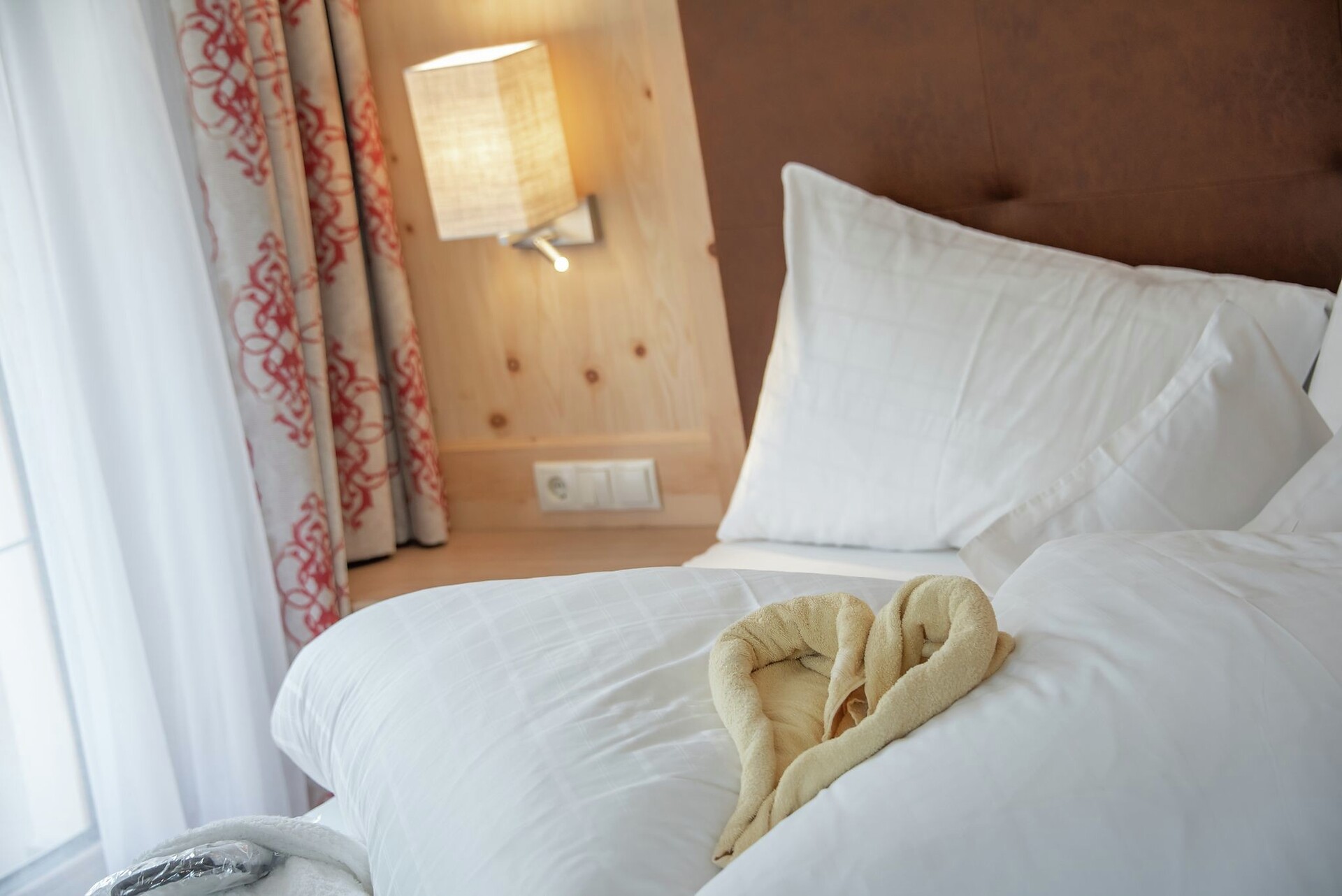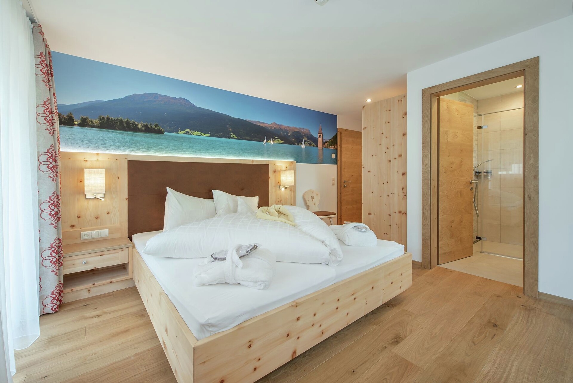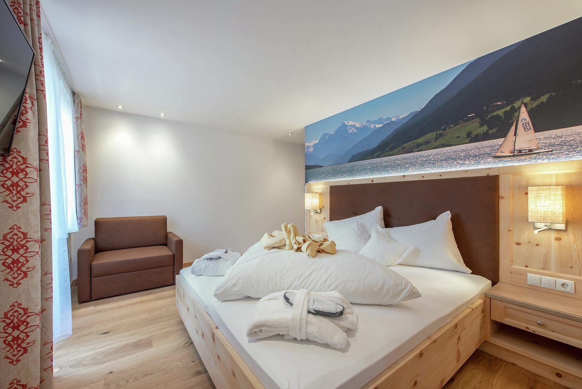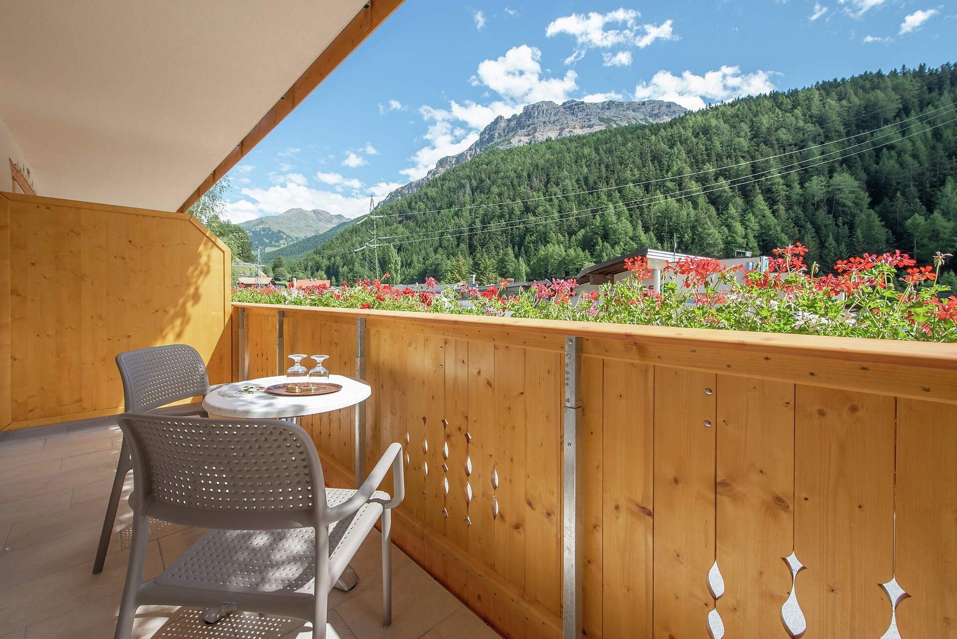 Newly built Alpin Relax rooms in a quiet location in the new building facing north-east, are equipped with solid wood furniture made of Swiss stone pine and oak parquet floors. The fragrant conifer wood, which is extracted from local allora pine, has been proofed to have positive effects for more restful sleeping. Though the Alpine Relax rooms have no own balcony, they still offer a nice mountain view. The facilities include a safe, desk, free WLAN. The bathrooms offer marble washbasins with shelf space, shower, toilet, hairdryer. The room contains bathrobes, terrycloth slippers as well as a wellness bag with sauna towels, which are included.