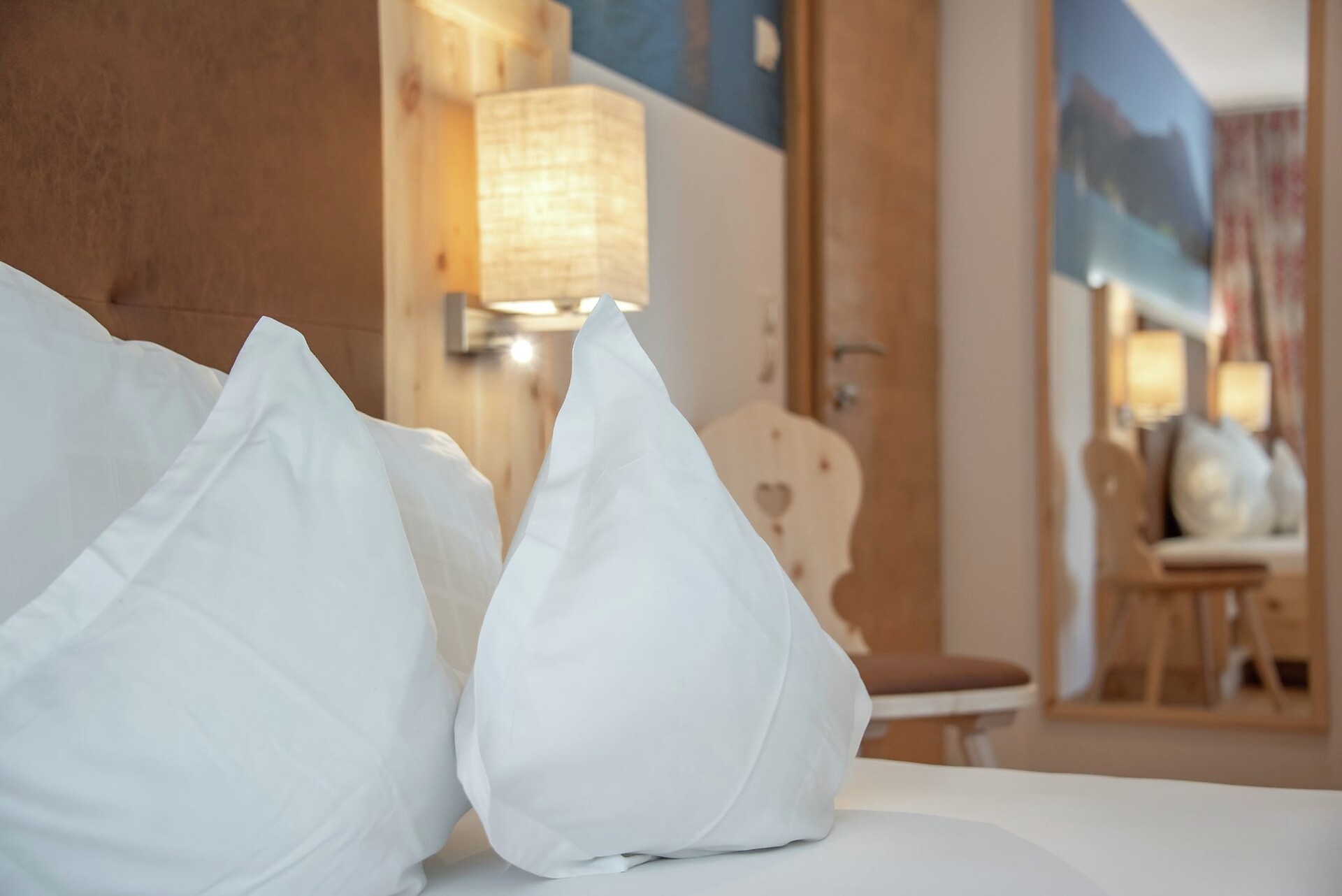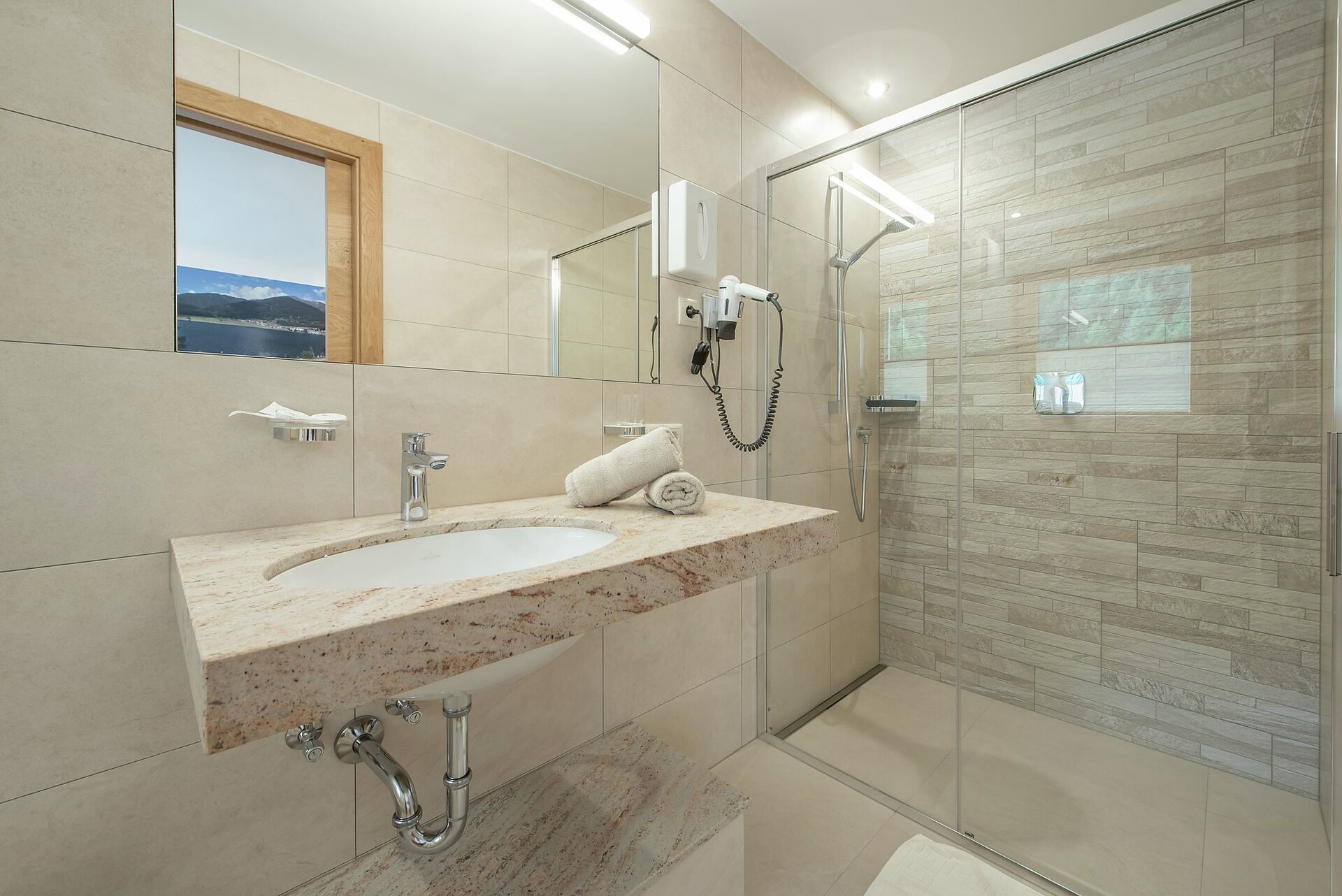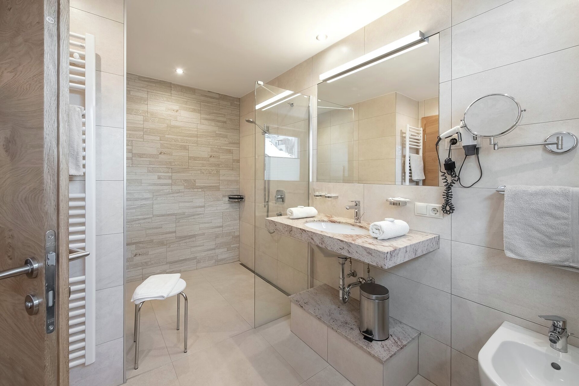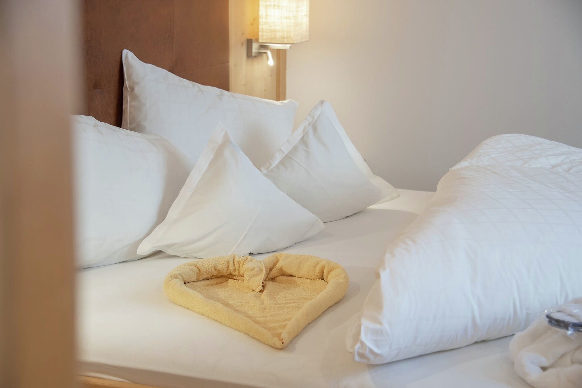 Newly built Alpin Relax rooms in a quiet location in the new building facing north-east, are equipped with solid wood furniture made of Swiss stone pine and oak parquet floors. The fragrant conifer wood, which is extracted from local allora pine, has been proofed to have positive effects for more restful sleeping. Though the Alpine Relax rooms have no own balcony, they still offer a nice mountain view. The facilities include a safe, desk, free WLAN. The bathrooms offer marble washbasins with shelf space, shower, toilet, hairdryer. The room contains bathrobes, terrycloth slippers as well as a wellness bag with sauna towels, which are included.