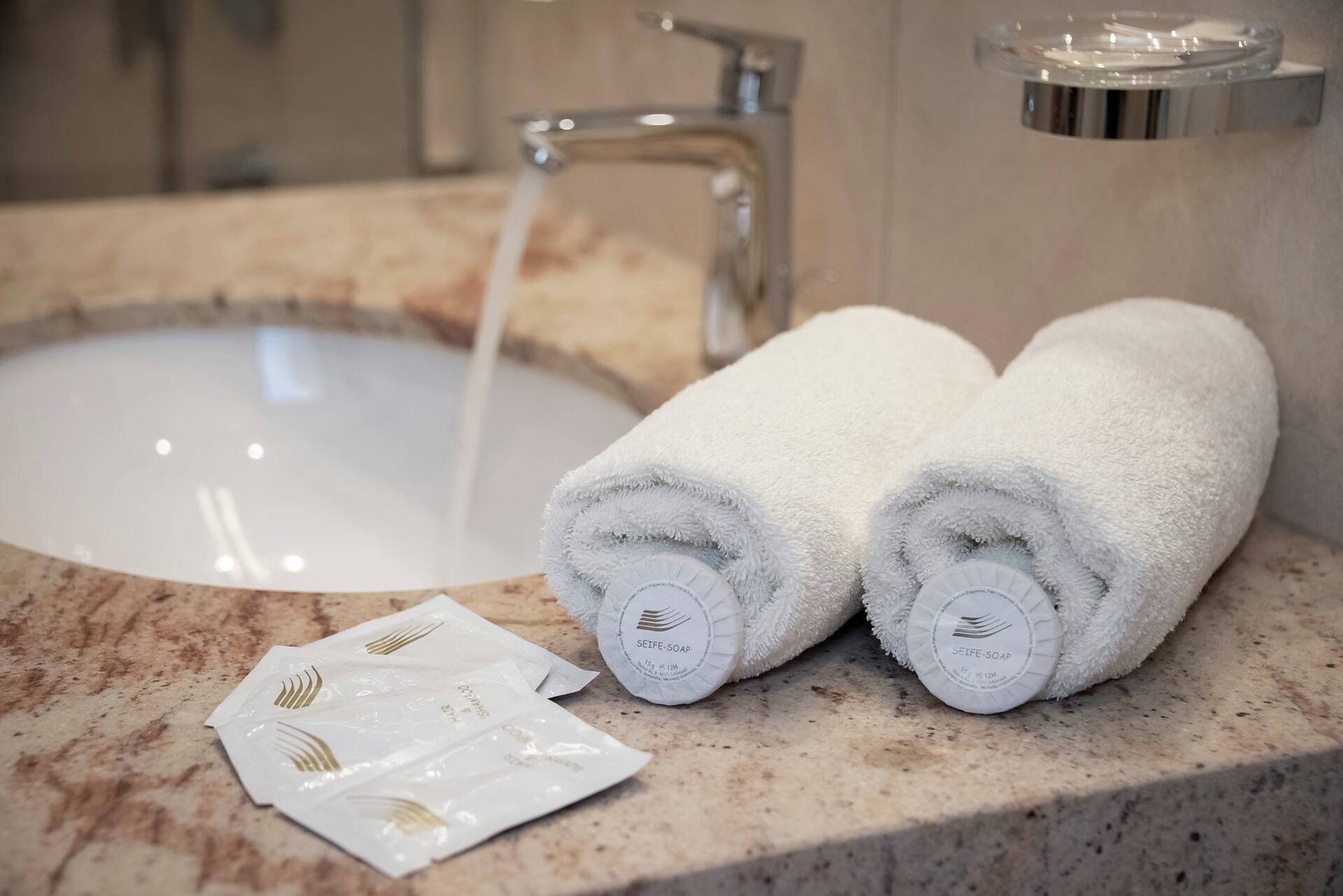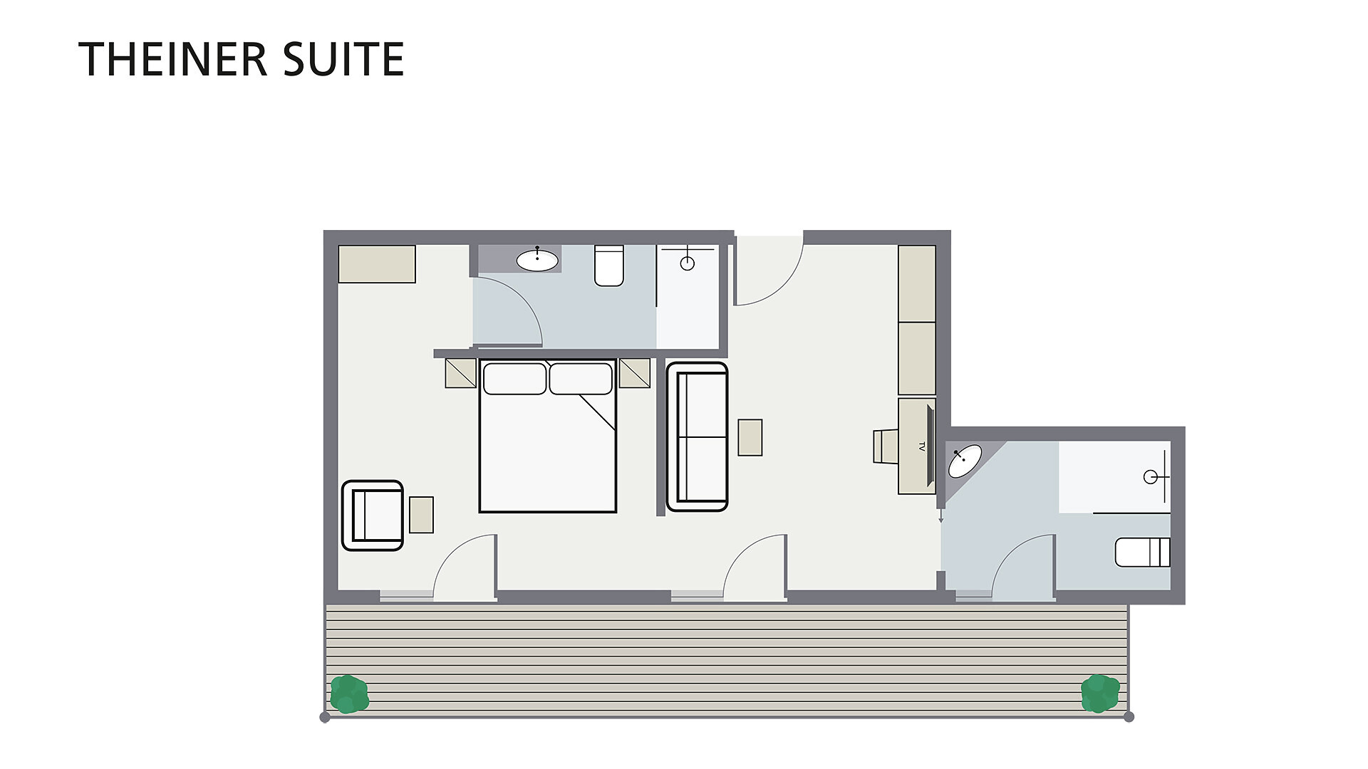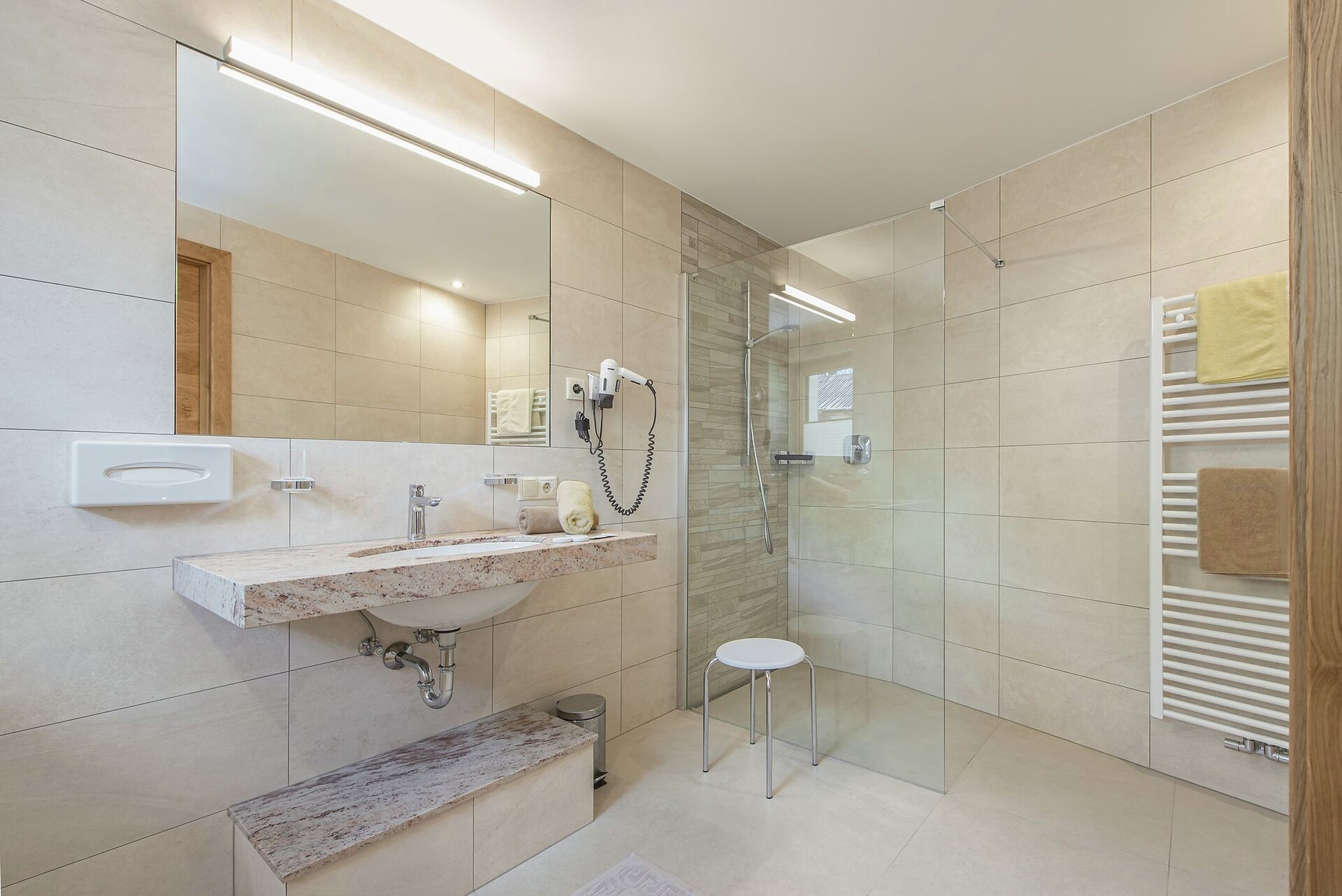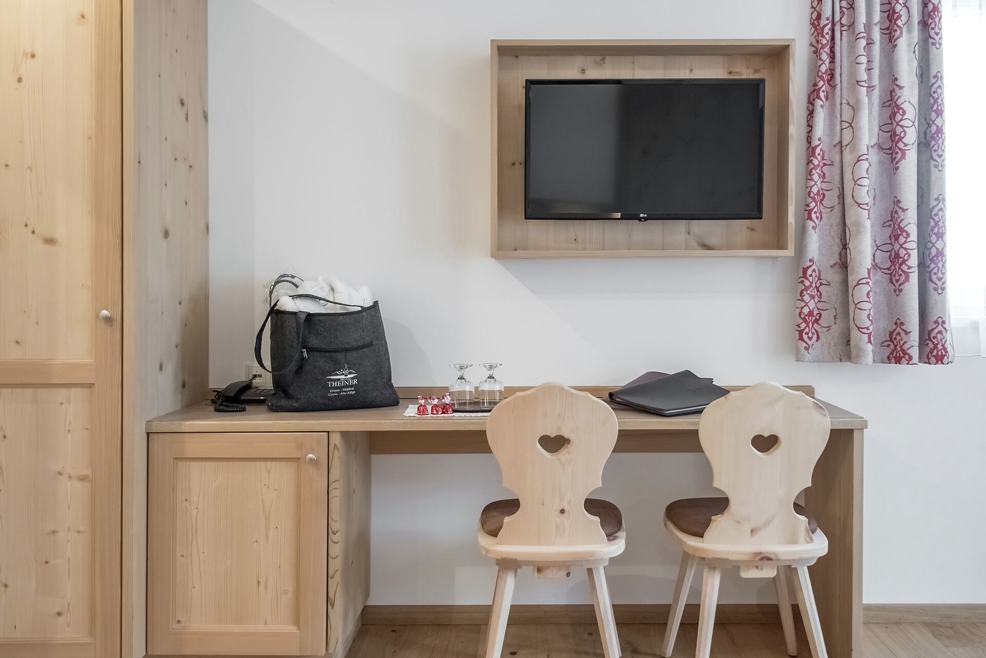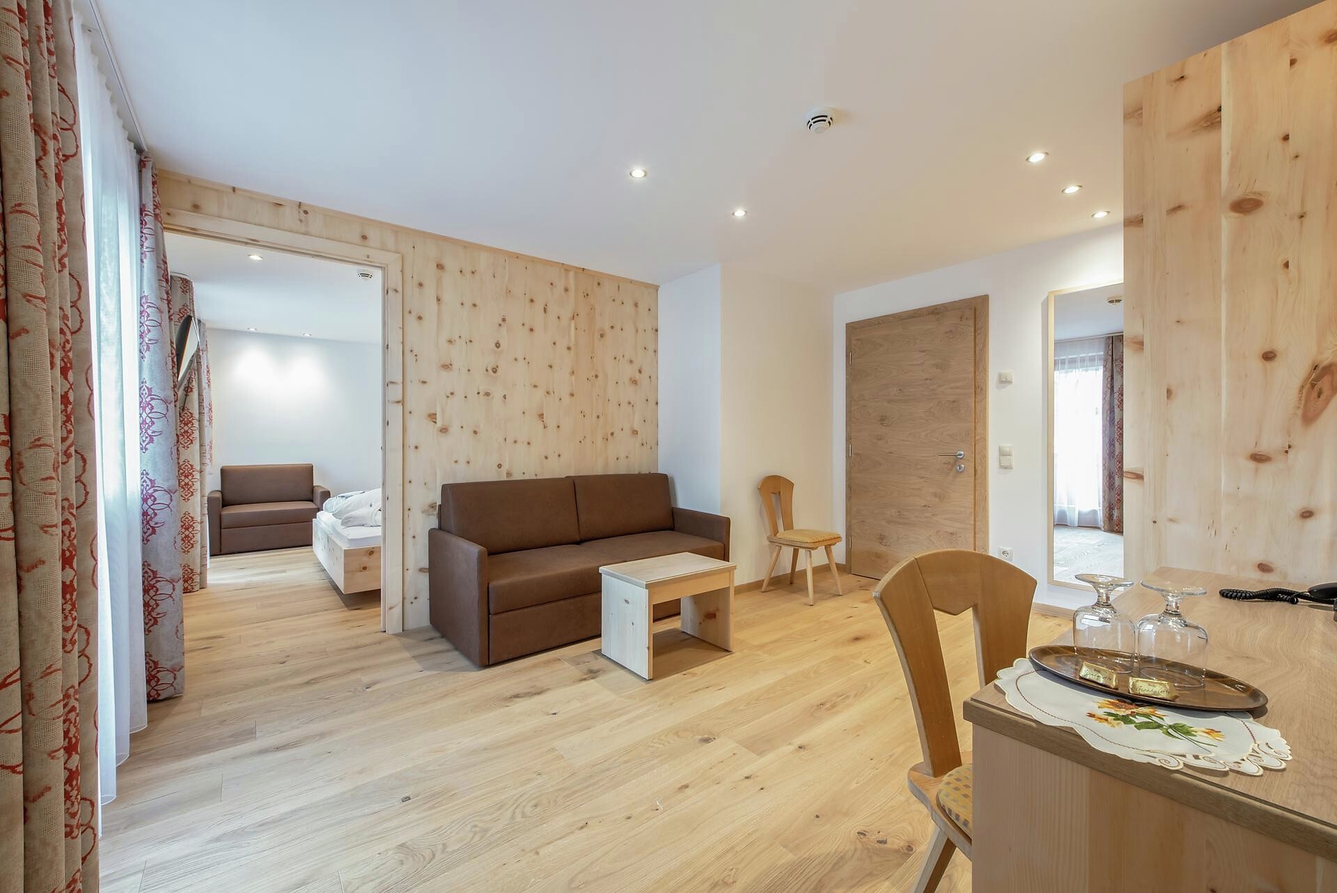 Newly built Alpin Relax rooms in a quiet location in the new building facing north-east, are equipped with solid wood furniture made of Swiss stone pine and oak parquet floors. The fragrant conifer wood, which is extracted from local allora pine, has been proofed to have positive effects for more restful sleeping. Though the Alpine Relax rooms have no own balcony, they still offer a nice mountain view. The facilities include a safe, desk, free WLAN. The bathrooms offer marble washbasins with shelf space, shower, toilet, hairdryer. The room contains bathrobes, terrycloth slippers as well as a wellness bag with sauna towels, which are included.
