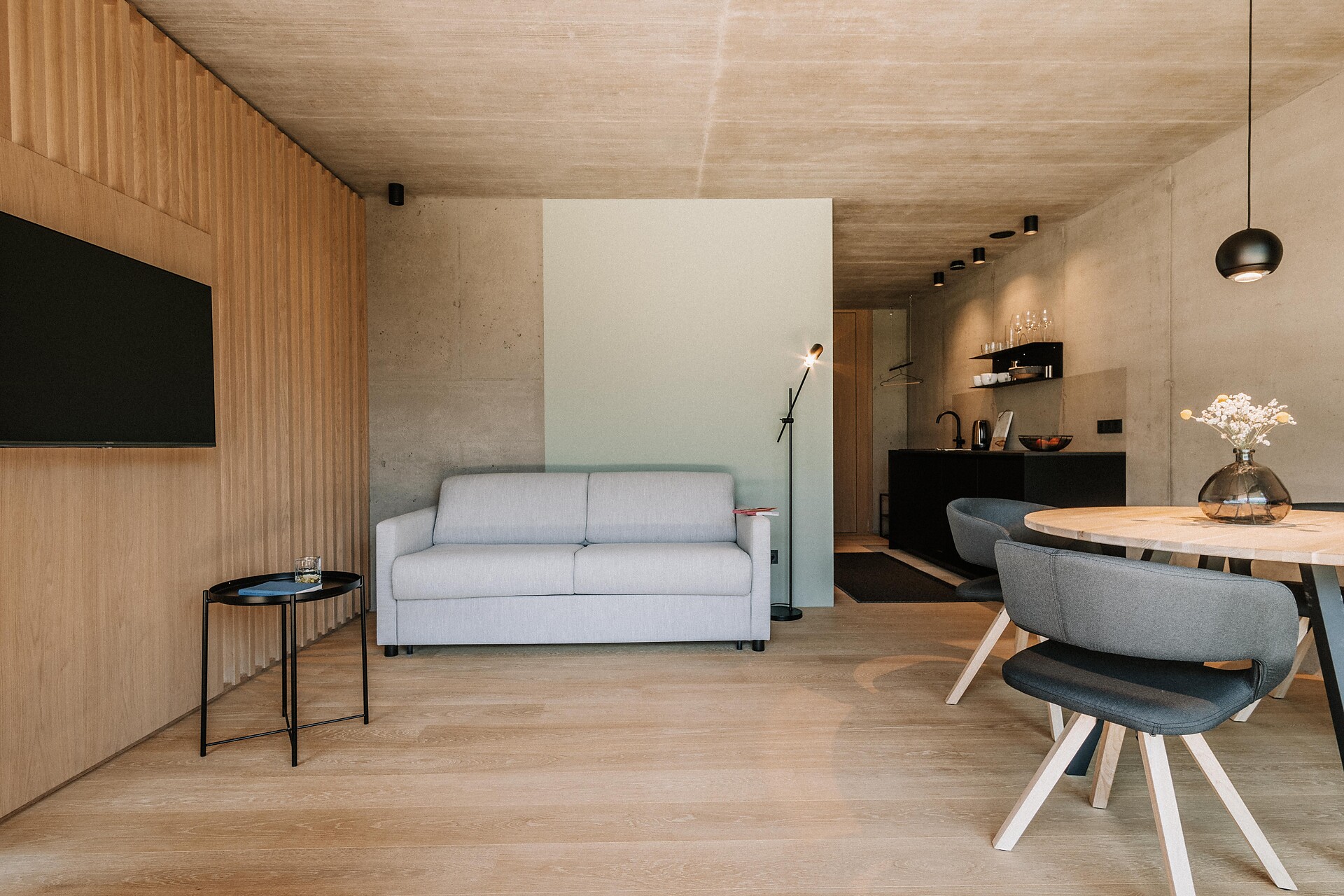 We offer a 42m² holiday apartment with an open living and sleeping area, as well as a large balcony and access to our garden with a bathing pond.