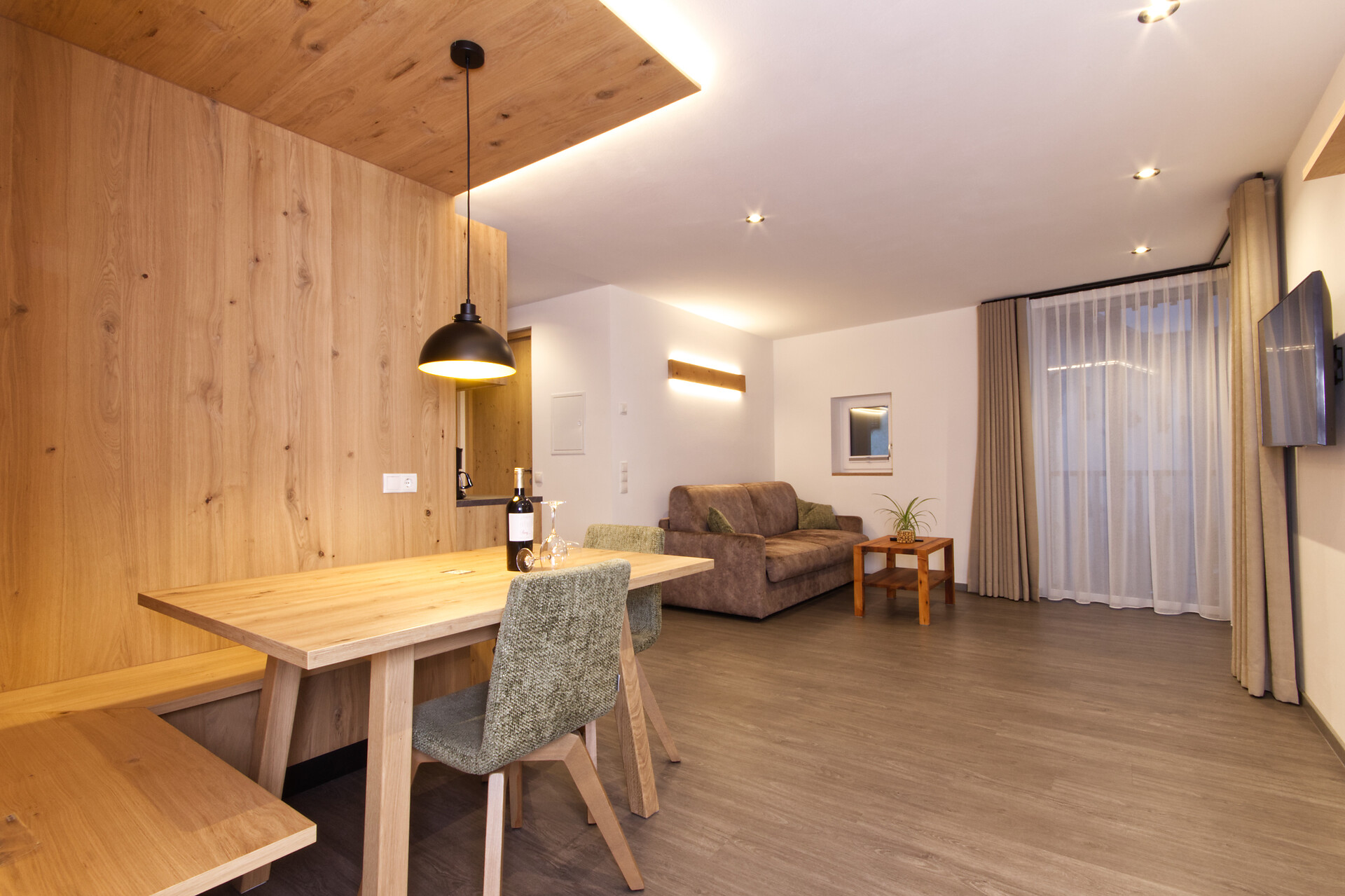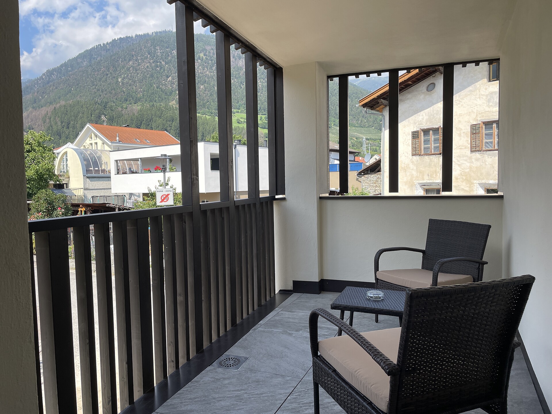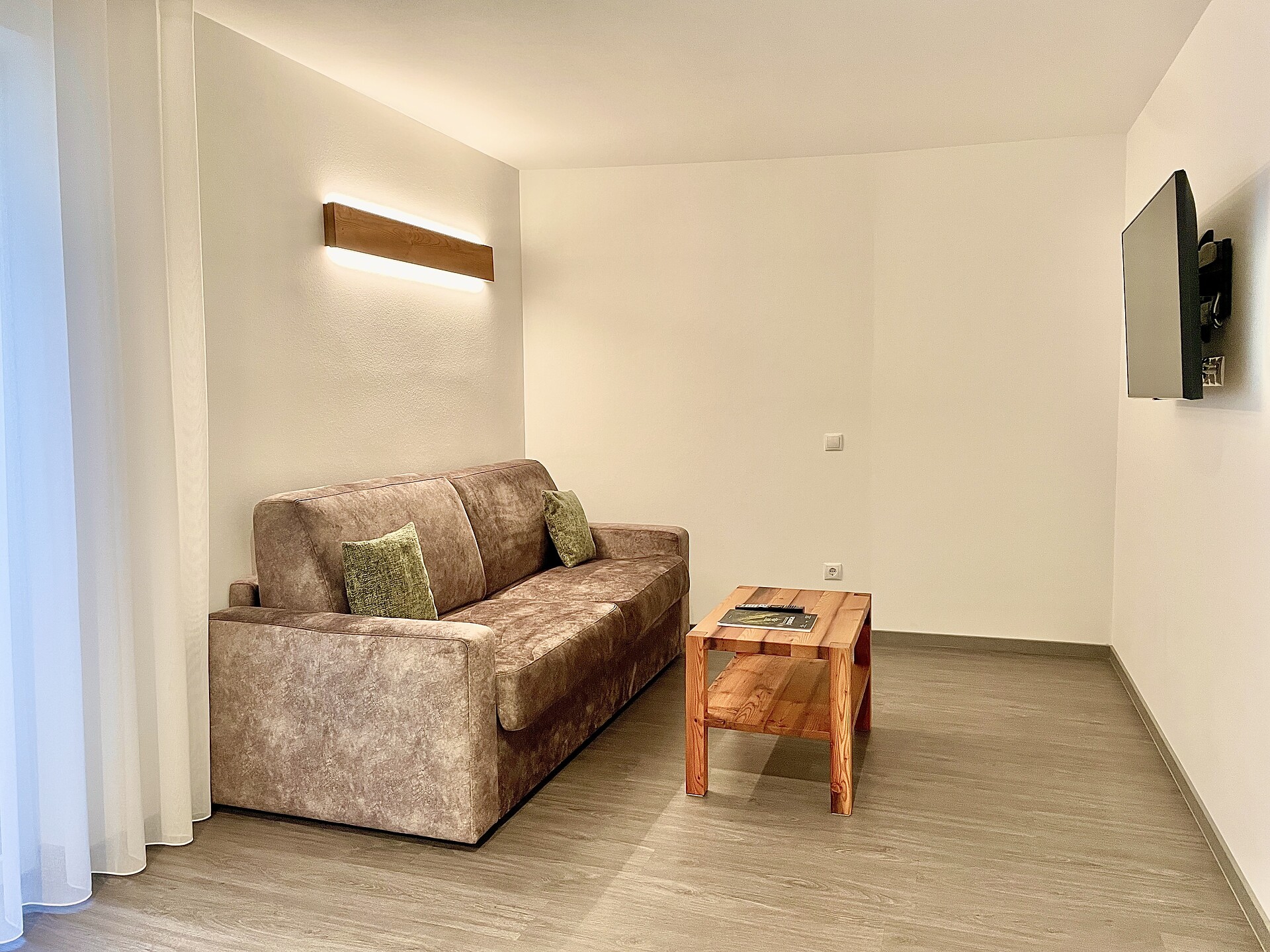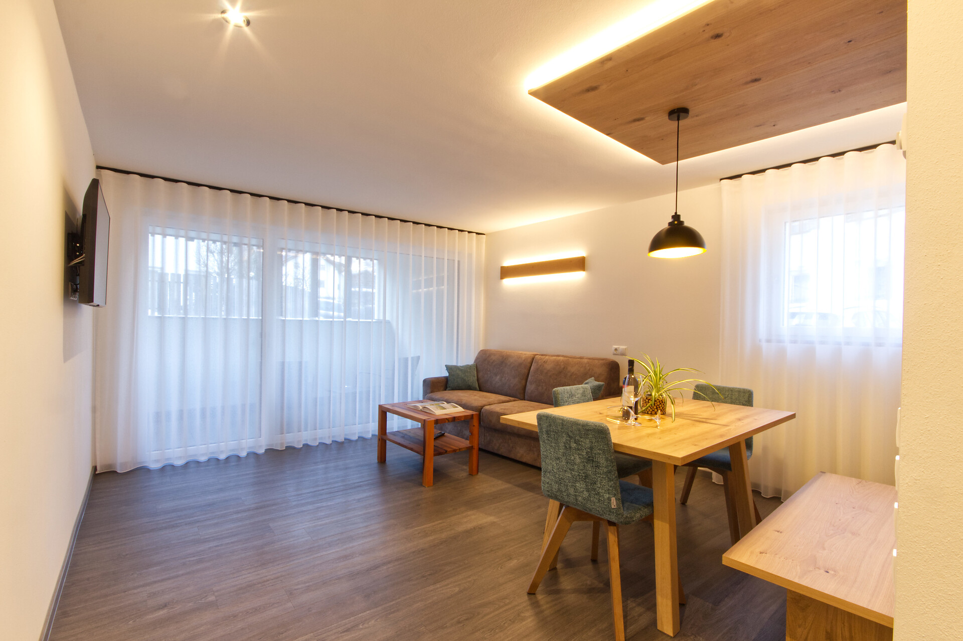 The "Montoni" apartment is on the 2nd floor and has a beautiful all-round view of the Venosta valley and the Prader town centre from the terrace. Like all other apartments, it has a cozy living area with a fully equipped kitchenette in addition to a separate bedroom.