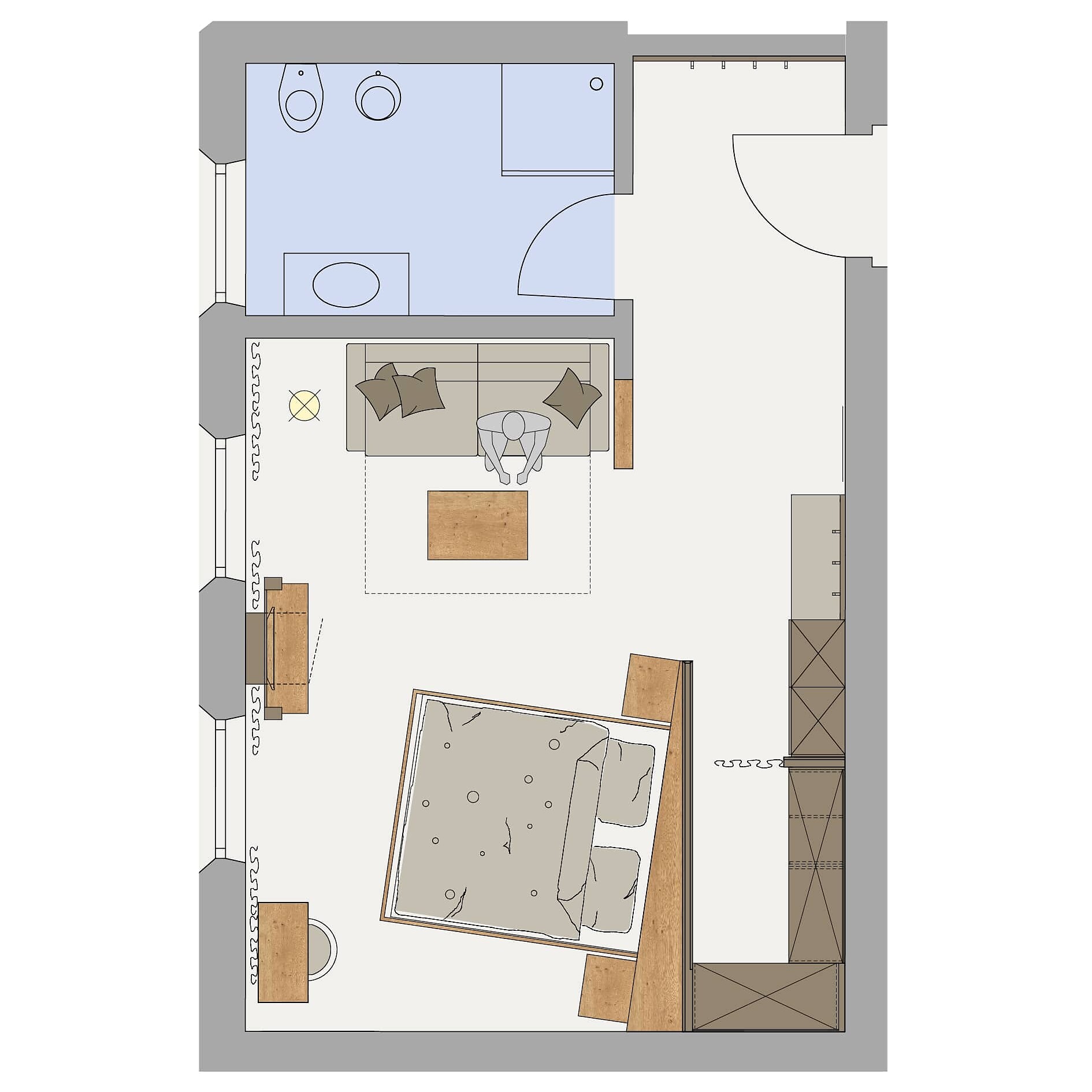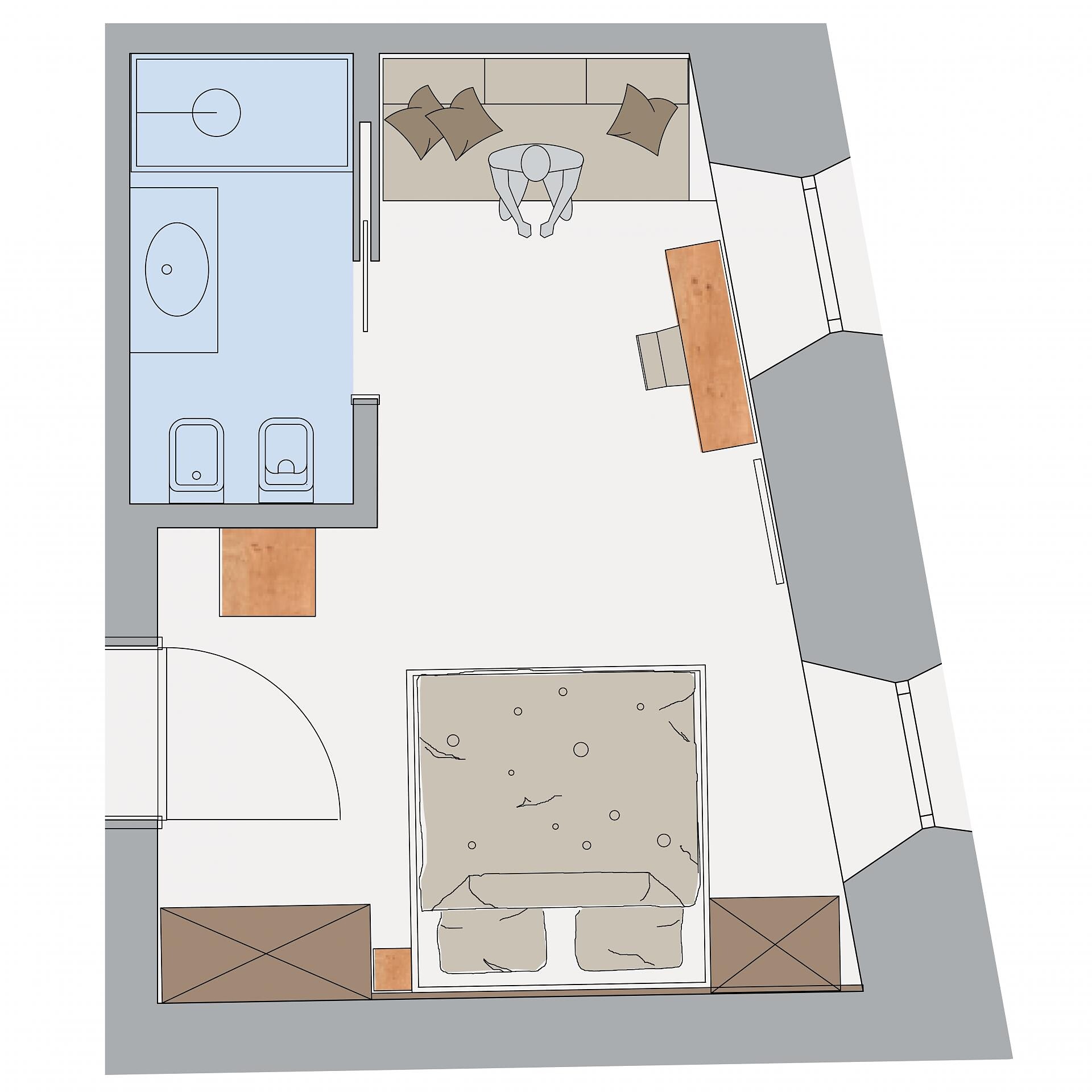 Double room, Double bed , Living area, Safe, Shower / Bath tub, TV, Satellite/Cable, Internet access