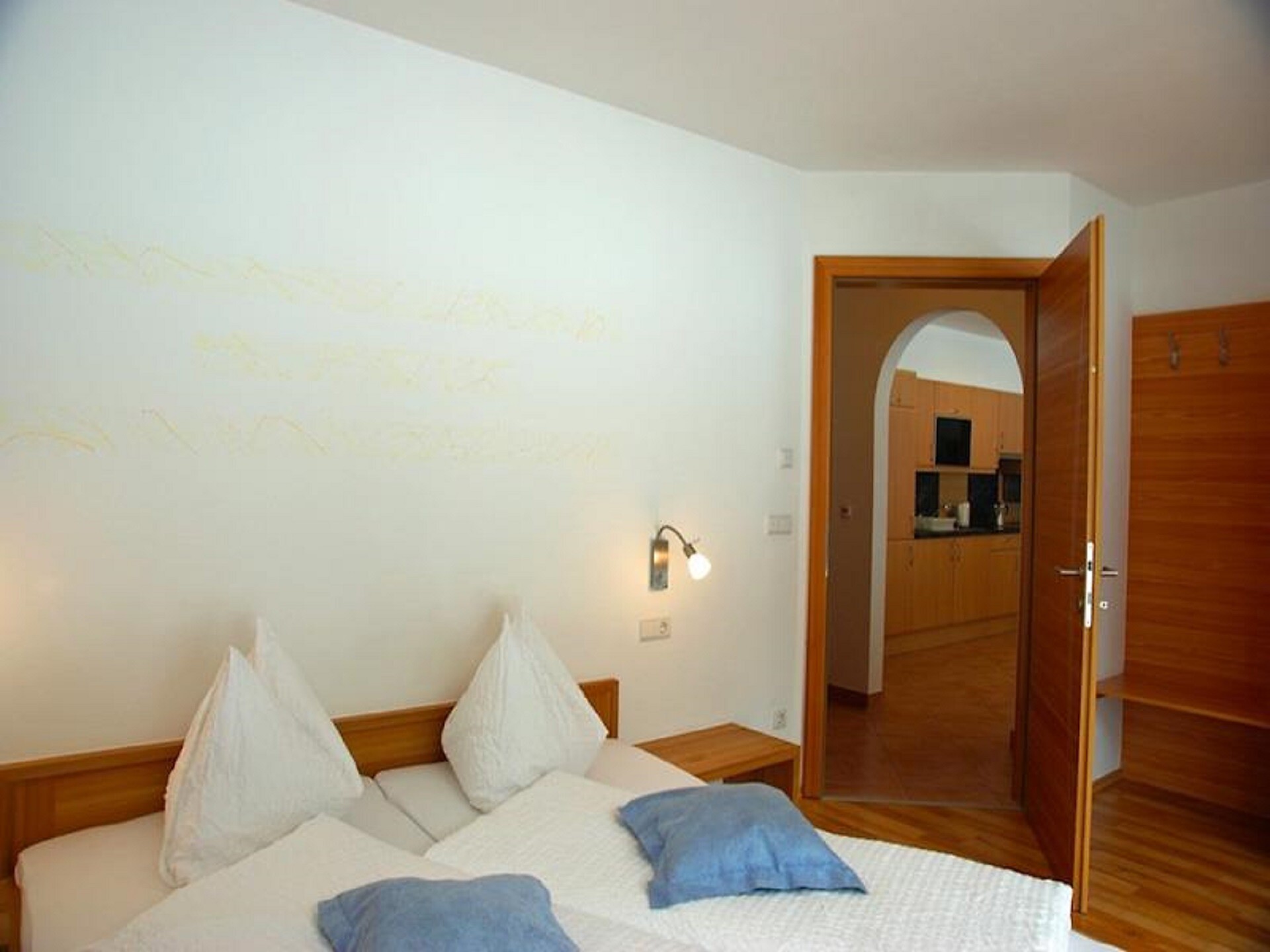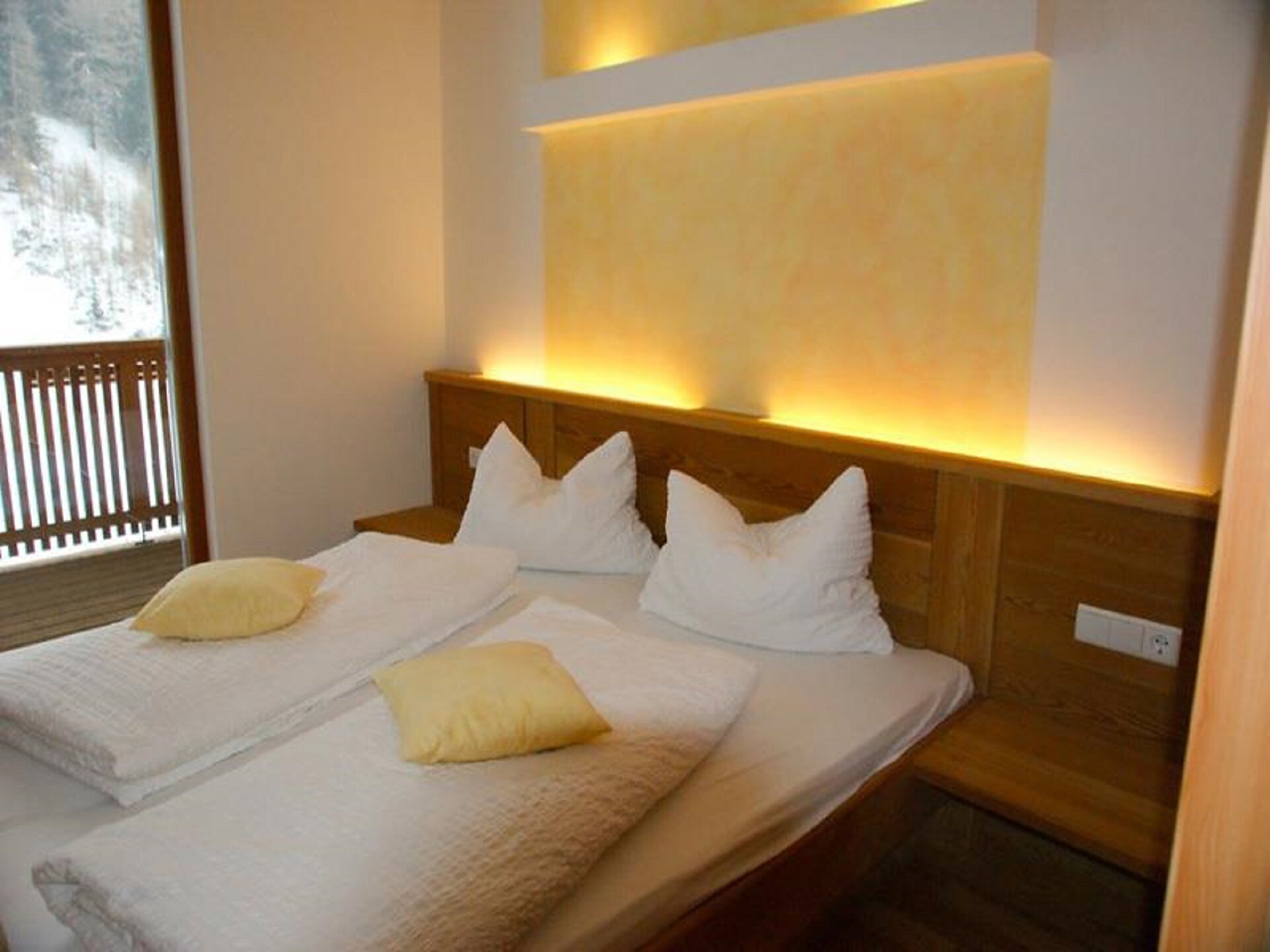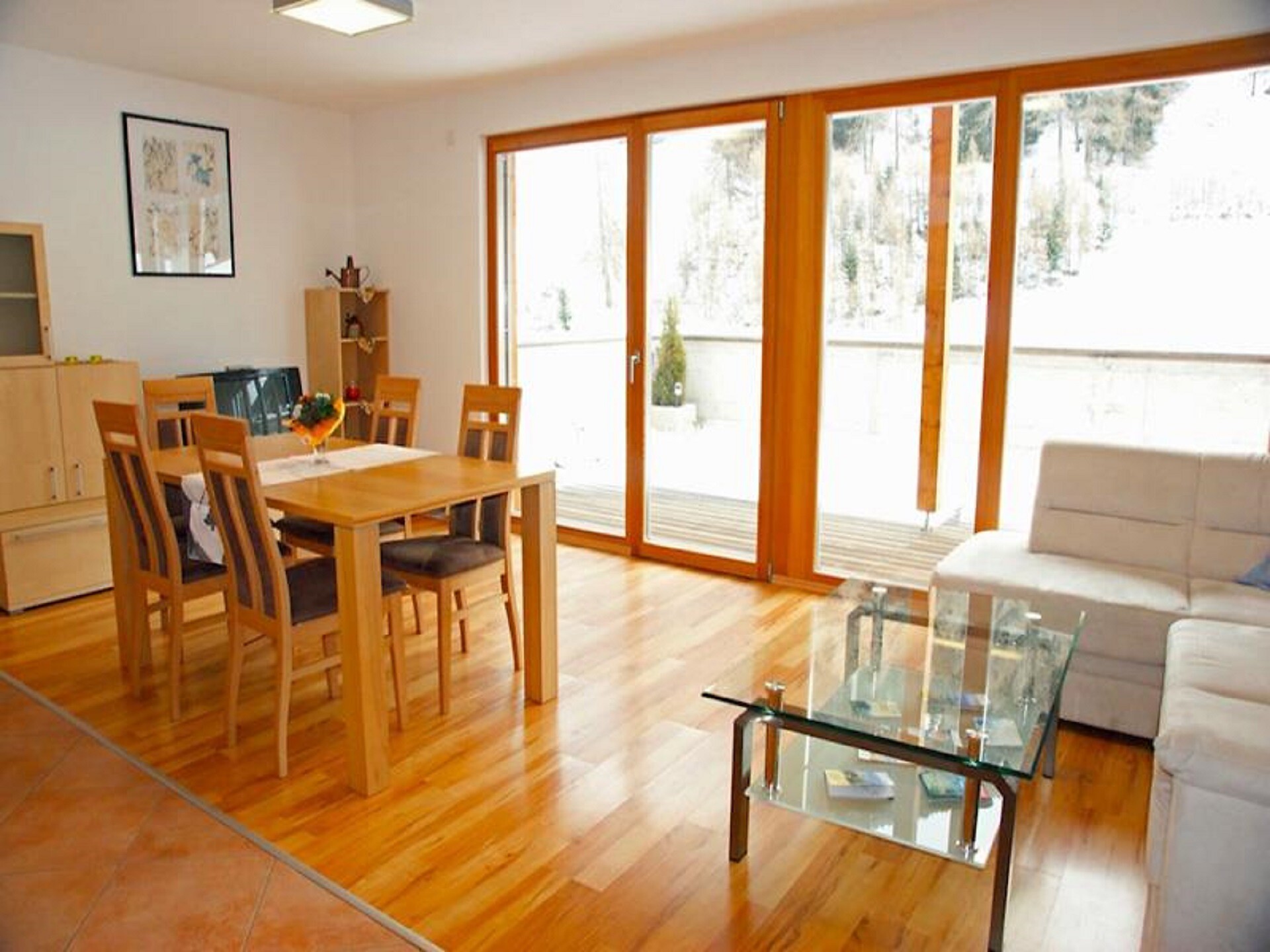 The bedroom adjacent to the terrace offers a wide view over the valley and into the forest on the opposite side. The second bedroom faces west, towards Switzerland, and also has access to the terrace.