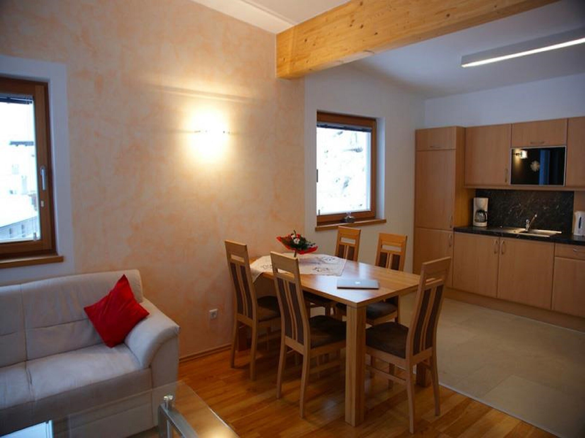 The apartment is located on the ground floor and has a living space of 70 m². It is south-facing and features a spacious open-plan living area with a fully equipped kitchen and a dining table for up to six people. A large sofa provides a comfortable seating area. Wi-Fi and a television are available.