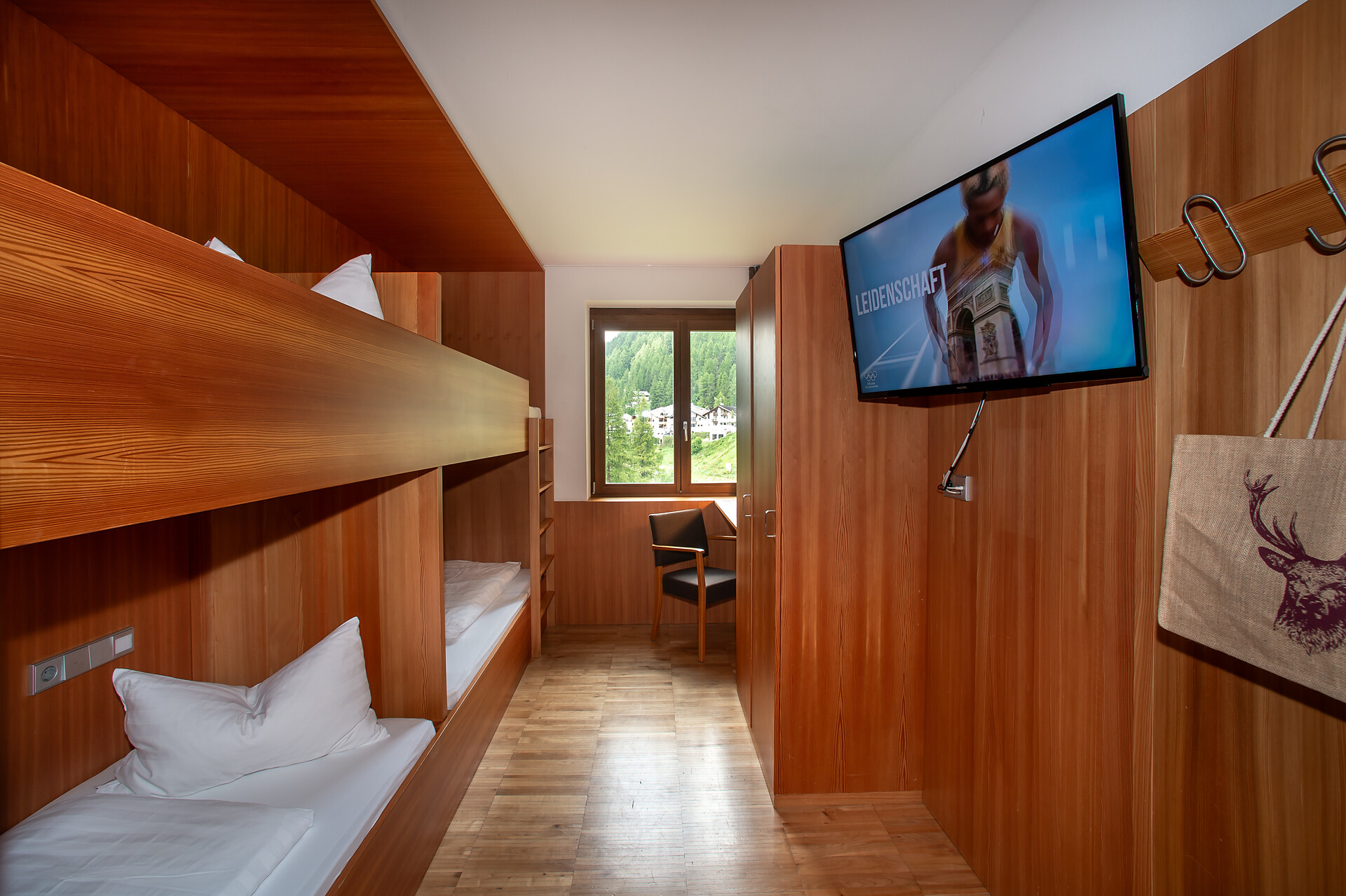 made of local larch. It also includes a 43-inch LED TV, synthetic pillows and beds,