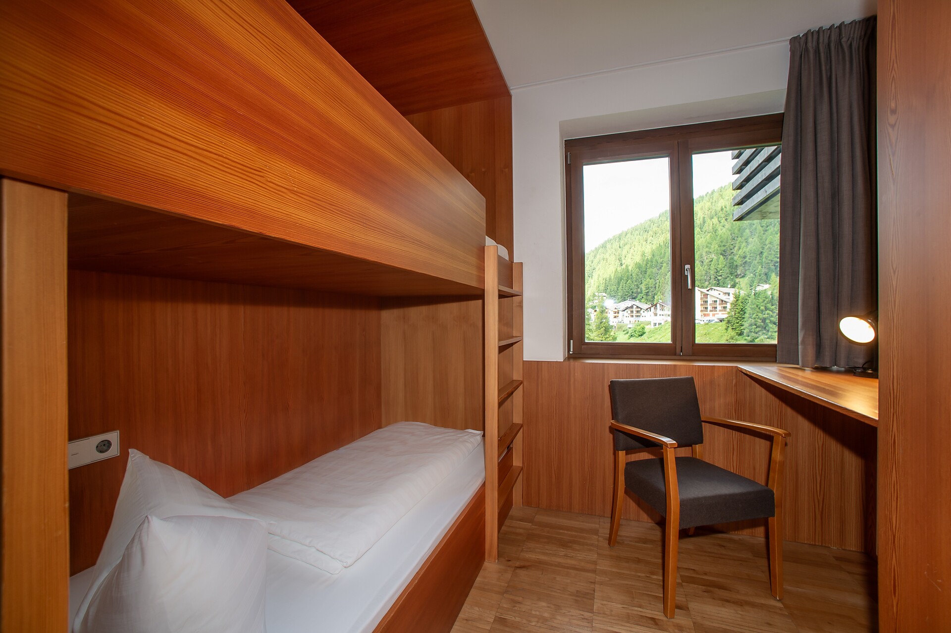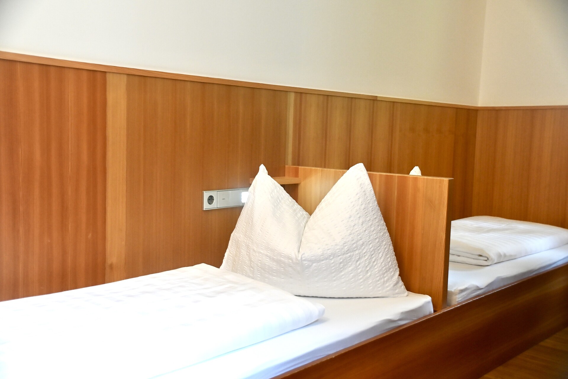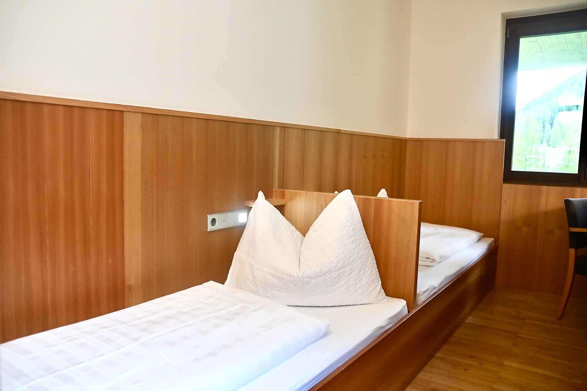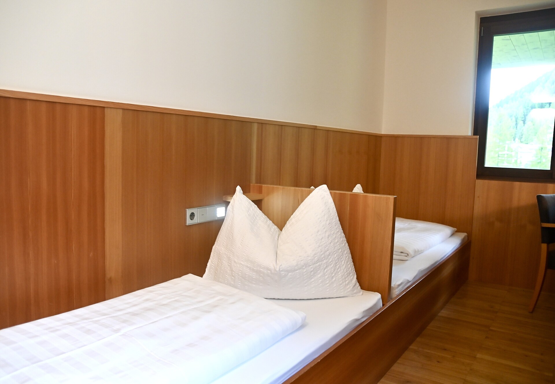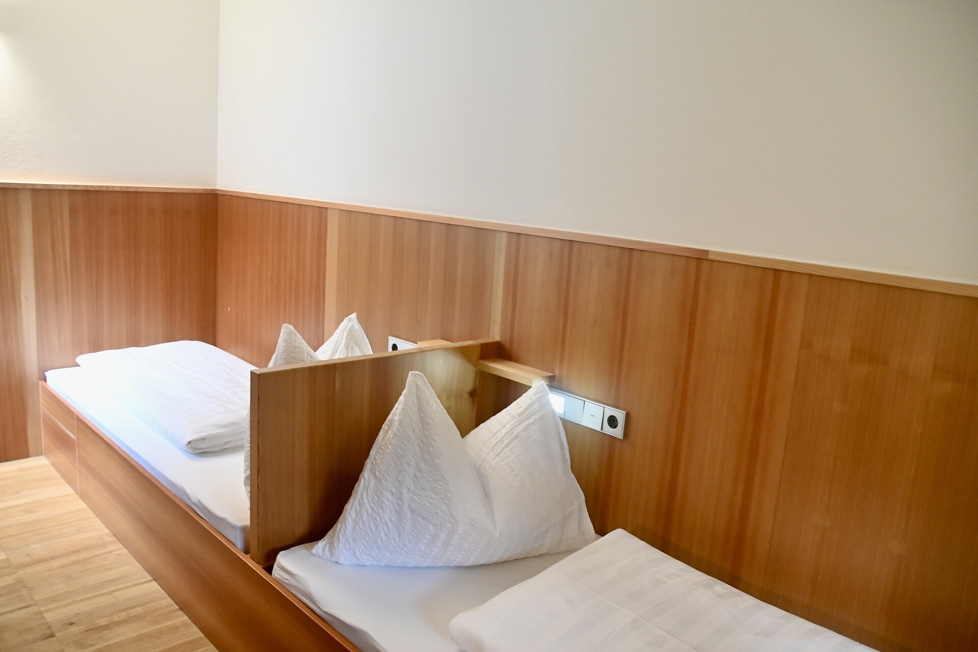 A cozy twin room awaits you with solid wood flooring (cherry) and furniture