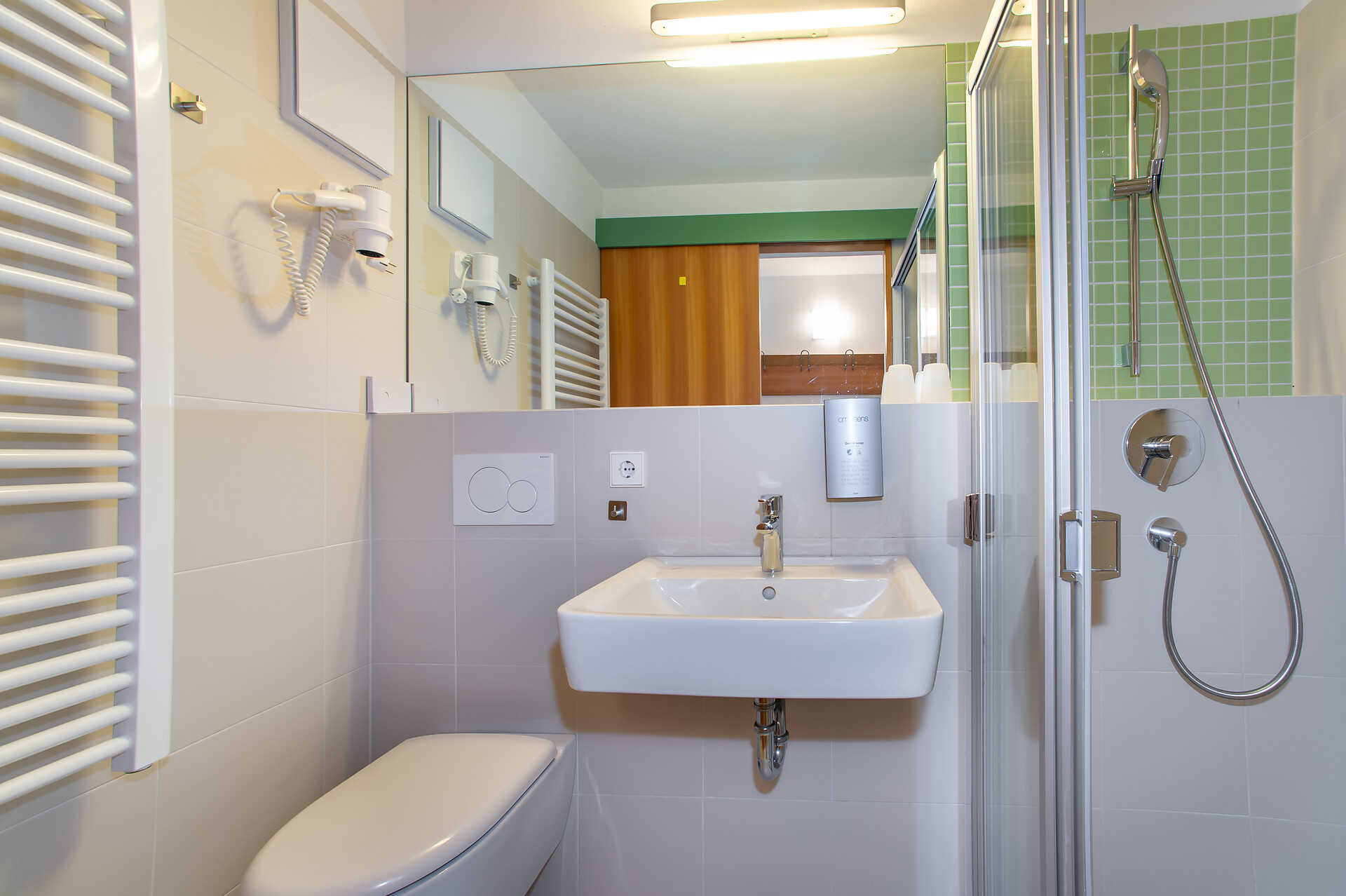you will find a shower, a hairdryer, and of course, toiletries and shower gel. And