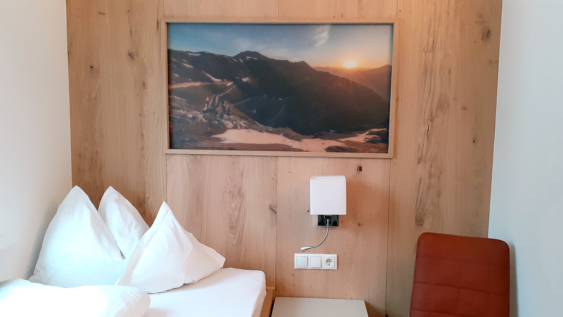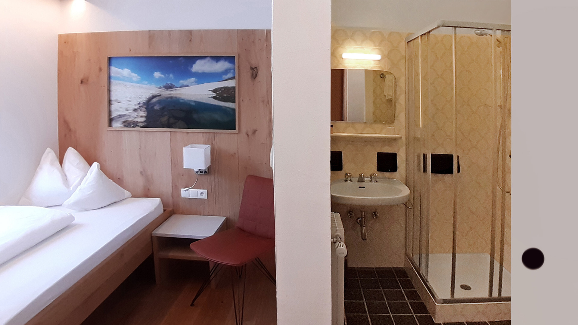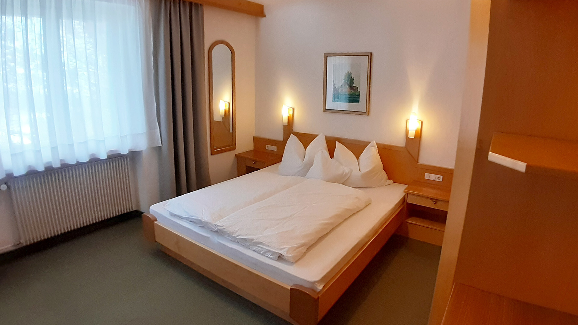 Double room with double bed, safe, phone, sat-tv and a small bath room with shower or bath tub, toilett and hairdryer. All rooms have a balcony on the south side with view on the Ortler.