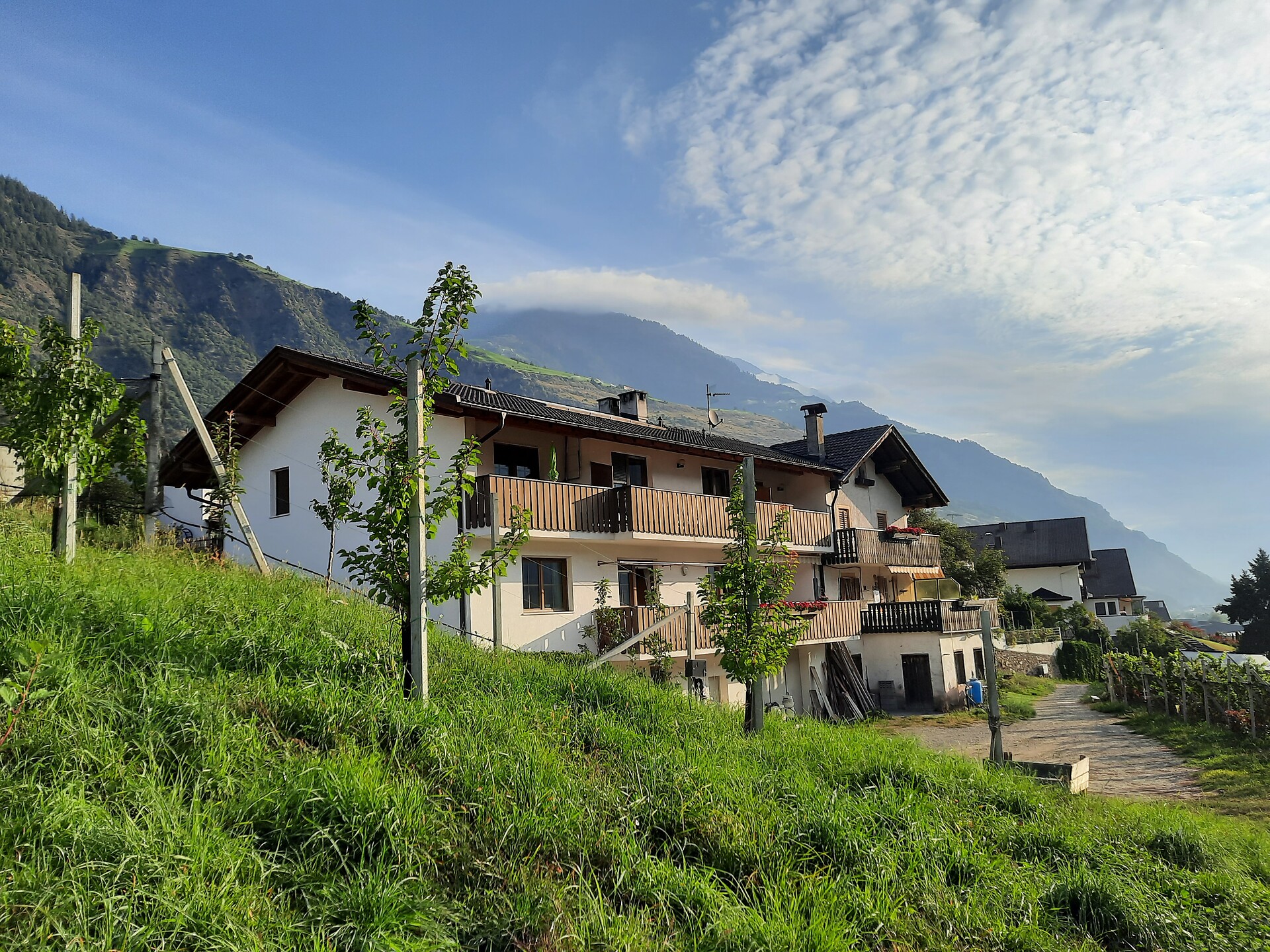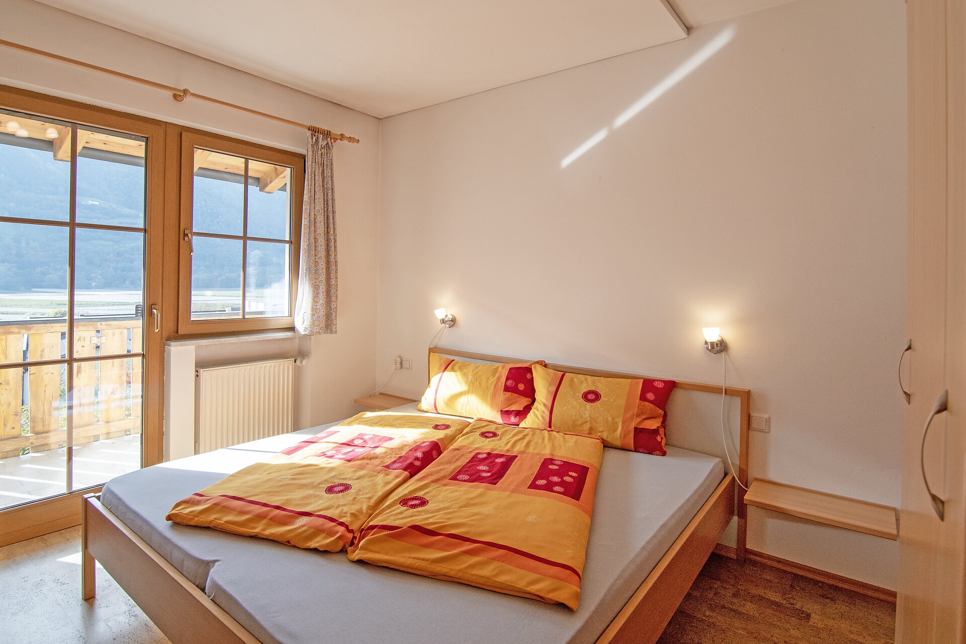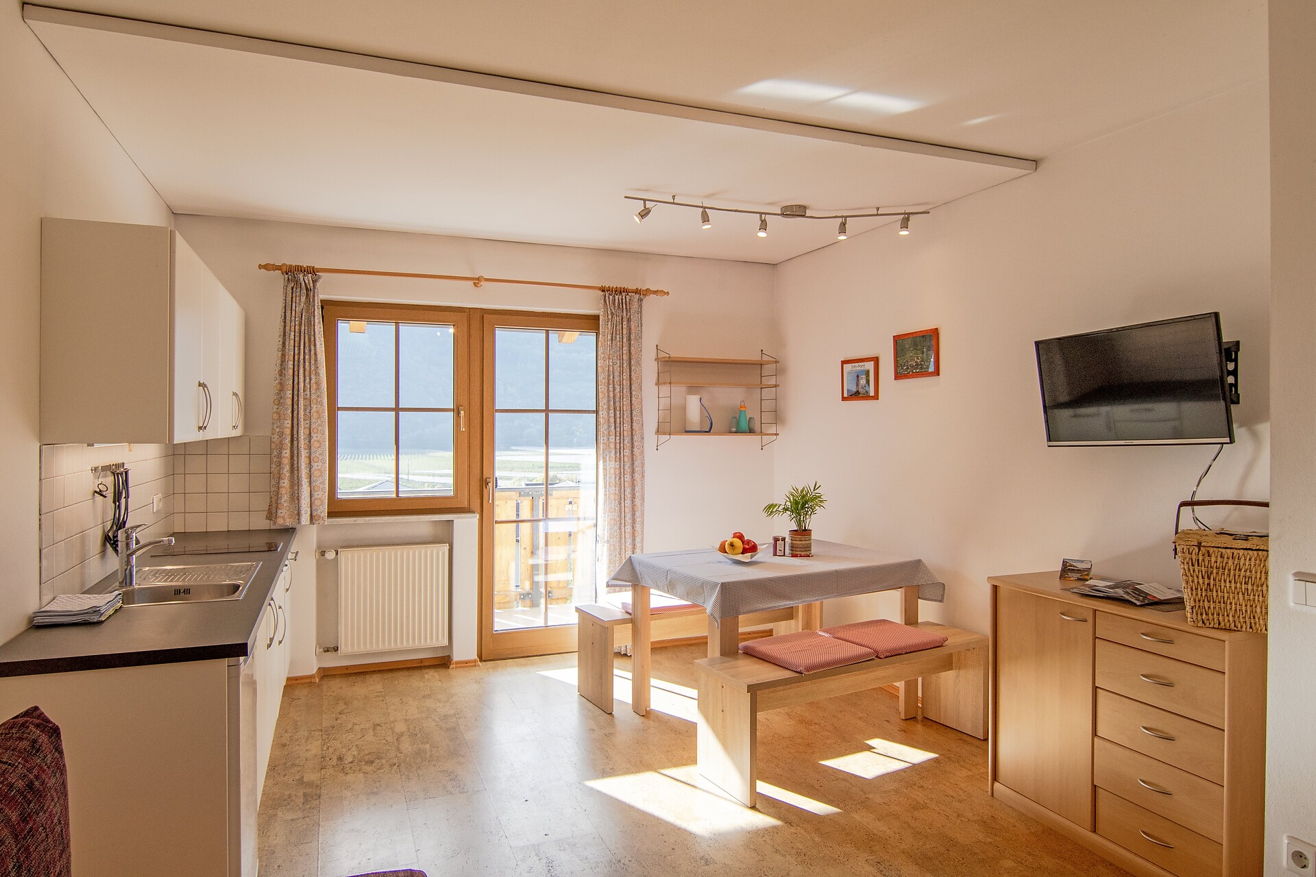 Our apartment „Goldregen“ has a bedroom with a double bed, a kitchen / living room with a pull-out sofa bed and a kitchenette with a 4 burner and an oven, a shower / toilet and a south-facing balcony with a view of the wide valley. The price includes bed linen, hand towels, dish towels and the final cleaning.