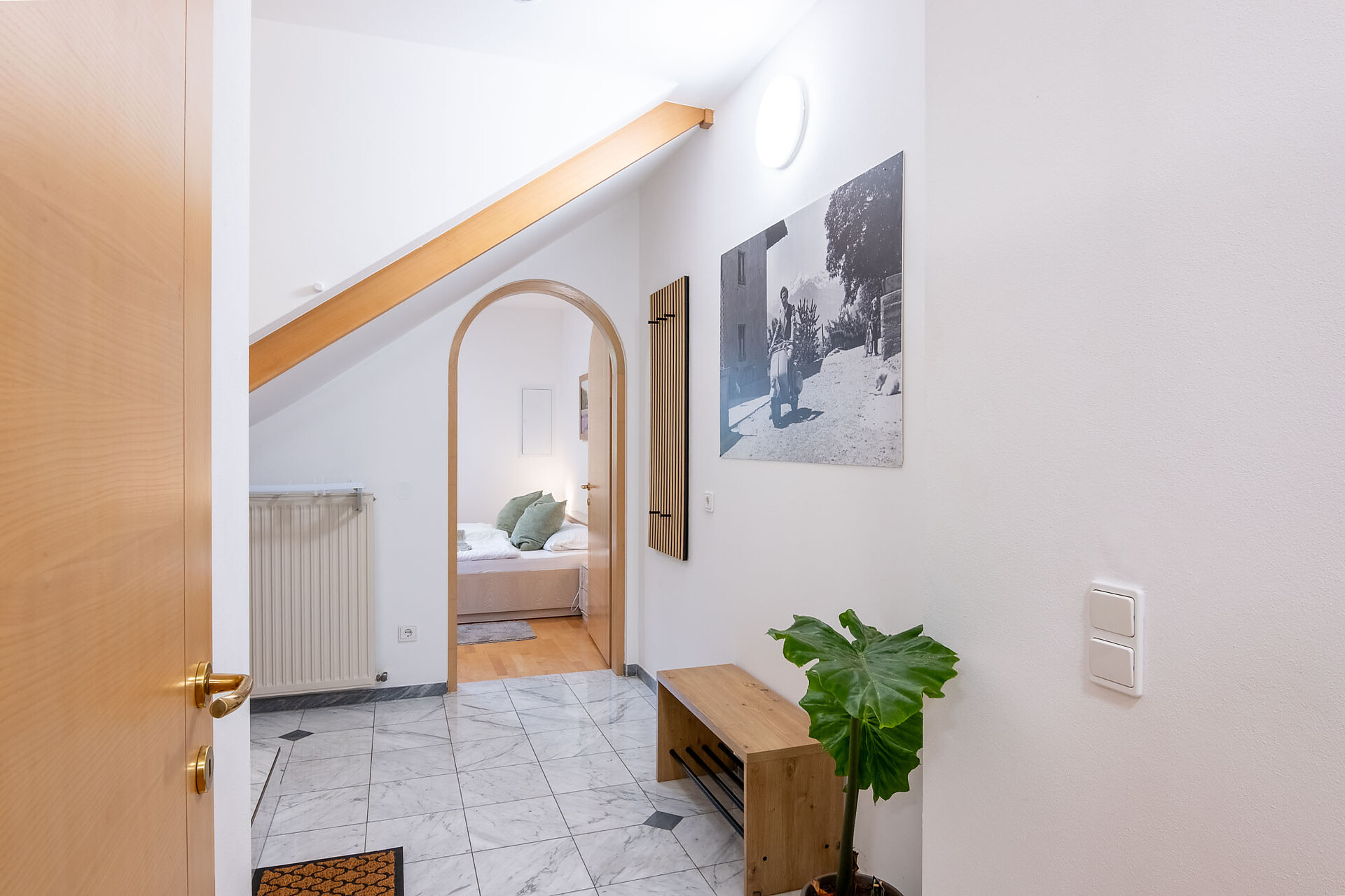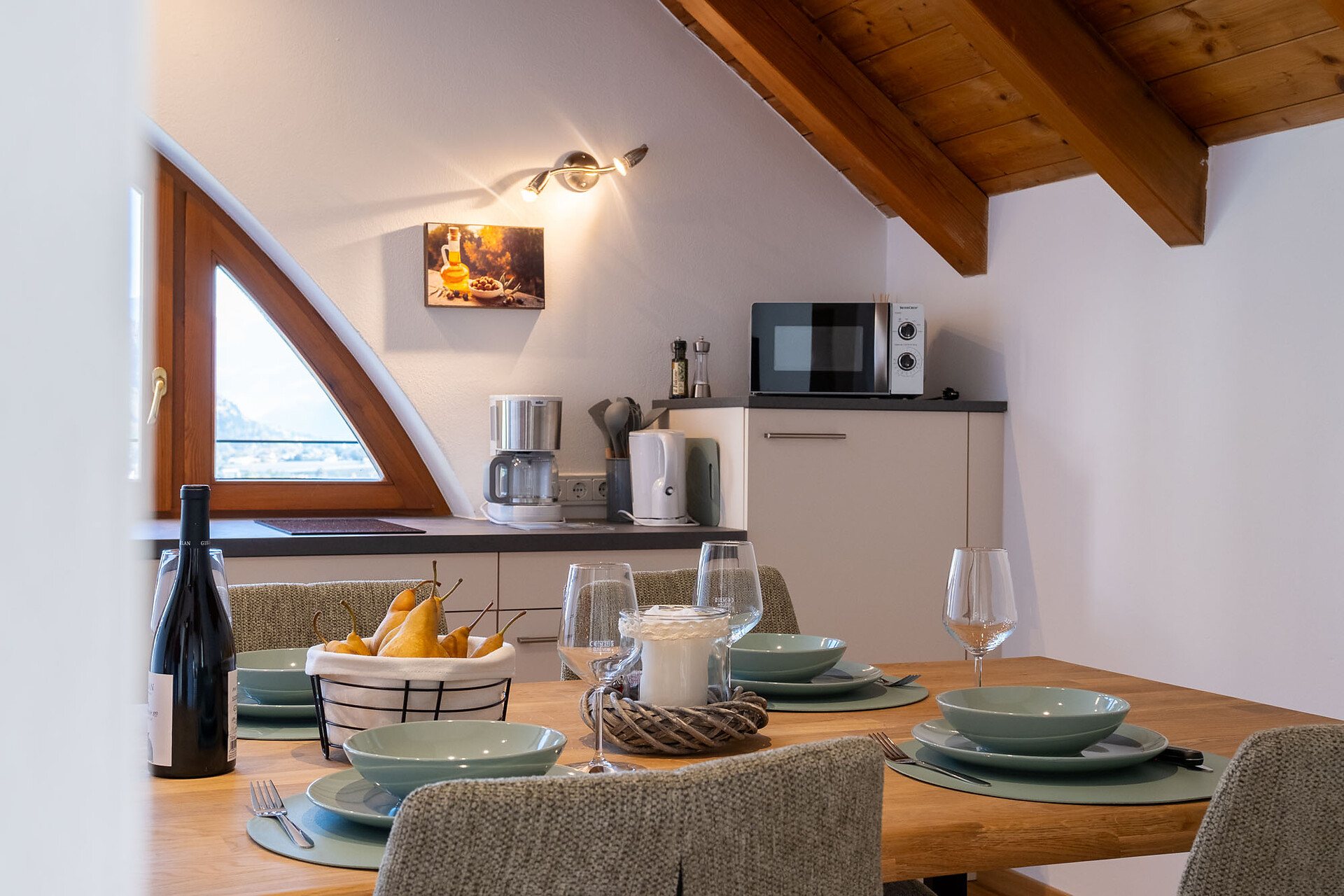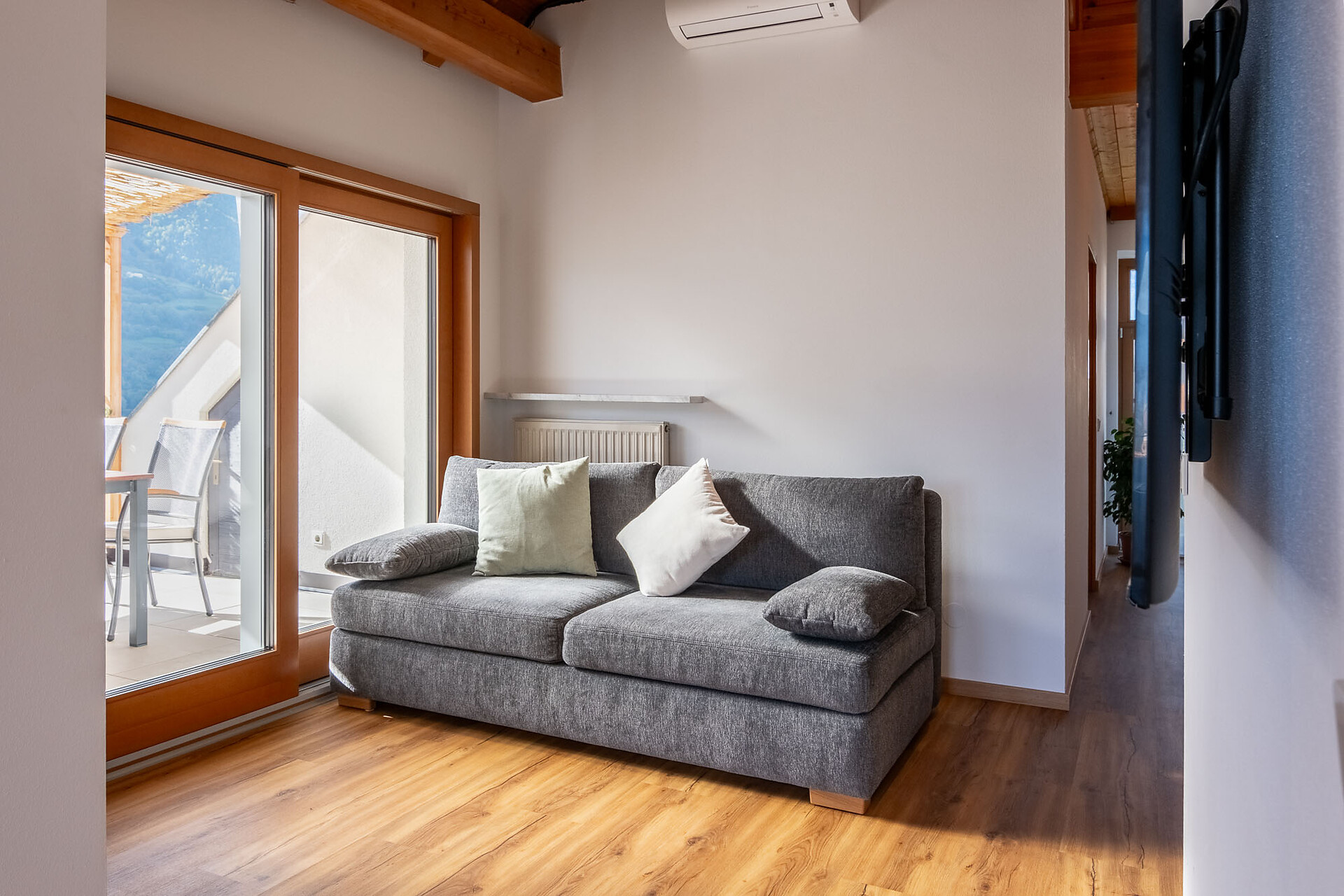Located on the second floor, Apartment B impresses with its bright, open concept – an excellent choice for couples and families. Highlight: a sheltered panoramic terrace facing south, plus a small balcony with views of Juval Castle.