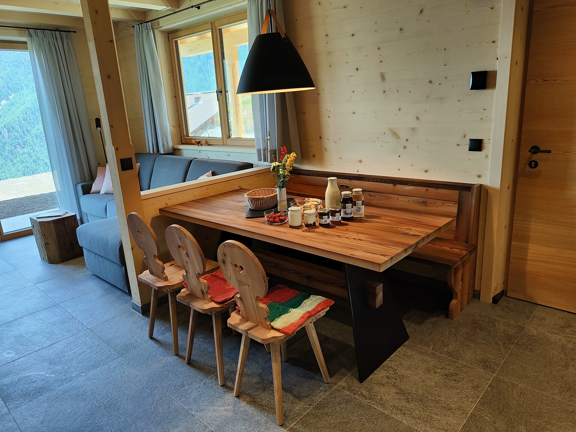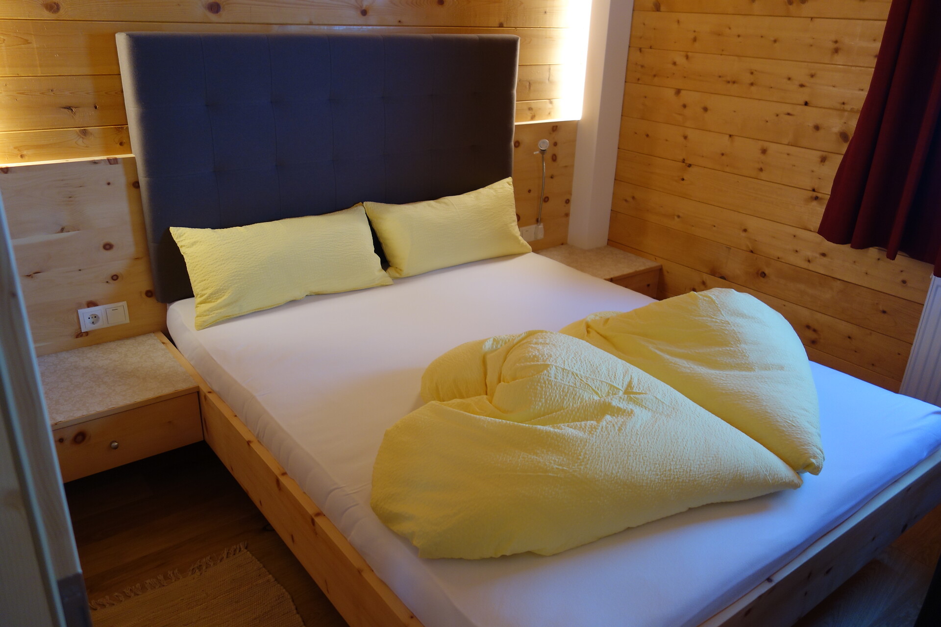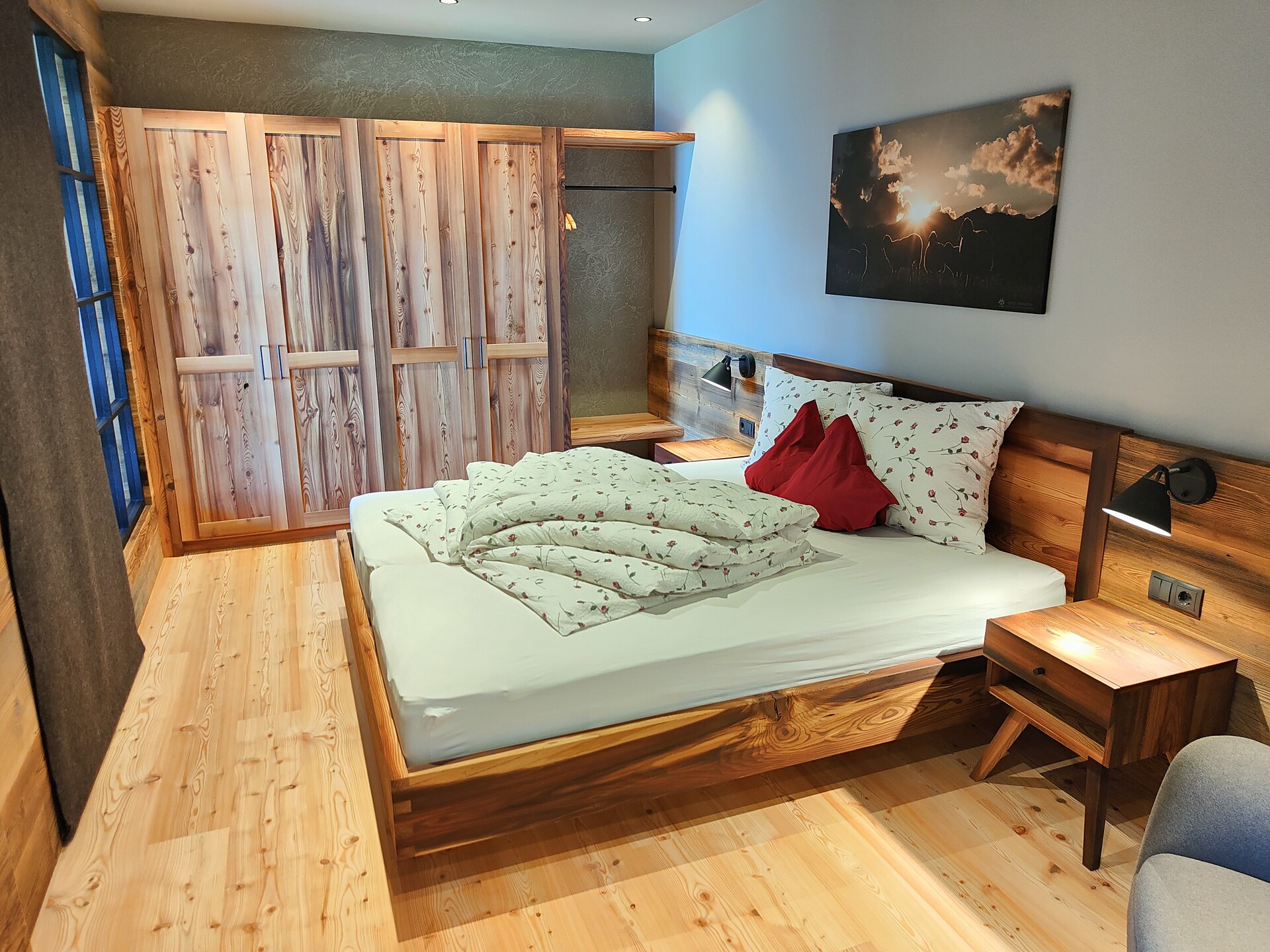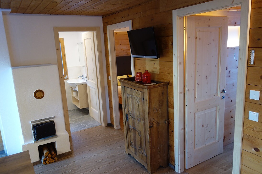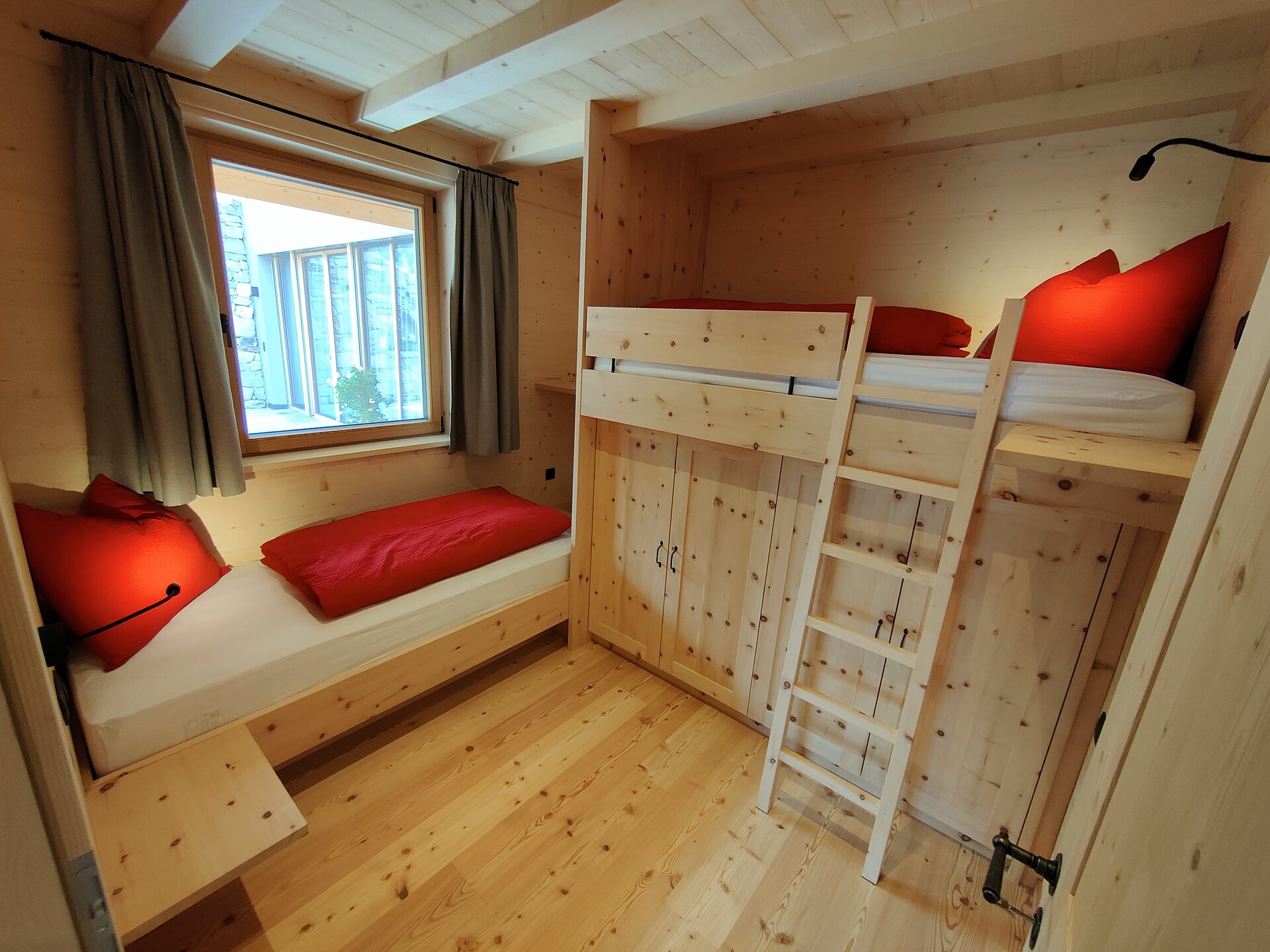 • Natural larch wood floor and furniture made of Martello stone pine in the sleeping area