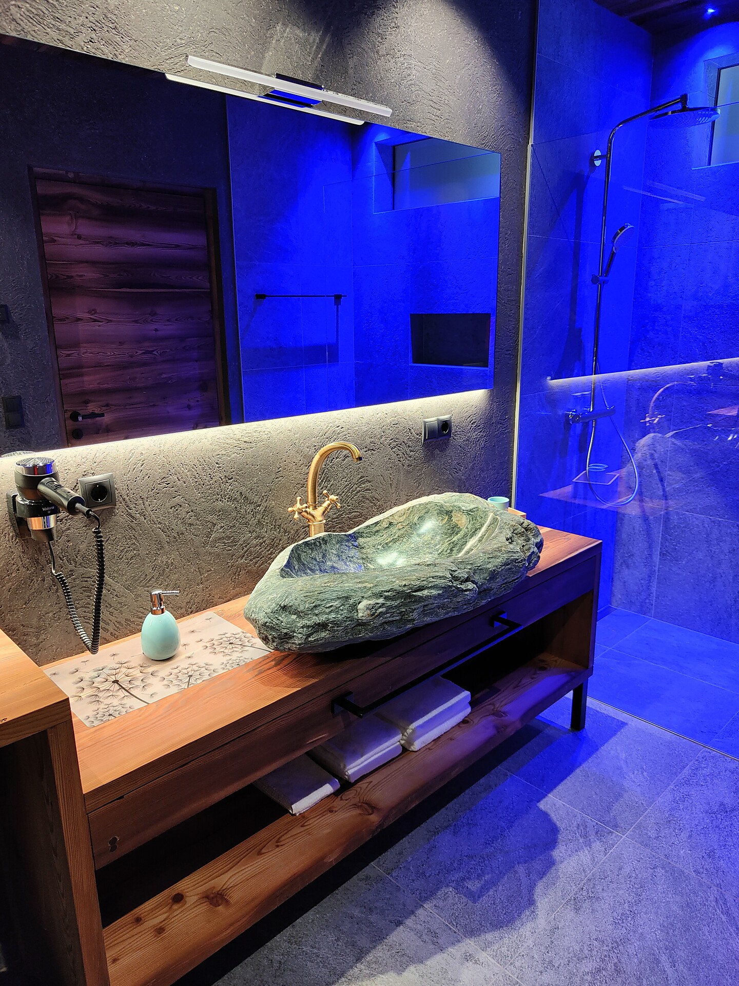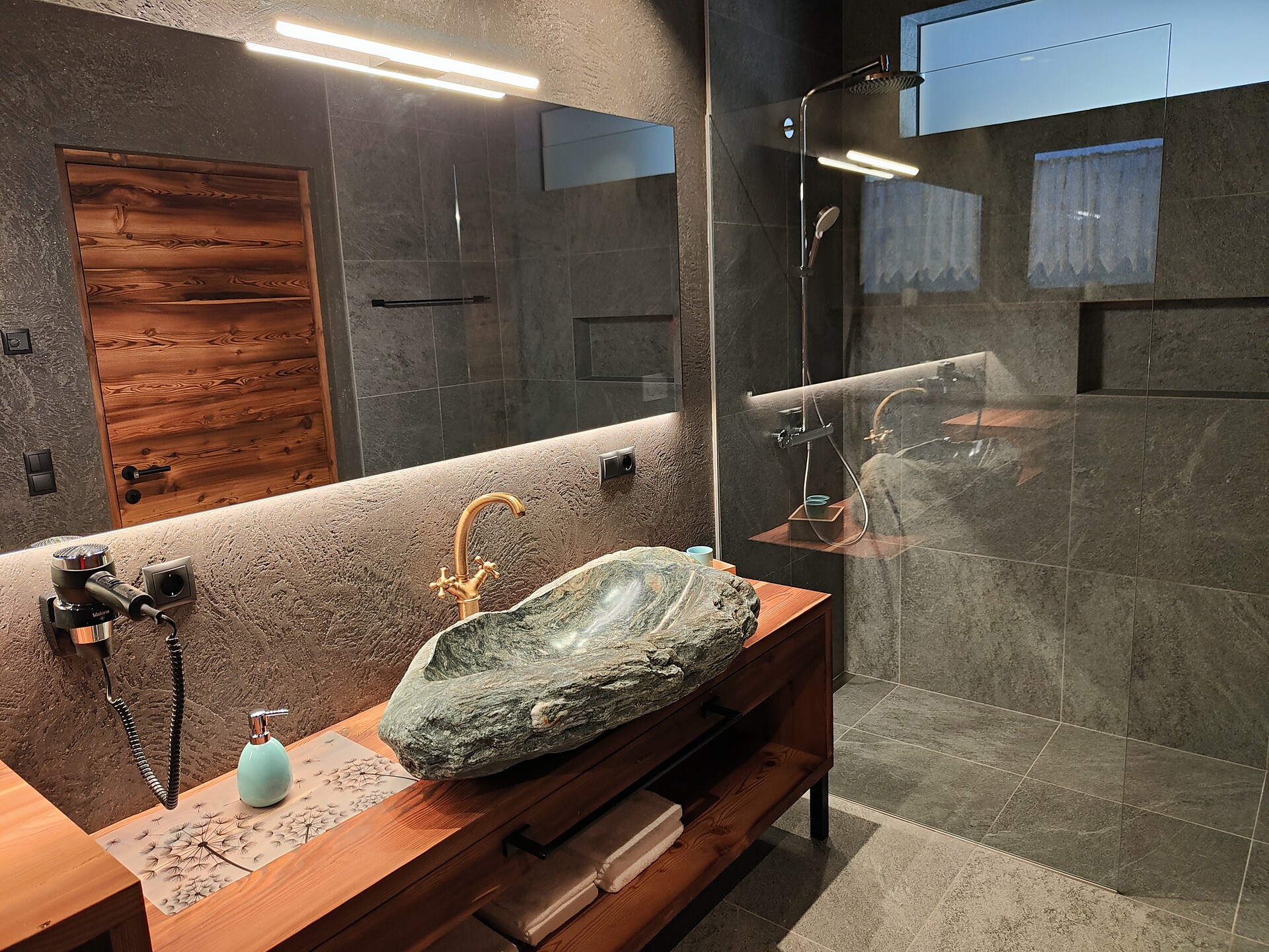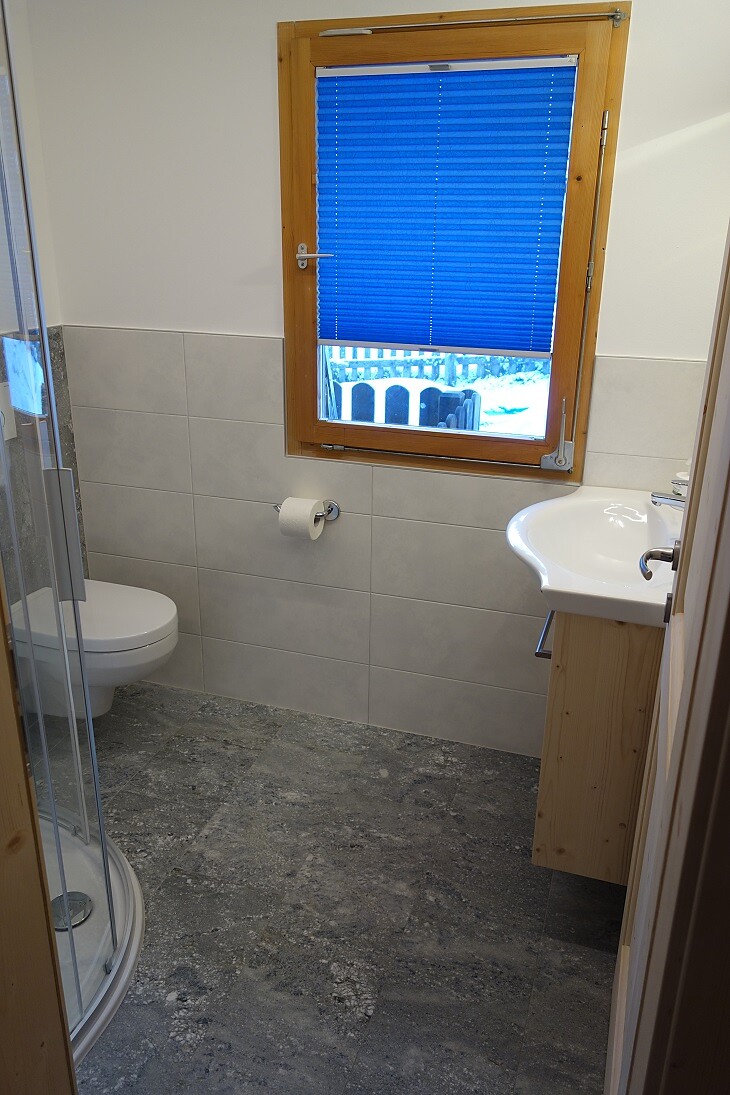 • Bathroom with washbasin made of natural stone, shower, toilet and bidet, underfloor and wall heating, hair dryer