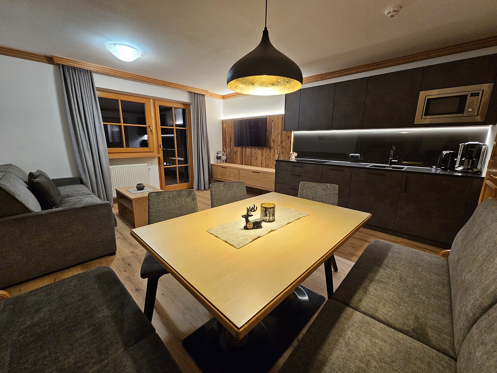 Double bed , Cot, Double sofa bed, Bed linen provided, Safe, Non-smoking apartment, 2 or more bedrooms, Eat-in kitchen, Coffee machine, Dishwasher, Electric cooker, Microwave, Cutlery provided, Hob, Shower/Bath tub, 2 or more bathrooms, Hair dryer, Towels, Bathtub, Apartment with sauna, TV, Satellite/Cable, WLAN, Internet access, Main building, Panoramic view