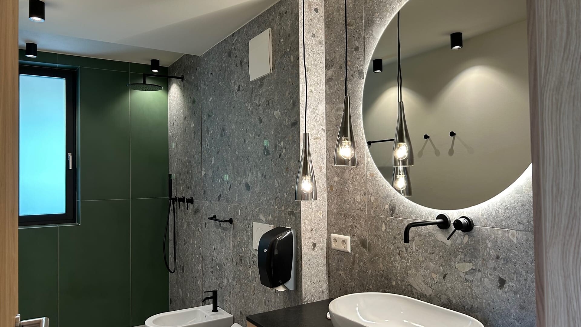 bathroom with shower, washbasin, WC