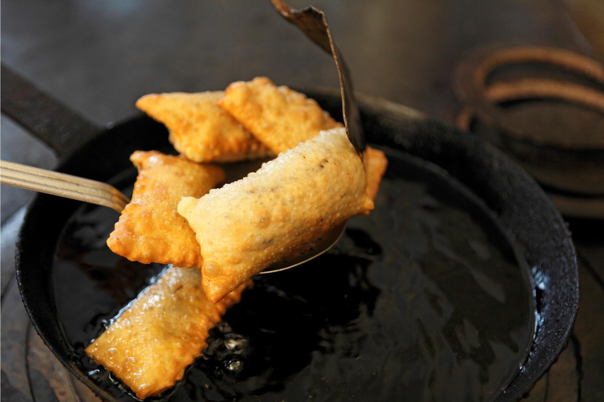 Roll out the dough thinly and cut into strips about 10 cm wide. Place half a tablespoon of filling on one side, fold over, press the edges well and cut with a pastry wheel.