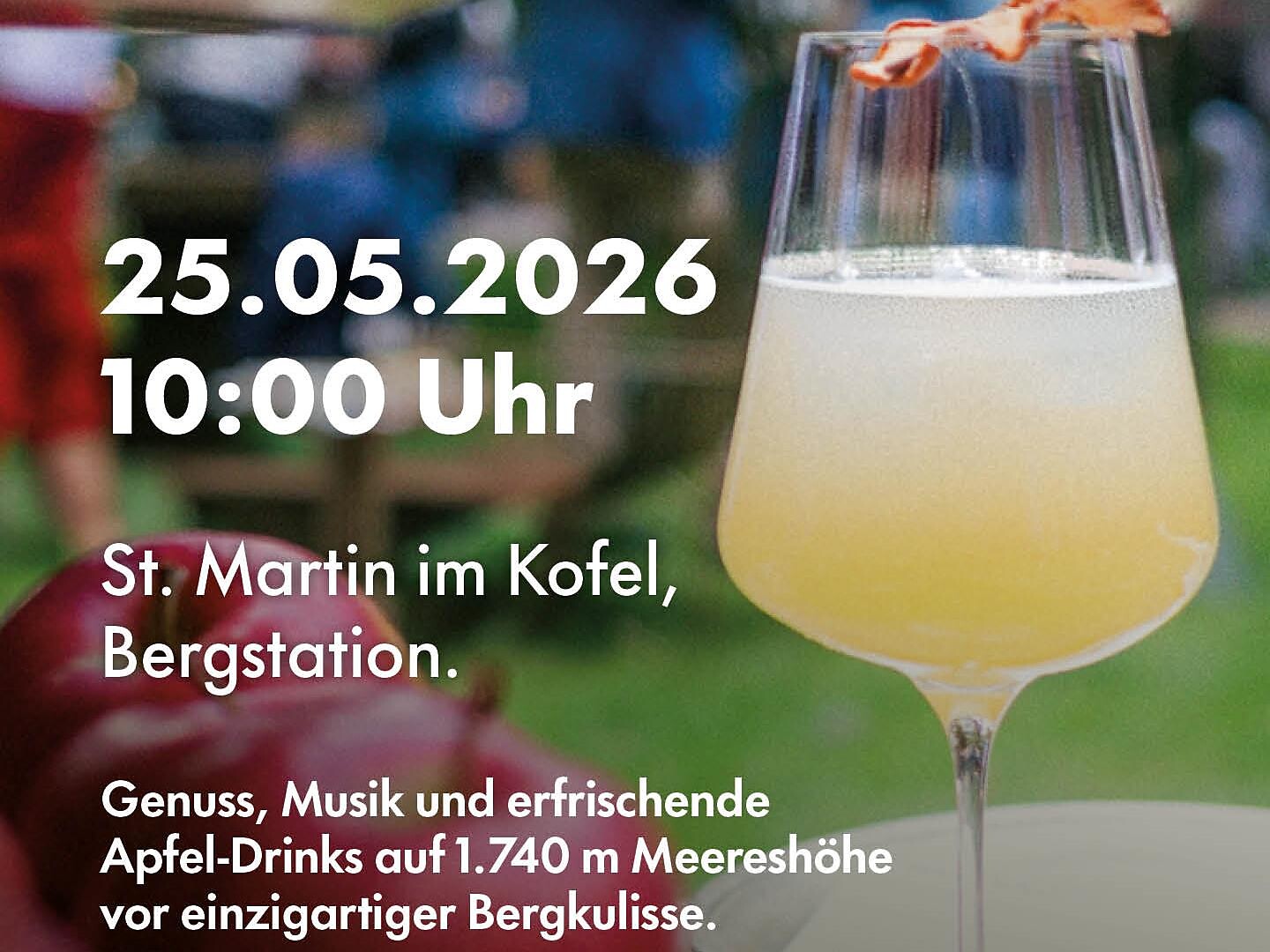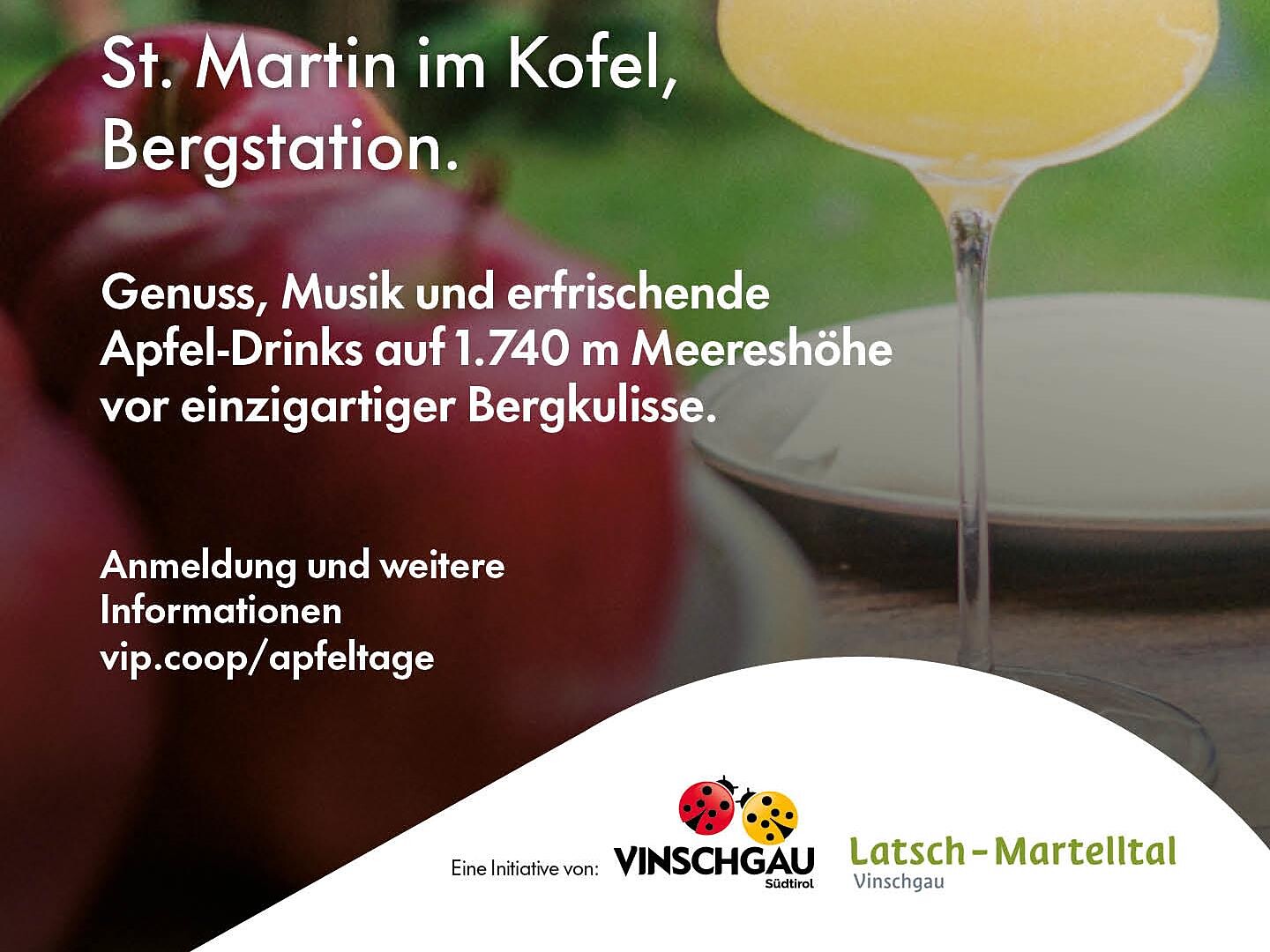 Immerse yourself in a special afternoon surrounded by the mountains of Val Venosta! At the apple aperitif at 1,740 meters above sea level, you can expect a mix of beats, music, delicious delicacies and cool drinks based on apples, surrounded by a breathtaking mountain panorama with with views of the Val Venosta apple orchards