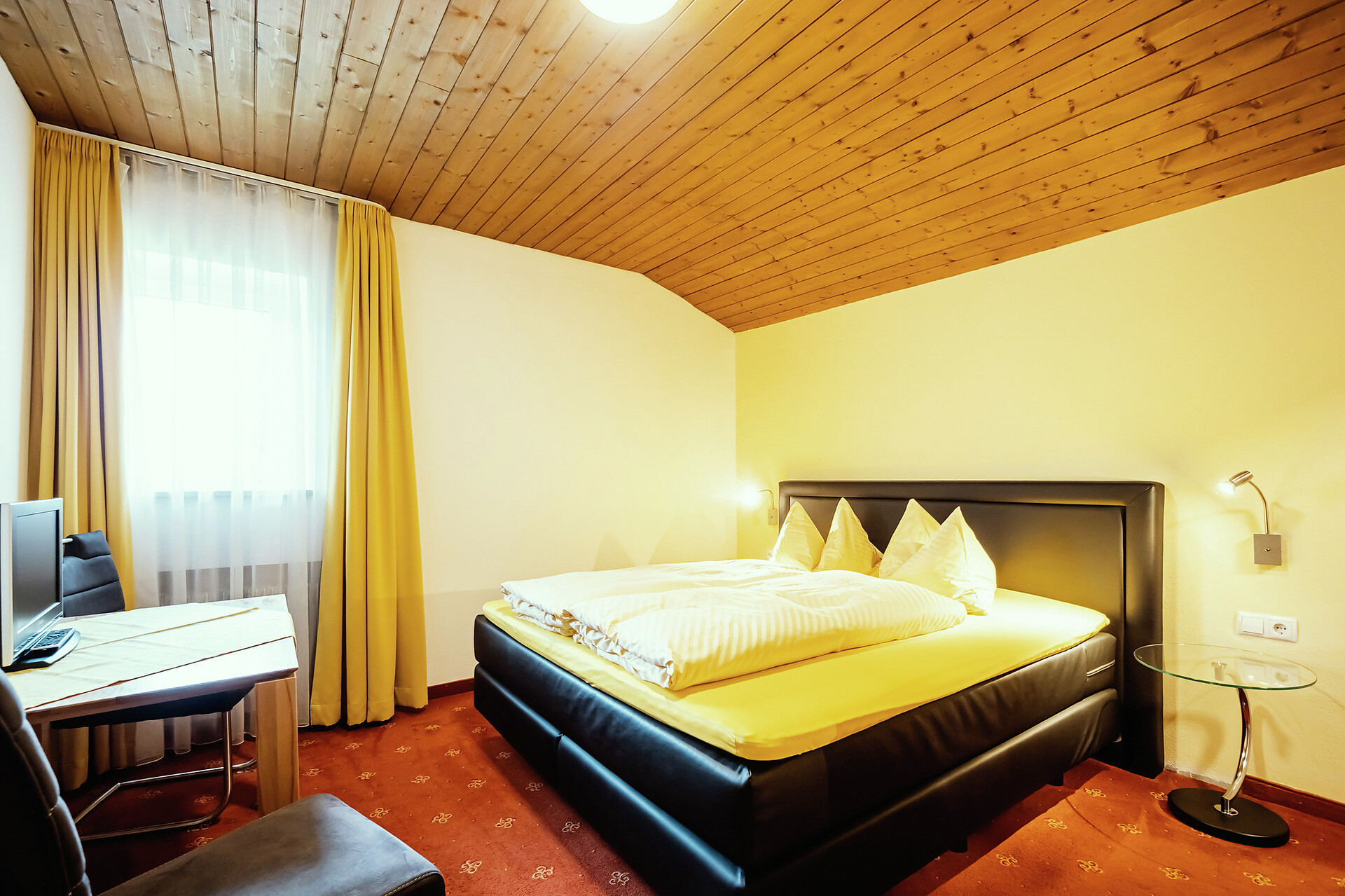 All of our double rooms are equipped with a cozy sitting corner, a flat screen TV, a telephone, bathroom with shower and WC and a hairdryer. From the third floor you can enjoy a gorgeous outlook to our garden, the mountains and the town. One of the rooms is located on the ground floor and therefore grants accessibility.