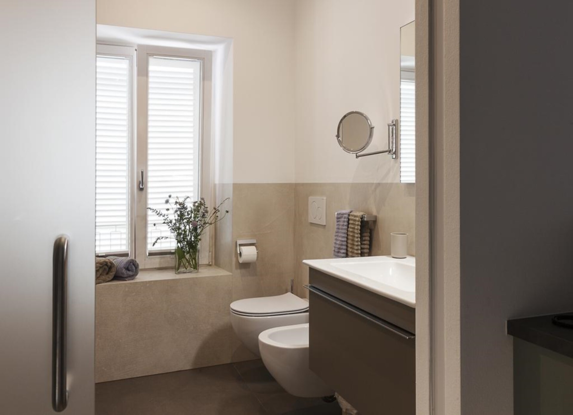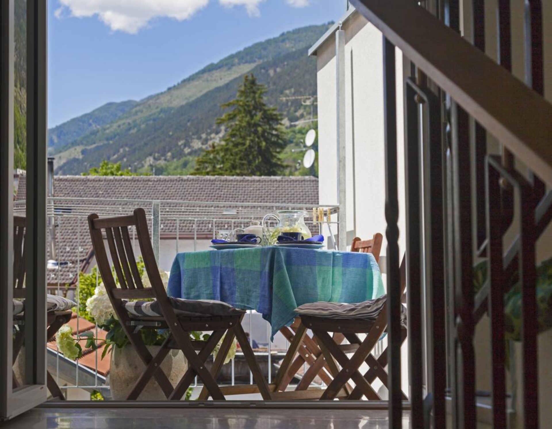Luxurious apartment in the center of Schlanders. The apartment is located on the 2nd floor in one of the oldest town houses of the village, which has been owned by my family since the 18th century and was renovated and modernized in 2018. The apartment consists of a spacious living room with a fully equipped kitchen, a dining table that can seat up to six people and two sofas that invite you to relax. The bedroom is accessible through a door from the living room. There is a comfortable double bed (180x200 cm), as well as sufficient storage space for your clothes, suitcase shelves, a large mirror and a work area with a desk. The two sofas in the living room can be converted into two single beds or one double bed. In the entrance area there is also a closet and a cloakroom. The bathroom has recently been completely renovated and is equipped with a rain shower, toilet, bidet, washstand with a drawer and a washing machine. The bathroom is flooded with light and has, like the rest of the apartment, floor-heating. Another feature is a small sun terrace, which faces west and is accessible via the staircase. On the terrace there is a table with four chairs and a parasol, as well as a po